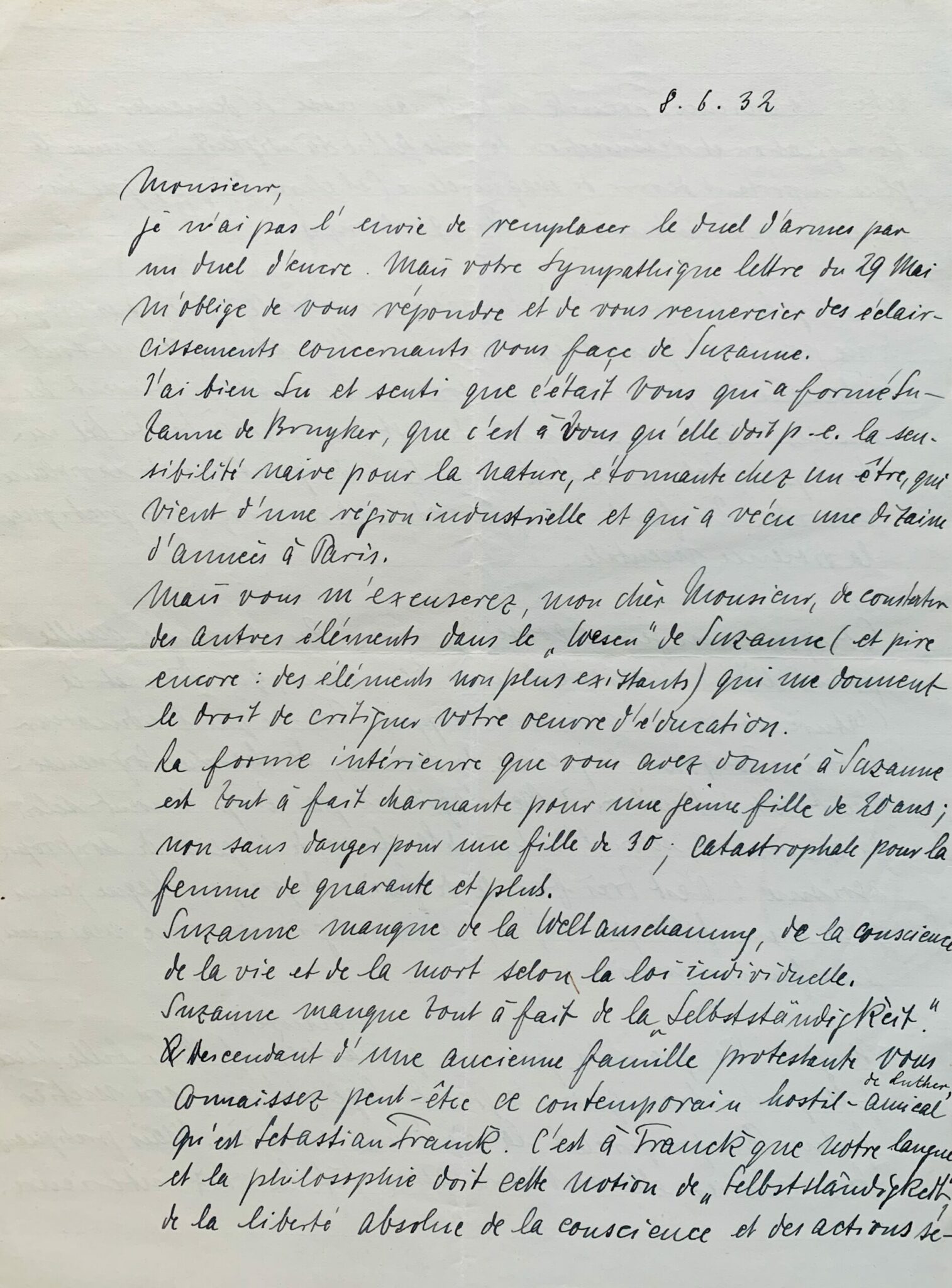 Dans cette lettre, il s'adresse à celui qui a fait l'éducation de Suzanne (dont on peut supposer qu'il s'agit de son père). "Je n'ai pas l'envie de remplacer le duel d'armes par un duel d'encre. Mais votre sympathique lettre du 29 mai m'oblige de vous répondre et de vous remercier des éclaircissements concernant vous face de Suzanne. J'ai bien su et senti que c'était vous qui a formé Suzanne de Bruyker, que c'est à vous qu'elle doit p. e. [par exemple] la sensibilité naïve pour la nature, étonnante chez un être, qui vient d'une région industrielle et qui a vécu une dizaine d'années à Paris.