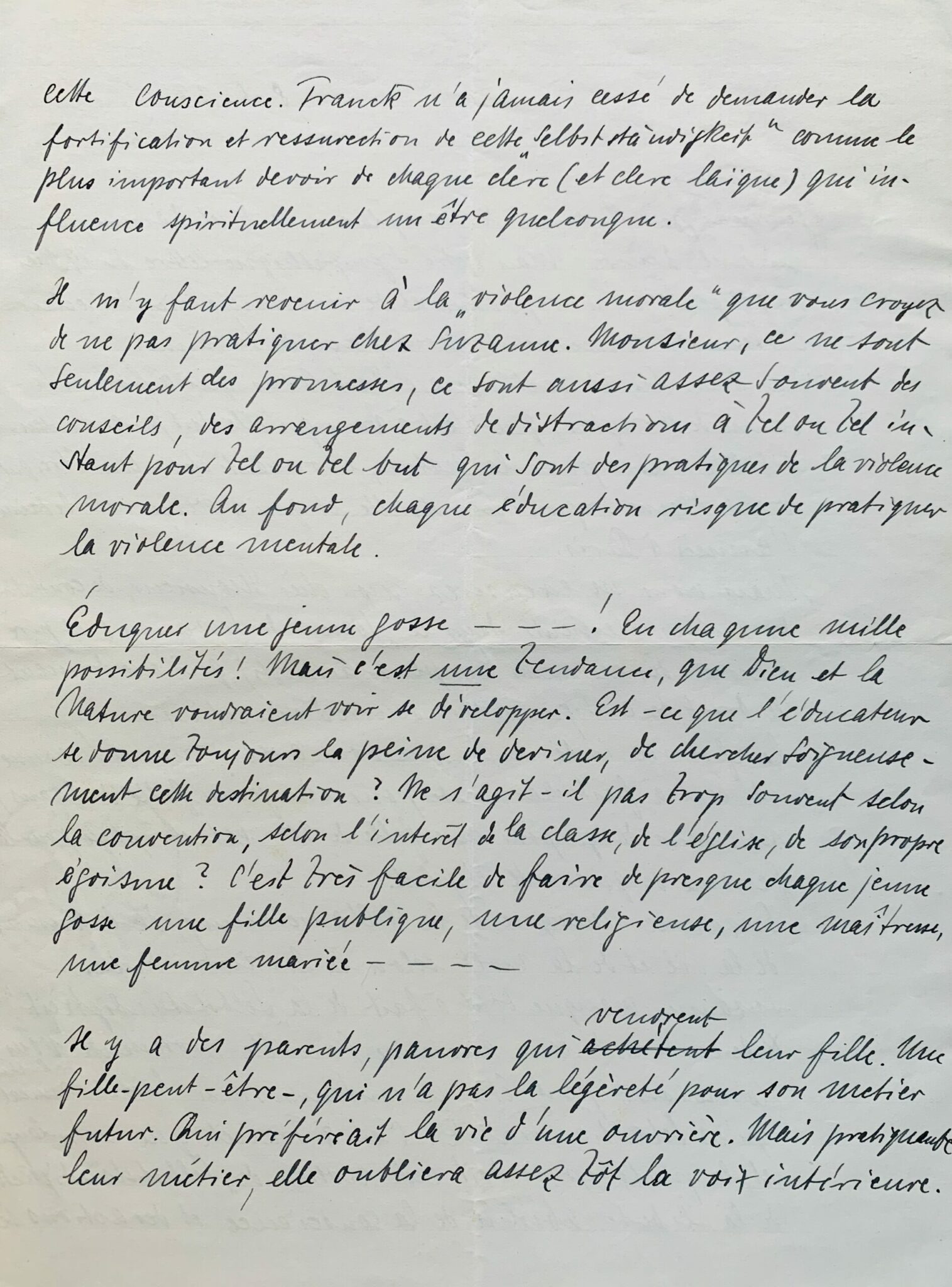 Mais vous m'excuserez, mon cher monsieur, de constater des autres éléments dans le "wesen" [l'essence] de Suzanne (et pire encore : des éléments non plus existants) qui me donnent le droit de critiquer votre oeuvre d'éducation. La forme intérieure que vous avez donnée à Suzanne est tout à fait charmante pour une jeune fille de 20 ans ; non sans danger pour une fille de 30 ; catastrophale [sic] pour la femme de quarante et plus.
