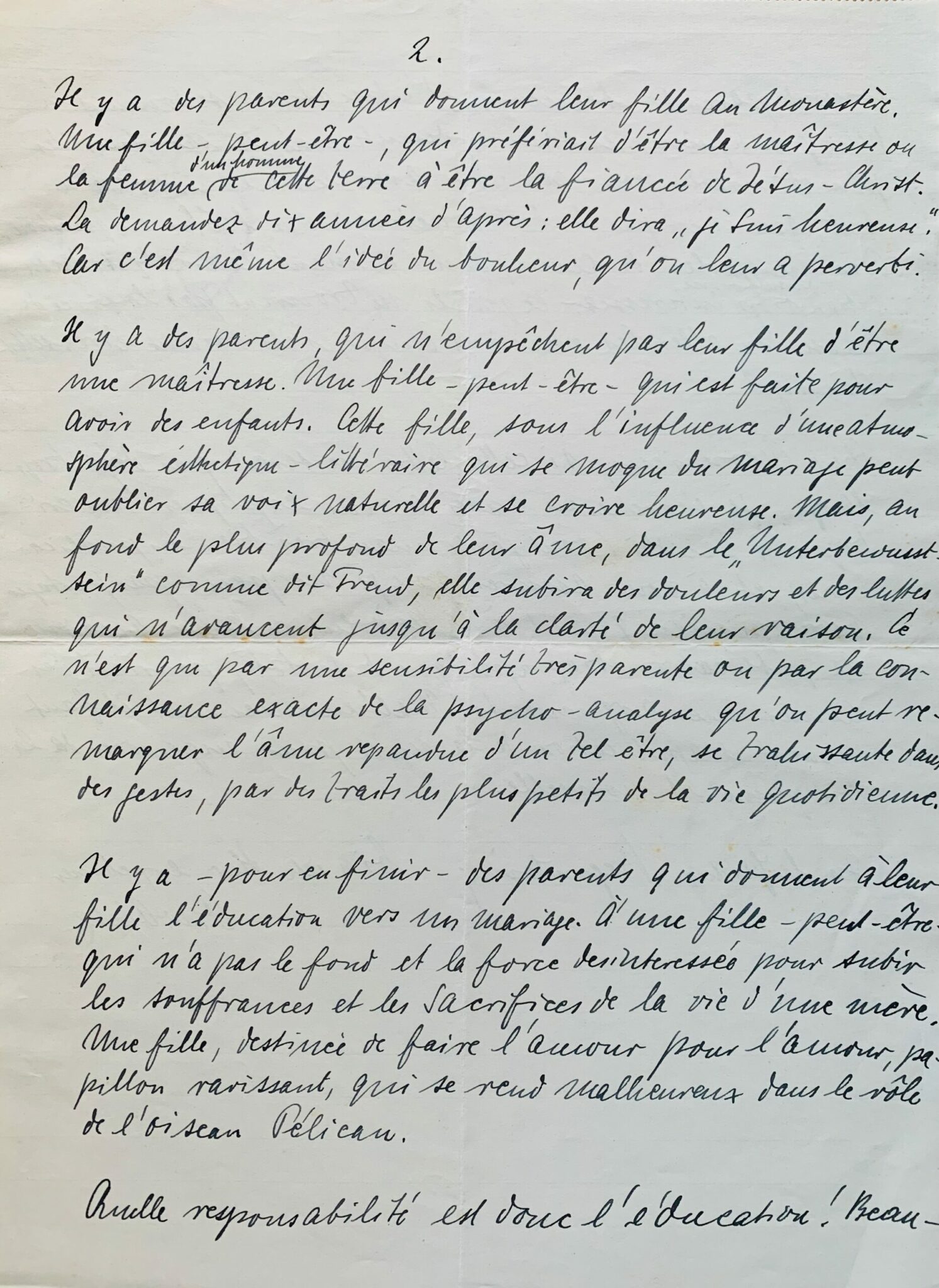 Il y a des parents qui n'empêchent pas leur fille d'être une maitresse. Une fille - peut-être - qui est faite pour avoir des enfants. Cette fille, sous l'influence d'une atmosphère esthétique - littéraire qui se moque du mariage peut oublier sa voix naturelle et se croire heureuse. Mais, au fond le plus profond de leur âme, dans le "unterbewusstsein" [subconscient] comme dit Freud, elle subira les douleurs et les luttes qui n'avancent jusqu'à la clarté de leur raison. Ce n'est que par une sensibilité très parente ou par la connaissance exacte de la psycho-analyse qu'on peut remarquer l'âme répandue d'un tel être, se trahissante dans des gestes, par des traits les plus petits de la vie quotidienne.