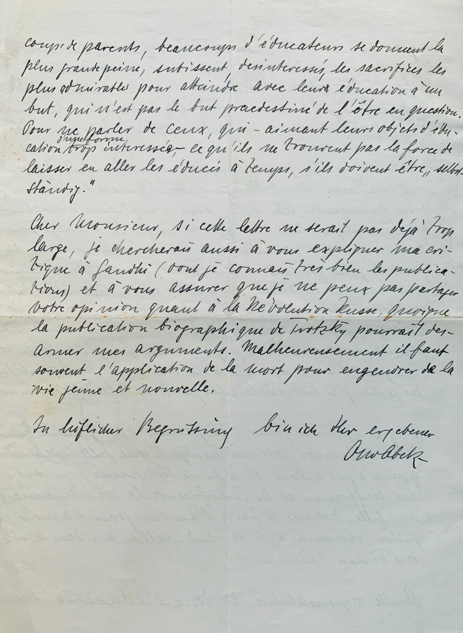 Cher monsieur, si cette lettre ne serait pas déjà trop large, je chercherais aussi à vous expliquer ma critique à Gandhi (dont je connais très bien les publications) et à vous assurer que je ne peux pas partager votre opinion quant à la Révolution Russe, quoique la publication biographique de Trotsky pourrait désarmer mes arguments. Malheureusement il faut souvent l'application de la mort pour engendrer de la vie jeune et nouvelle".