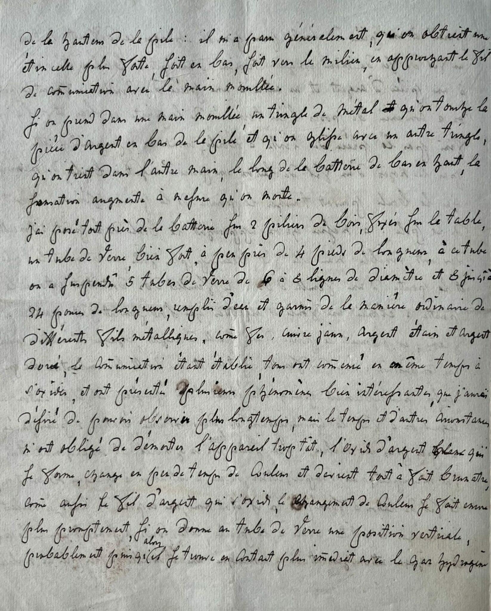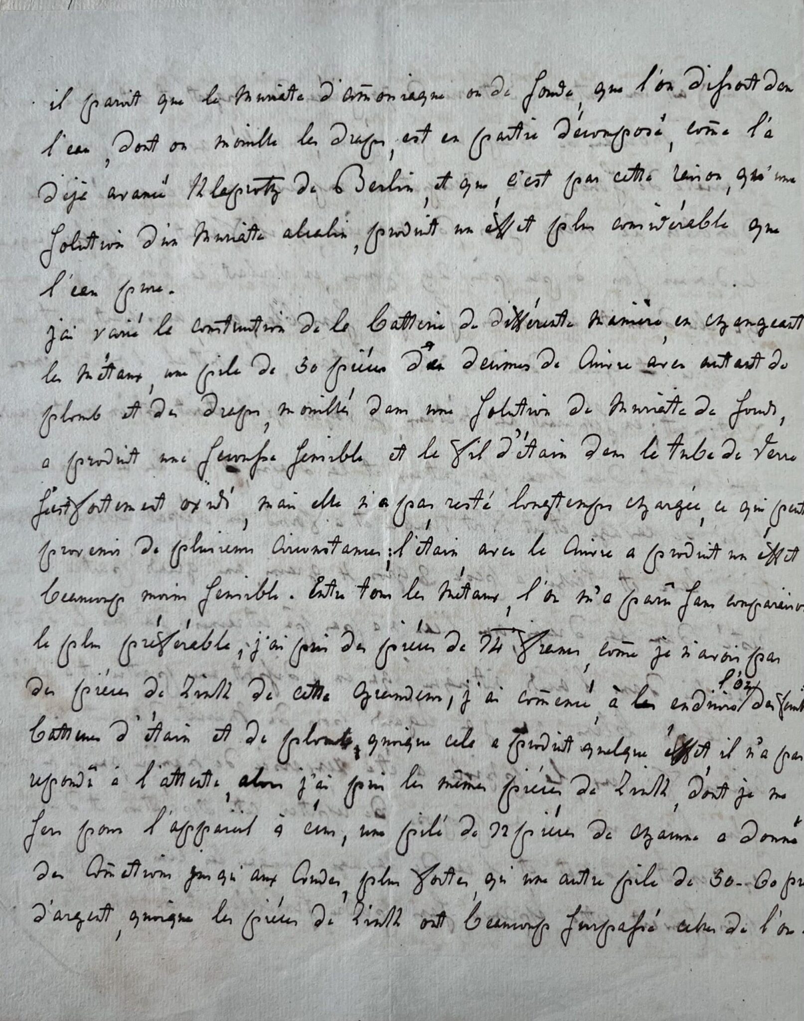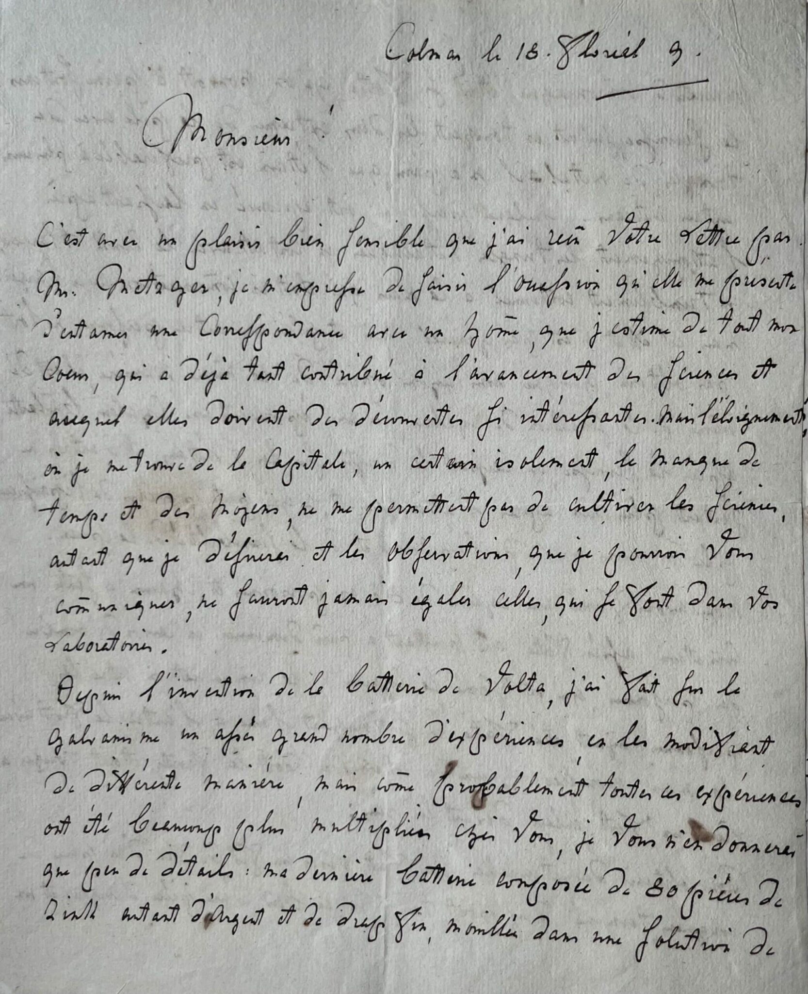 "Monsieur ! C’est avec un plaisir bien sensible que j’ai reçu votre lettre par M. Metzger, je m’empresse de saisir l’occasion qu’elle me présente d’entamer une correspondance avec un hom[m]e, que j’estime de tout mon cœur, qui a déjà tant contribué à l’avancement des sciences et auquel elles doivent des découvertes si intéressantes. Mais l'éloignement où je me trouve de la capitale, un certain isolement, le manque de temps et de moyens, ne me permettent pas de cultiver les sciences, autant que je désirerais et les observations que je pourrais vous communiquer, ne sauront jamais égales celles qui se font dans vos laboratoires. Depuis l’invention de la batterie de Volta, j’ai fait sur le galvanisme, un assés grand nombre d’expériences en les modifiant de différentes manières, mais com[m]e probablement toutes ces expériences ont été beaucoup plus multipliées chez vous, je vous n'en donnerai que peu de détails : ma dernière batterie composée de 80 pièces de zinc autant d’argent et de drap fin, mouillée dans une solution de nitrate d’Ammoniaque était si forte, qu'on pouvoit à peine soutenir la secousse, surtout en touchant les deux extrêmes de la pile avec des triangles de métal ; il m’a paru, que l’étain est préférable à plusieurs autres métaux. Quelques personnes ont éprouvé en laissant après l’attouchement les triangles métalliques en contact avec le zinc et l’argent un tremblement continuel à la main qui était en com[m]unication avec l’argent, mais cet effet n’est pas général, moi et plusieurs autres personnes ne l’ont pas obtenu, quoique nous aÿons opéré de la même manière [...]". Il décrit ensuite les sensations ressenties dans les doigts après ce contact, "qui peut provenir de l’épaisseur, plus ou moins grande de l’épiderme et de la sensibilité de la peau".