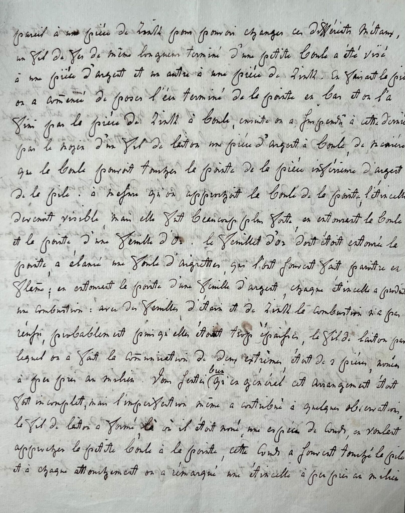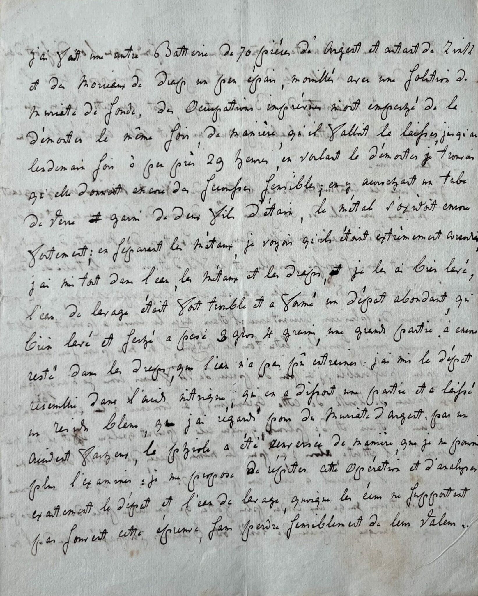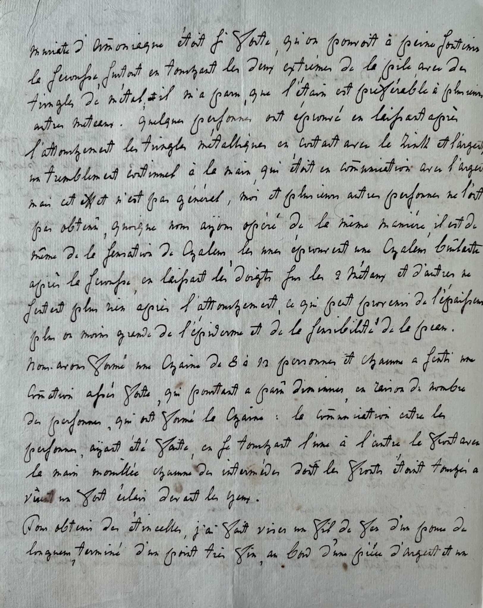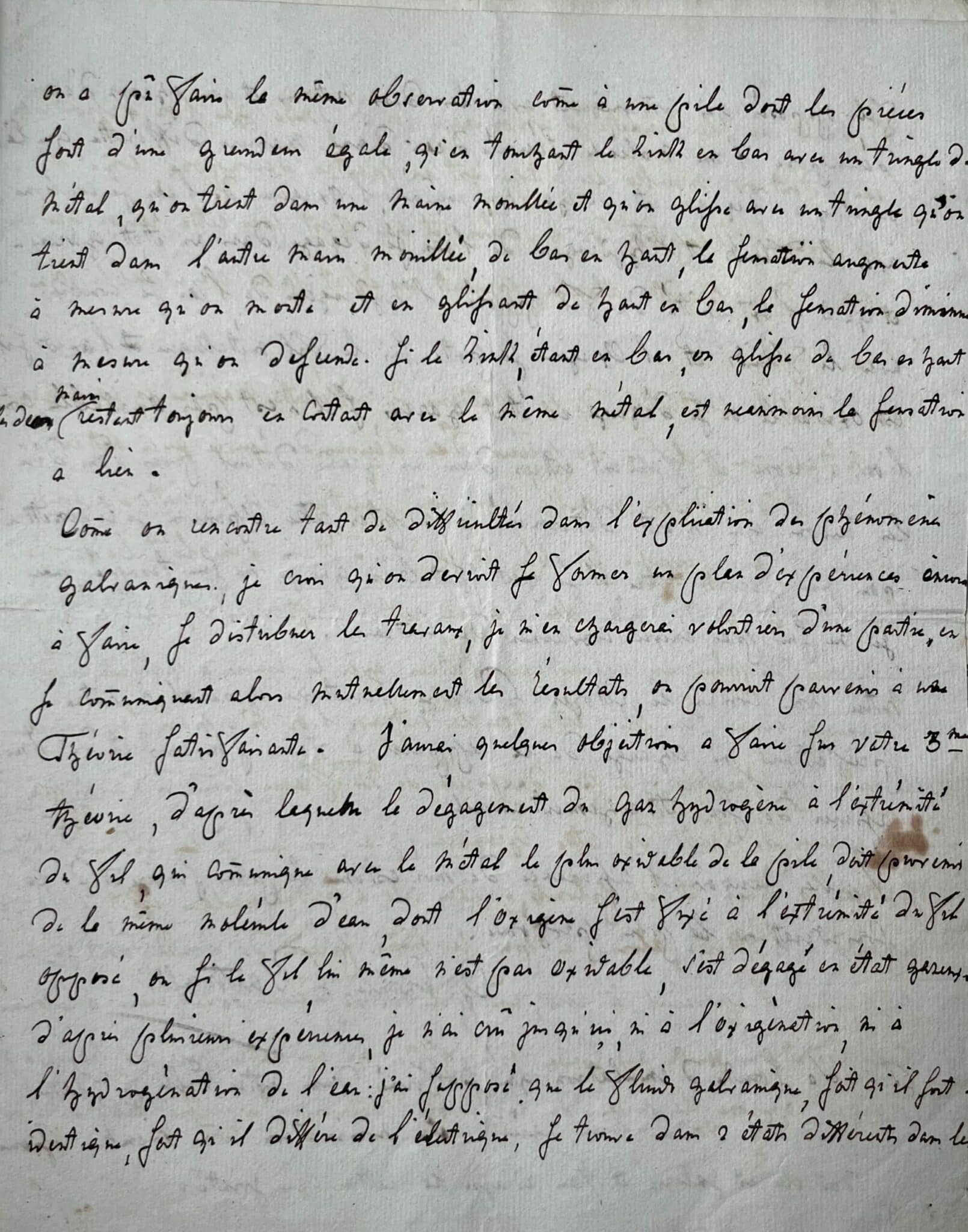"Monsieur ! C’est avec un plaisir bien sensible que j’ai reçu votre lettre par M. Metzger, je m’empresse de saisir l’occasion qu’elle me présente d’entamer une correspondance avec un hom[m]e, que j’estime de tout mon cœur, qui a déjà tant contribué à l’avancement des sciences et auquel elles doivent des découvertes si intéressantes. Mais l'éloignement où je me trouve de la capitale, un certain isolement, le manque de temps et de moyens, ne me permettent pas de cultiver les sciences, autant que je désirerais et les observations que je pourrais vous communiquer, ne sauront jamais égales celles qui se font dans vos laboratoires. Depuis l’invention de la batterie de Volta, j’ai fait sur le galvanisme, un assés grand nombre d’expériences en les modifiant de différentes manières, mais com[m]e probablement toutes ces expériences ont été beaucoup plus multipliées chez vous, je vous n'en donnerai que peu de détails : ma dernière batterie composée de 80 pièces de zinc autant d’argent et de drap fin, mouillée dans une solution de nitrate d’Ammoniaque était si forte, qu'on pouvoit à peine soutenir la secousse, surtout en touchant les deux extrêmes de la pile avec des triangles de métal ; il m’a paru, que l’étain est préférable à plusieurs autres métaux. Quelques personnes ont éprouvé en laissant après l’attouchement les triangles métalliques en contact avec le zinc et l’argent un tremblement continuel à la main qui était en com[m]unication avec l’argent, mais cet effet n’est pas général, moi et plusieurs autres personnes ne l’ont pas obtenu, quoique nous aÿons opéré de la même manière [...]". Il décrit ensuite les sensations ressenties dans les doigts après ce contact, "qui peut provenir de l’épaisseur, plus ou moins grande de l’épiderme et de la sensibilité de la peau".