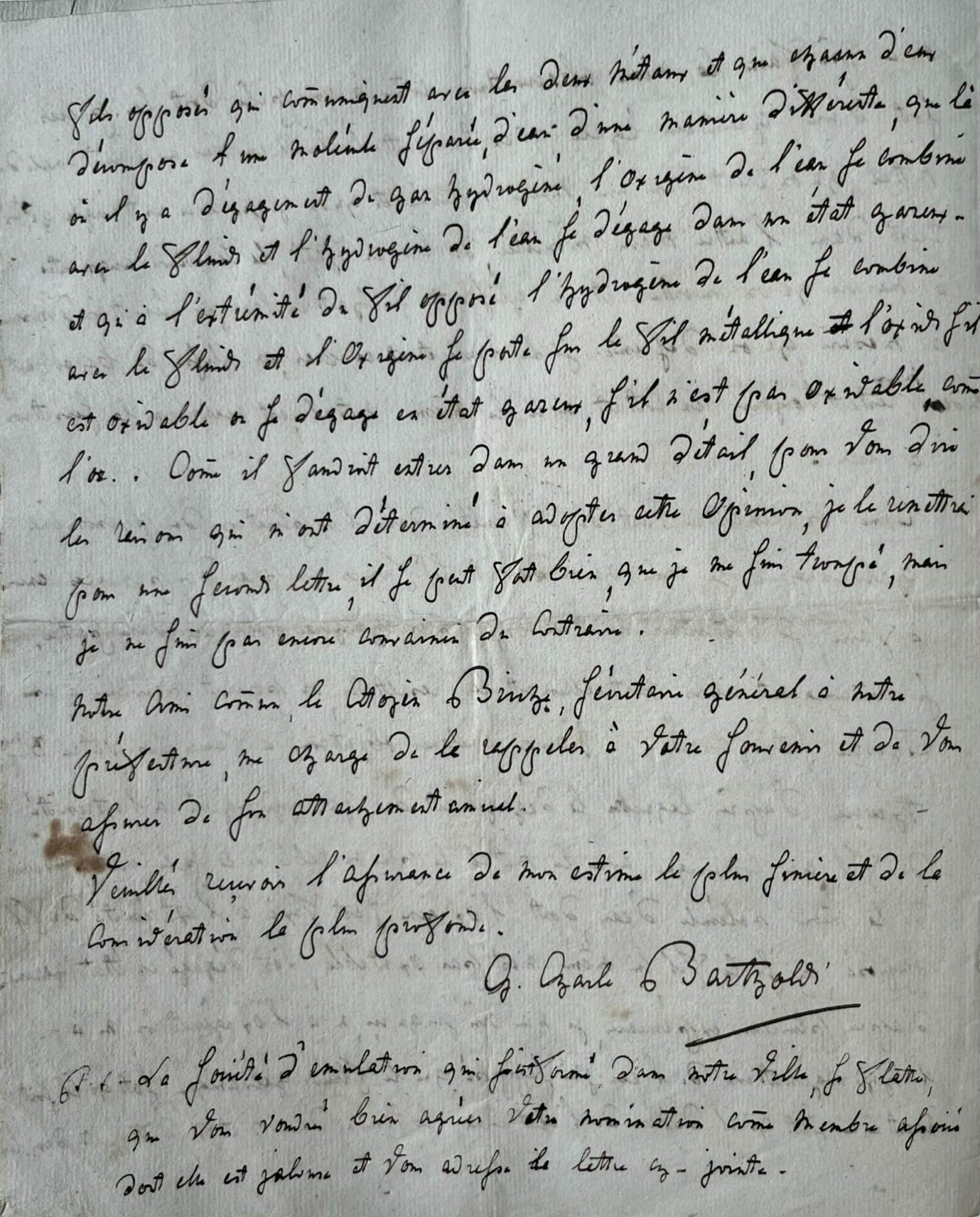 Georges-Charles Bartholdi (Oberbronn , 1762 /1849)Longue et très intéressante lettre scientifique du chimiste Georges-Charles Bartholdi, relative à l'invention de la batterie de Volta, à l'emploi de l'étain, de l'argent et des métaux permettant de produire une étincelle et stocker l'électricité ; il détaille ses essais de construction de différentes batteries.