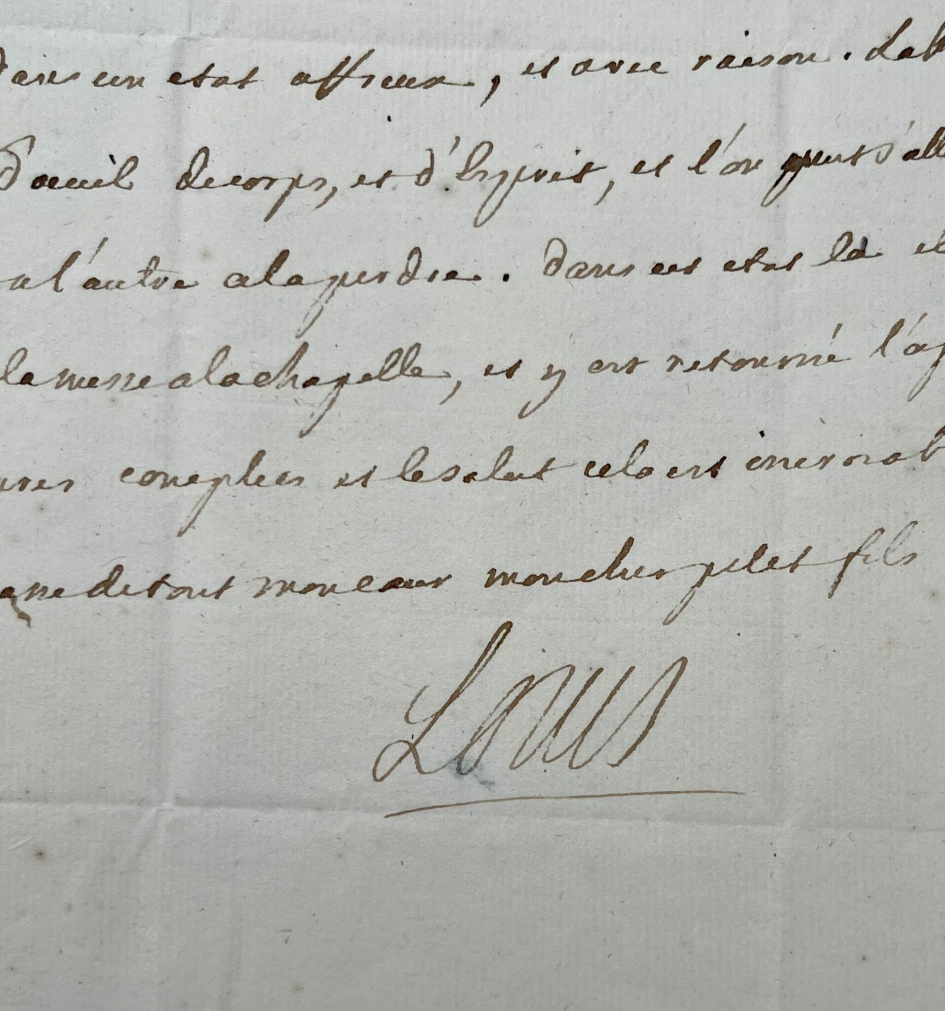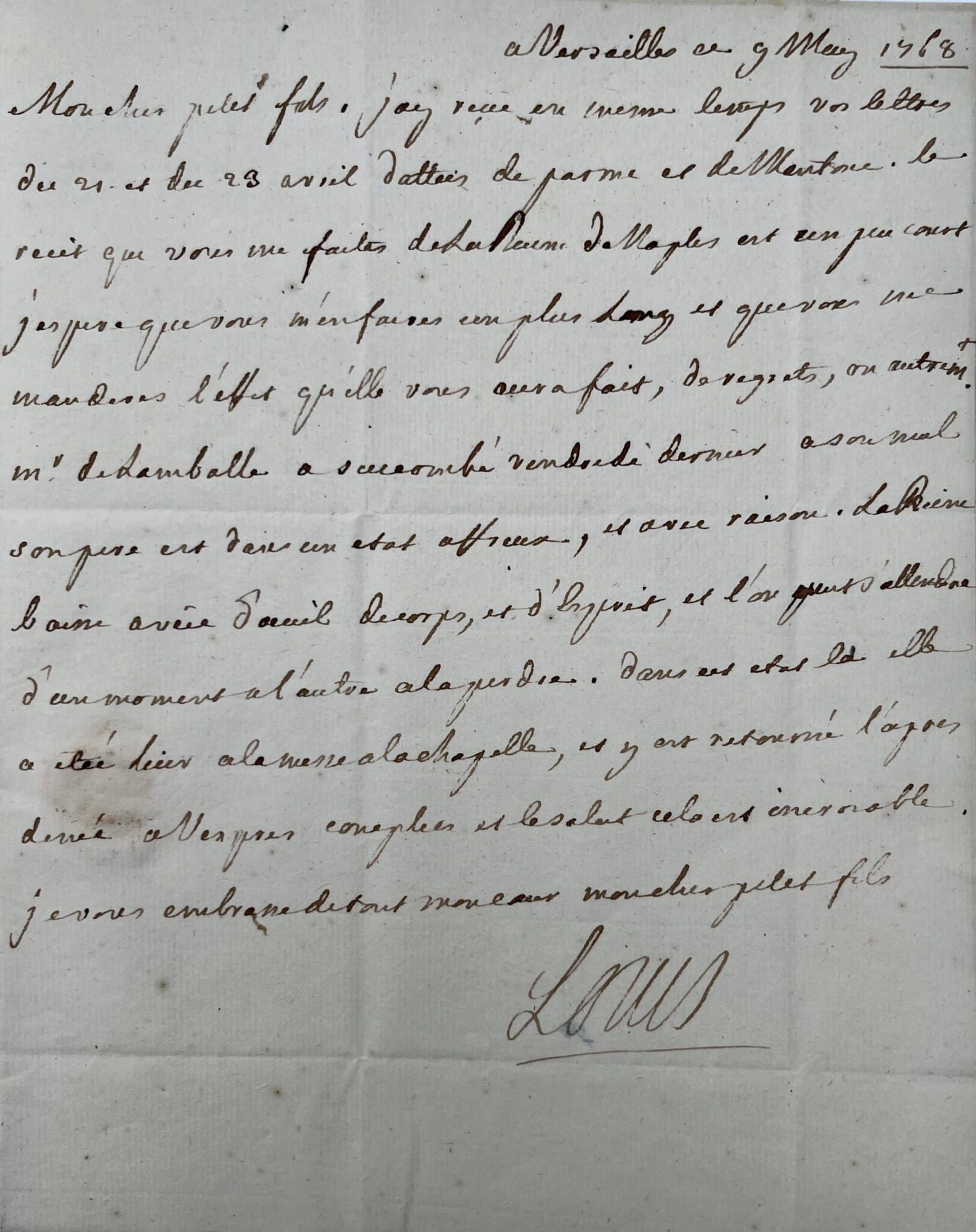 "Mon cher petit fils. J'ay reçu en même temps vos lettres du 21 et du 23 avril datées de Parme et de Mantoue. Le récit que vous me faites de la Reine de Naples est un peu court. J'espère que vous m'en fairez un plus long et que vous me manderez l'effet qu'elle vous aura fait, de regrets, ou autrement. Mr de Lamballe a succombé vendredi dernier à son mal. Son père est dans un état affreux, et avec raison. La reine baisse à veue d'oeuil de corps et d'esprit, et l'on peut s'attendre d'un moment à l'autre à la perdre. Dans cet état là elle a étée [sic] hier à la messe à la chapelle, et y est retournée l'après dinée [sic] à Vespres, complies et le salut, cela est incroiable. Je vous embrasse de tout mon coeur mon cher petit fils. Louis".
