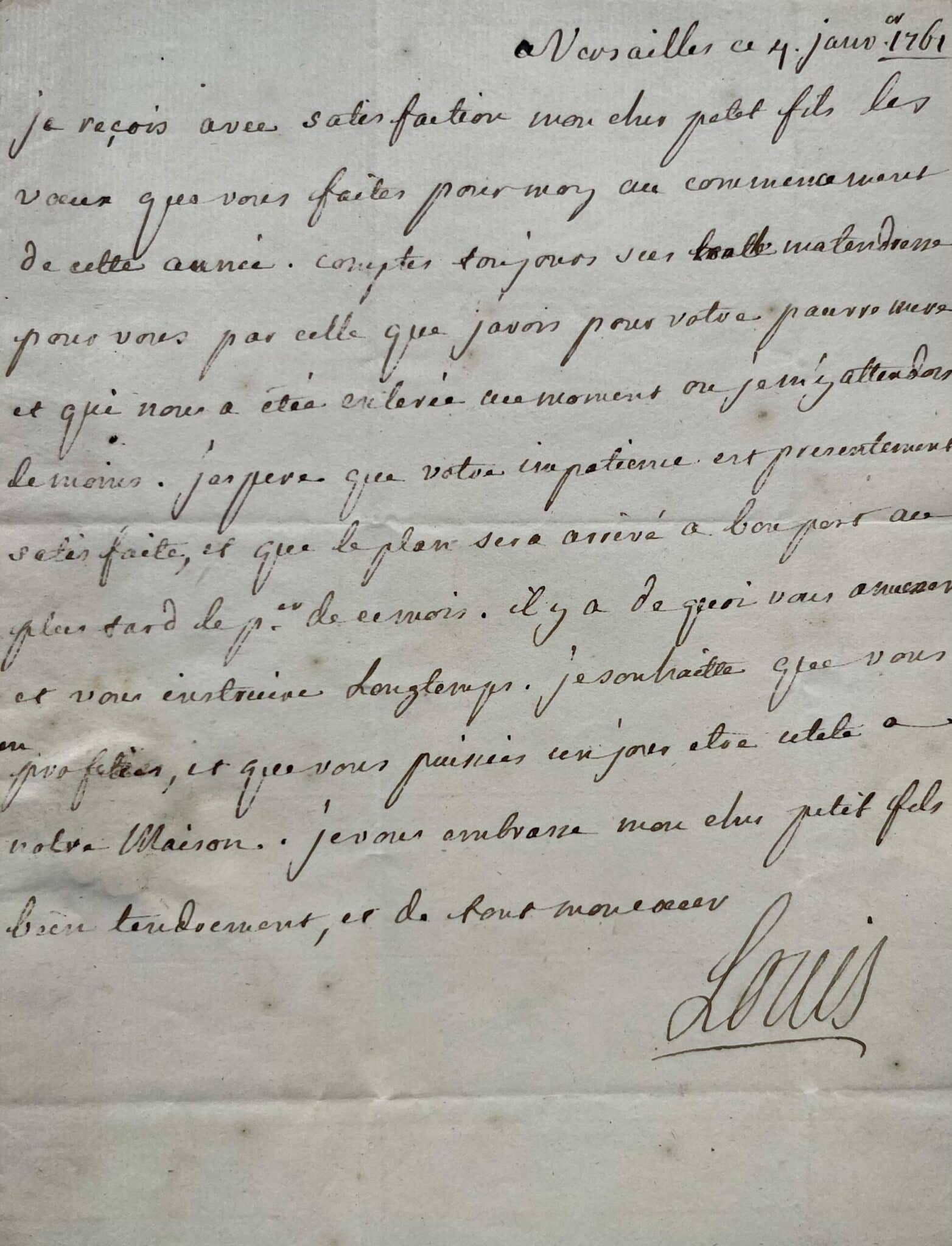 "Je reçois avec satisfaction mon cher petit fils les voeux que vous faites pour moy au commencement de cette année. Comptes toujours sur toute ma tendresse pour vous par celle que j'avois pour votre pauvre mère et qui nous a été enlevée au moment ou je m'y attendois le moins. J'espère que votre impatience est presentement satisfaite, et que le plan sera arrivé à bon port au plus tard le p[remi]er de ce mois. Il y a de quoi vous amuser et vous instruire longtemps. Je souhaite que vous en profitiés, et que vous puissiés un jour être utile à notre Maison. Je vous embrasse mon cher petit fils bien tendrement, et de tout mon coeur. Louis".