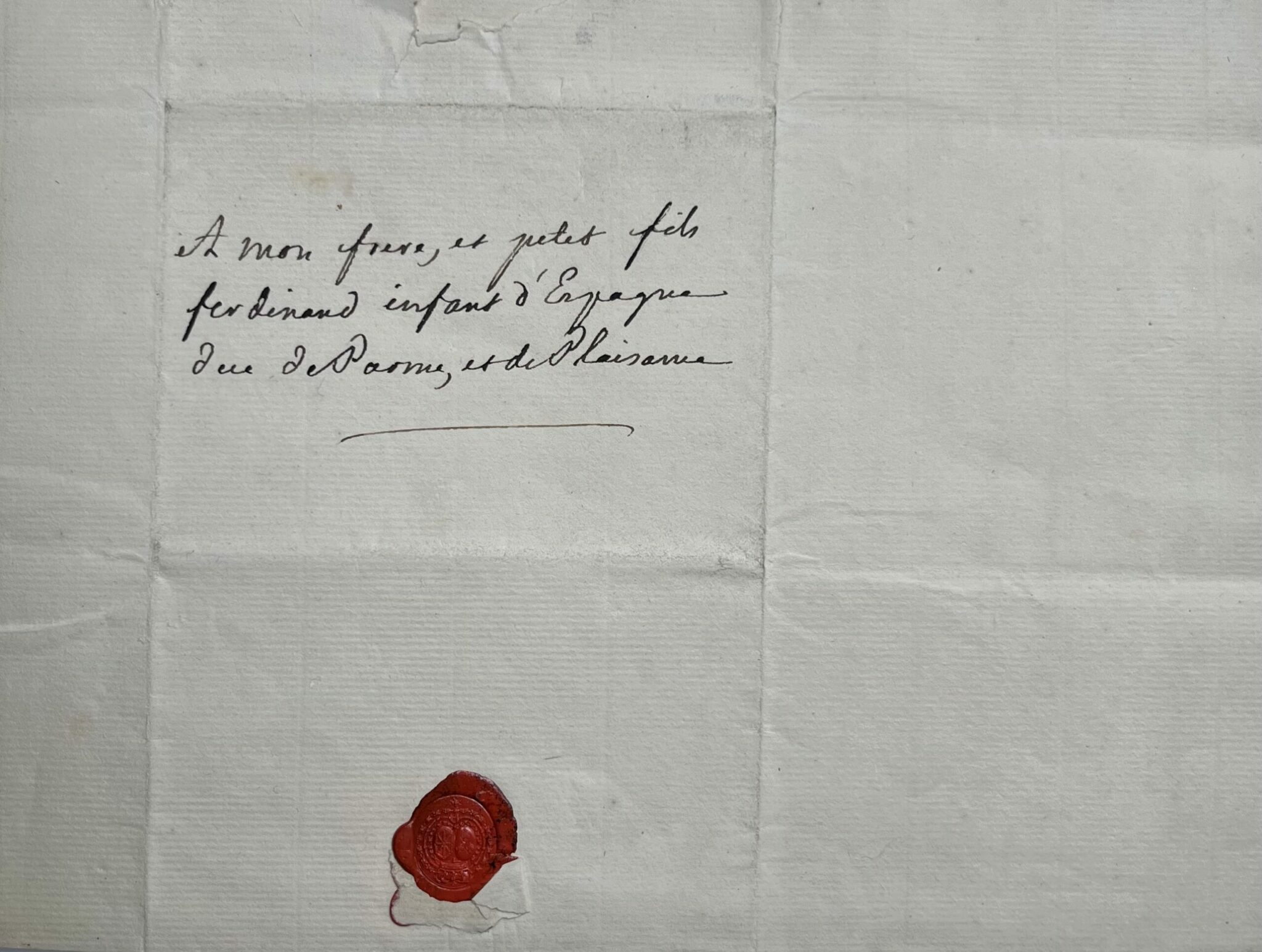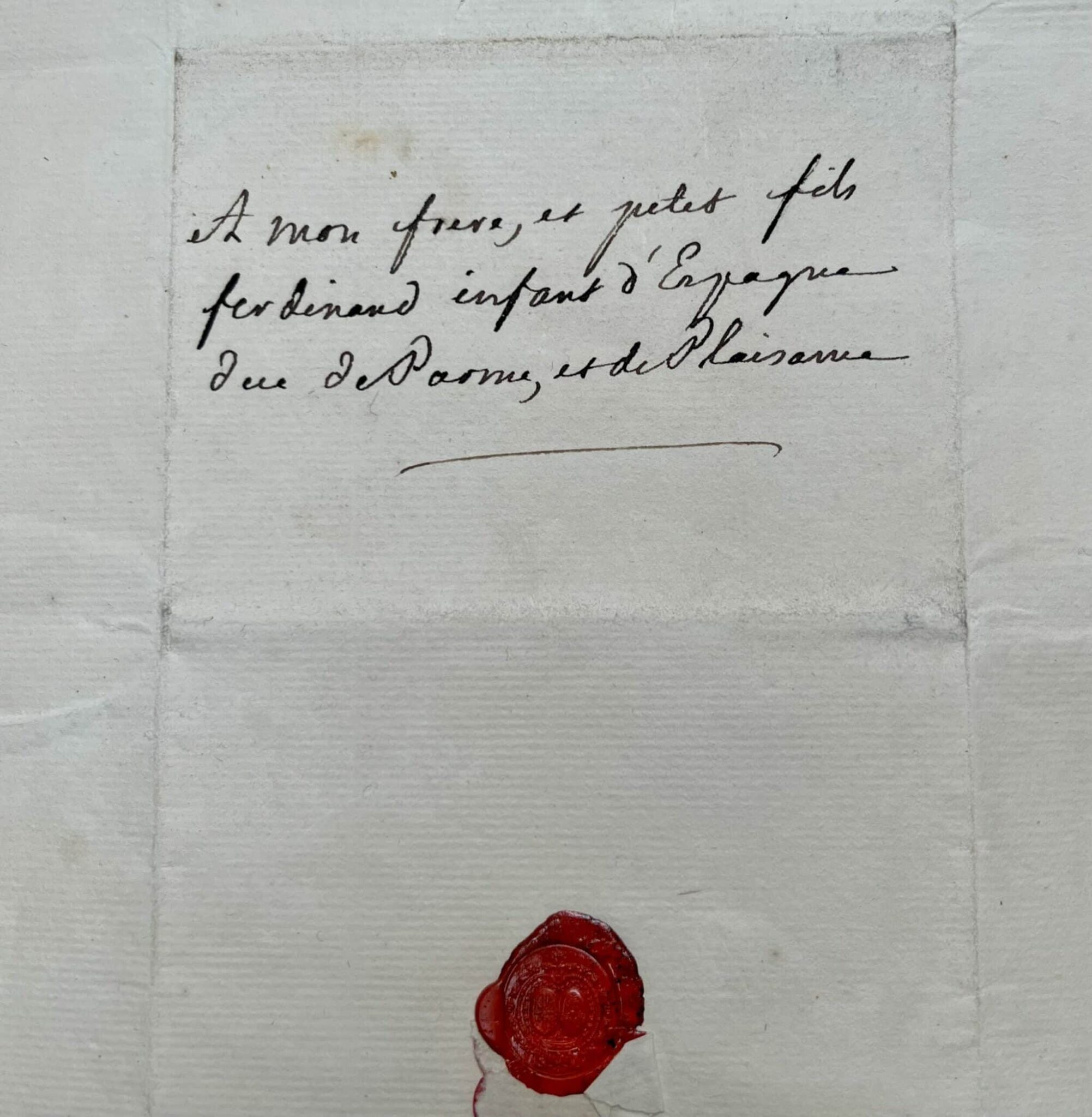 Louis XV (Versailles, 1710/1774)Touchante lettre intime de Louis XV, entièrement autographe, adressée à son petit-fils, Ferdinand 1er duc de Parme, fils de sa défunte fille aînée Louise-Elisabeth.