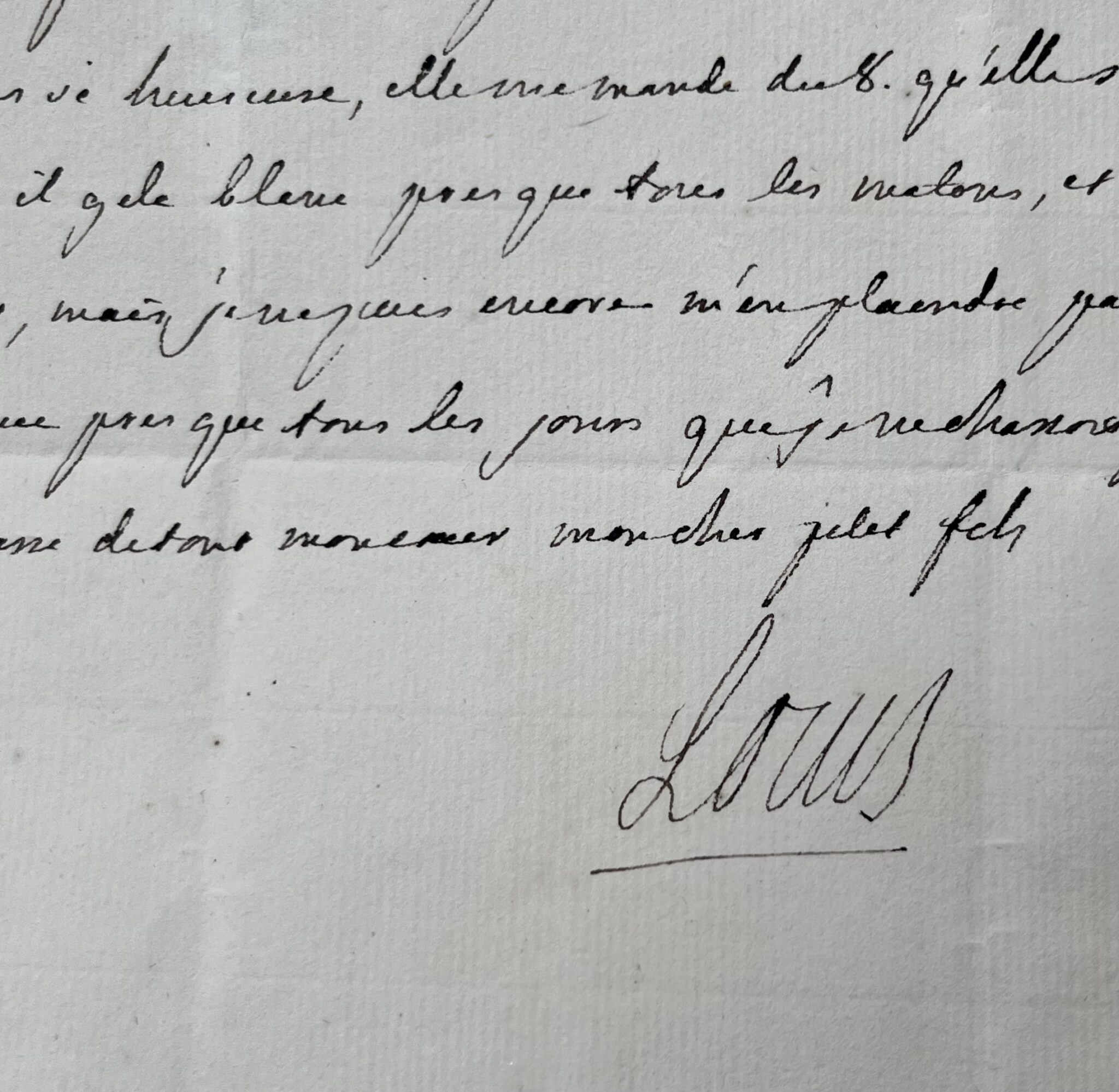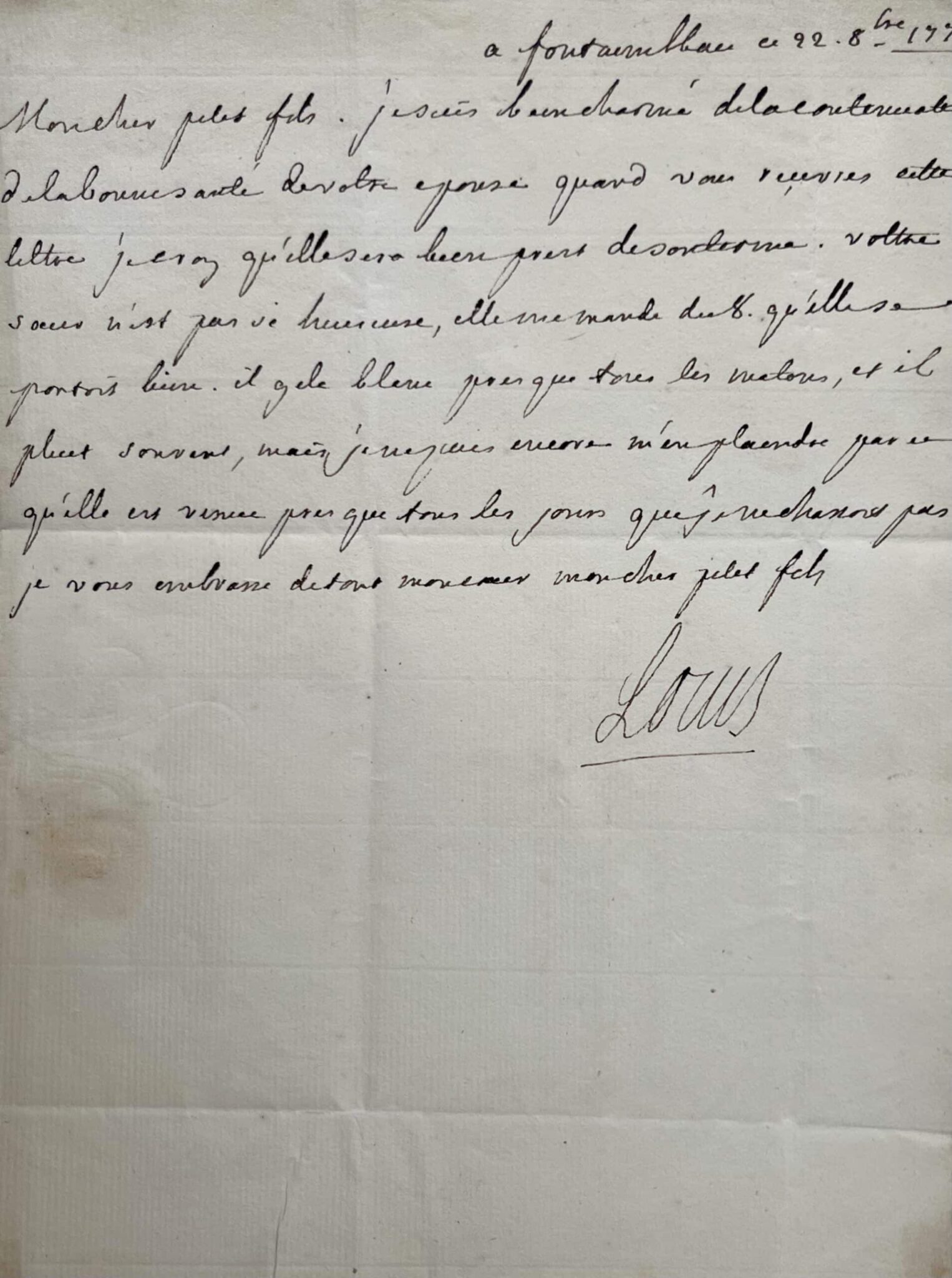 "Mon cher petit fils. Je suis bien charmé de la continuation de la bonne santé de votre épouse [Marie-Amélie d'Autriche] quand vous recevres cette lettre je crois qu'elle sera bien prest de son terme. Votre soeur n'est pas si heureuse [Marie Louise de Bourbon, princesse de Parme ( reine d'Espagne, qui n'aura son premier enfant qu'en 1775], elle me mande du 8 qu'elle se portoit bien. Il gèle blanc presque tous les matins, et il pleut souvent, mais je ne puis encore m'en plaindre par ce qu'elle est venue presque tous les jours que je ne chassois pas. Je vous embrasse de tout mon coeur mon cher petit fils. Louis".