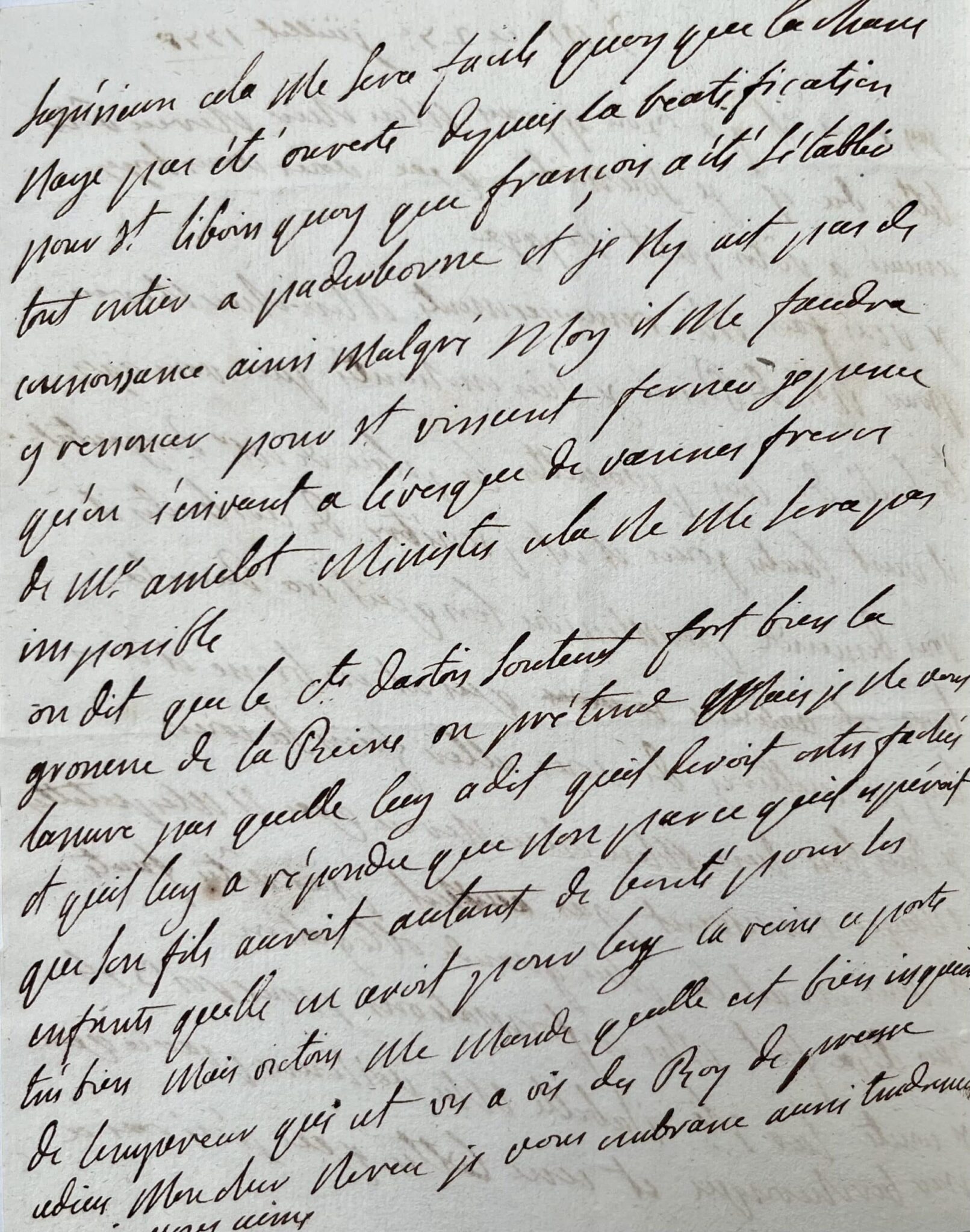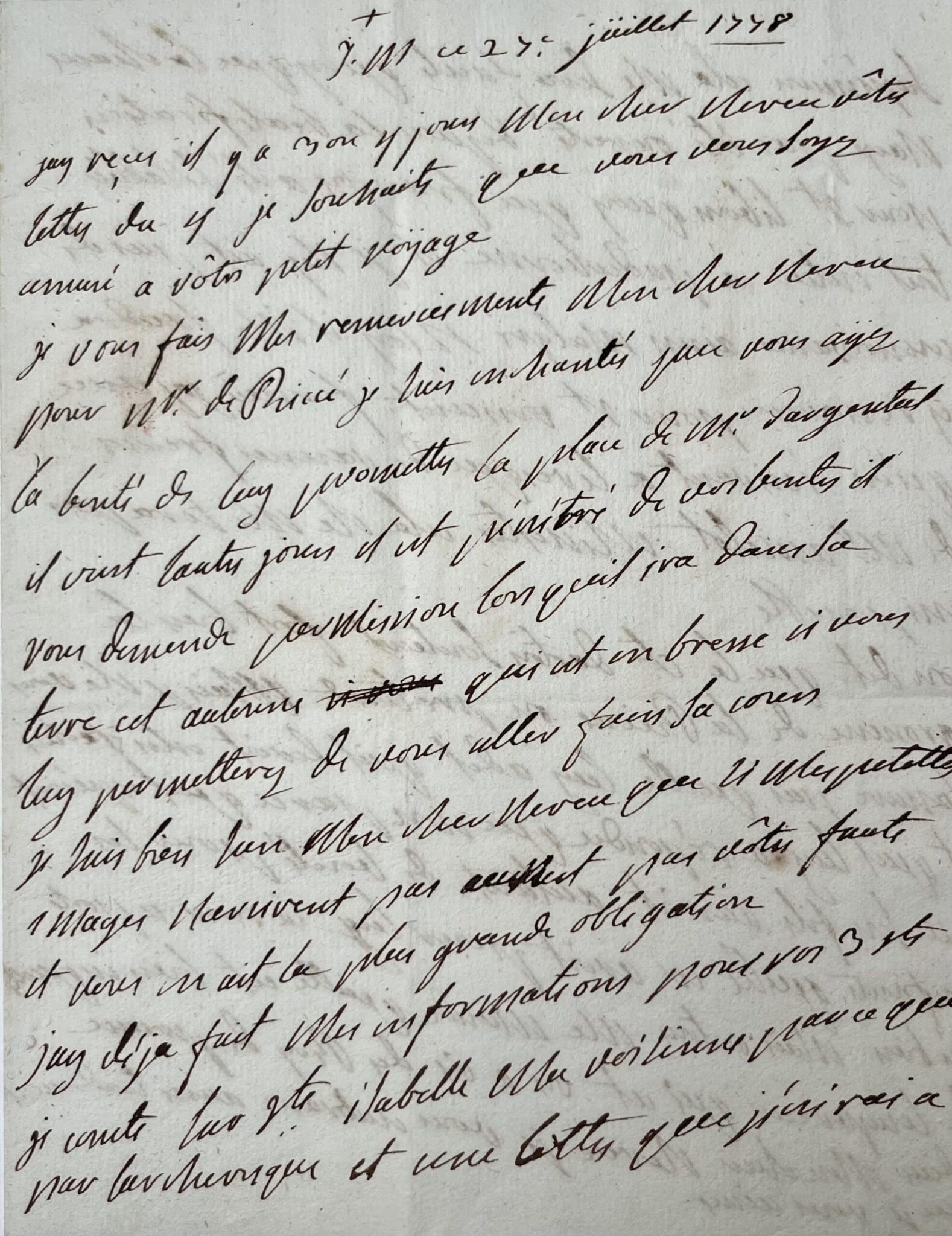 "Jay reçu il y a 3 ou 4 jours mon cher neveu vôtre lettre du 4 je souhaite que vous vous soyez amusé à vôtre petit voÿage. Je vous fais mes remerciements mon cher neveu pour Mr de Ricci je suis enchantée que vous ayez la bonté de luy promettre la place de Mr d'Argental. Il vint l'autre jour il est pénétré de vos bontés il vous demande permission lorsqu'il ira dans sa terre cet autonne qui est en Bresse si vous luy permettrez de vous aller faire sa cour. Je suis bien sure Mon cher Neveu que si mes petites images n'arrivent pas ce n'est par vôtre faute et vous en ait la plus grande obligation. Jay déjà fait mes informations pour vos 3 Srs et je comte sur Sre Isabelle ma voisine parce que par l'archevesque et une lettre que j'écrirai a [la] supérieure cela me sera facile quoi que la chasse naye pas été ouverte depuis la béatification pour St Liboire quoi que françois a été s'établir tout entier à Paderborn [en Allemagne, ville dont Saint-Liboire est le patron] et je n'y ait pas de connoissance ainsi malgré moy il me faudra y renoncer pour St Vincent Ferrier je pense qu'on écrivant a l'evesque de Vannes [où une partie de ses reliques sont conservées] frère de Mr Amelot ministre cela ne me sera pas impossible.