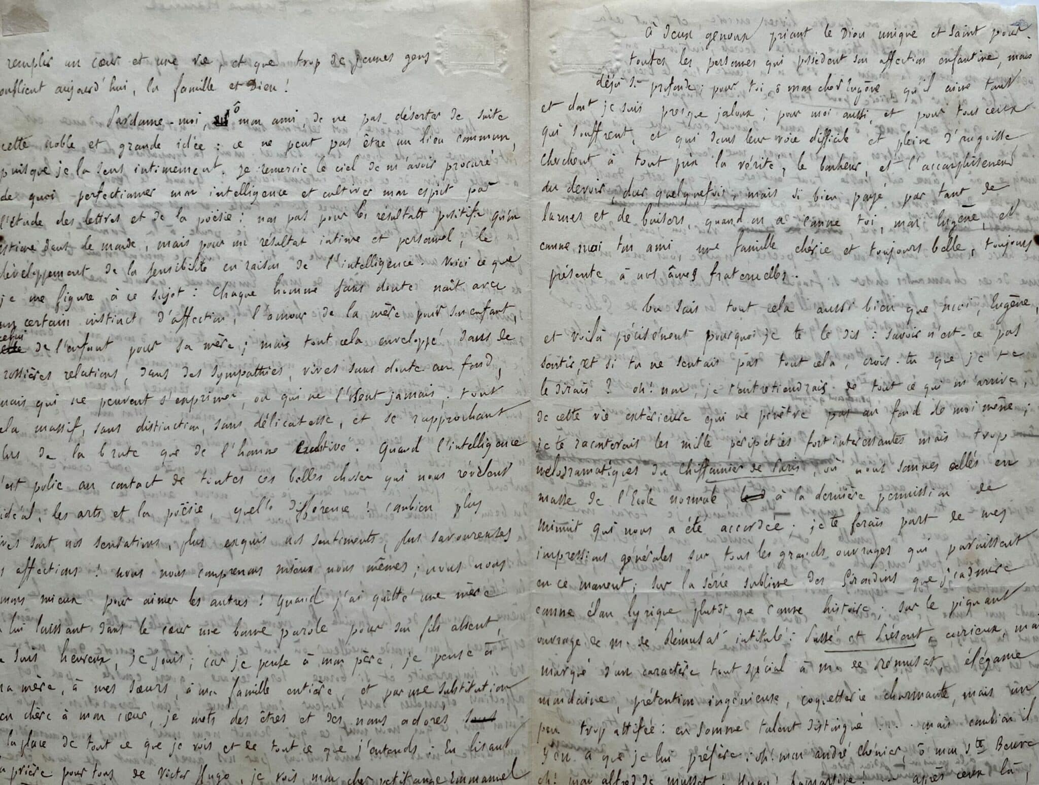 "Mon cher Eugène, nos relations sont rares, notre correspondance est interrompue par de bien longs silences ; mais la sympathie de deux âmes a-t-elle besoin de ce grossier intermédiaire. Quand le front penché sur ma main, ma main appuyée sur la table, et mes yeux fixés à travers la fenêtre sur le fond bleu du ciel, je pense à la famille, ne faut-il pas aussi que je pense à toi ? Puis-je maintenant te séparer de mon père, de ma mère, de mon Emmanuel, quand mes pensées s’envolent là-bas ? Quand je fais le tableau de la famille assemblée dans les longues et douces heures du soir, je te vois, ô mon ami, comme je t’ai vu souvent à la fin de mes dernières vacances, accoudé sur la laide et gothique cheminée, centre de mes rêveries adorées ; je te vois comme si j’étais là te serrant la main. Mon ami, je te remercie de me remplacer si bien à la maison ; ma place au moins n’est pas vide, et en t'entendant parler, ma mère peut croire qu’elle entend son fils ; car tous les deux, je crois, nous avons le même culte du beau, le même enthousiasme pour tout ce qui est noble est grand, la même adoration de l’idéal, dans les petites comme dans les grandes choses, dans les relations de famille, comme dans la vie active, dans la littérature, et dans la poésie. N’avons-nous pas tous deux le même amour de la famille, la même culture intellectuelle, les mêmes espérances d’un monde meilleur où tout ce qui souffre encore dans notre vie si imparfaite et si bornée, sera réparé, guéri, consolé, par des affections éternelles sans douleur, sans absence, sans séparation. Voilà ô mon ami, ce qui nous unit, ce qui devait nous unir. Nous nous connaissions sans doute, nous nous embrassions par nos âmes avant de nous être vus ; car tous les deux nous adorons deux choses bien suffisantes pour remplir un cœur et une vie, et que trop de jeunes gens oublient aujourd’hui, la famille et Dieu ! [...]. Je remercie le ciel de m’avoir procuré de quoi perfectionner mon intelligence et cultiver mon esprit par l’étude des lettres, de la poésie ; non pas pour les résultats positifs qu’on estime dans le monde, mais pour un résultat intime et personnel, le développement de la sensibilité en raison de l’intelligence. Voici ce que je me figure à ce sujet : chaque homme sans doute né avec un certain instinct d'affection, l’amour de la mère pour son enfant, celui de l’enfant pour sa mère ; mais tout cela enveloppé dans de grossières relations, dans des sympathies, vives sans doute au fond, mais qui ne peuvent s’exprimer, ou qui ne l'osent jamais. Tout cela massif, sans distinction, sans délicatesse, et se rapprochant plus de la brute que de l’homme cultivé. Quand l’intelligence, s’est polie au contact de toutes ces belles choses qui nous révèlent l’idéal, les arts et la poésie, quelle différence ! Combien plus vives sont nos sensations, plus exquis nos sentiments, plus savoureuses nos affections ! Nous nous comprenons mieux nous-mêmes ; nous nous aimons mieux pour aimer les autres ! Quand j’ai quitté une mère en lui laissant dans le cœur une bonne parole pour son fils absent, je suis heureux, je jouis, car je pense à mon père, je pense à ma mère, à mes sœurs, à ma famille entière, et par une substitution bien chère à mon cœur, je mets des êtres et des noms adorés à la face de tout ce que je vois et de tout ce que j’entends. En lisant la Prière pour tous de Victor Hugo, je vois mon cher petit ange Emmanuel à deux genoux priant le Dieu unique et Saint pour toutes les personnes qui possèdent son affection enfantine, mais déjà si profonde ; pour toi, ô mon cher Eugène qui aime tant, et dont je suis presque jaloux ; pour moi aussi, et pour tous ceux qui souffrent [...]".