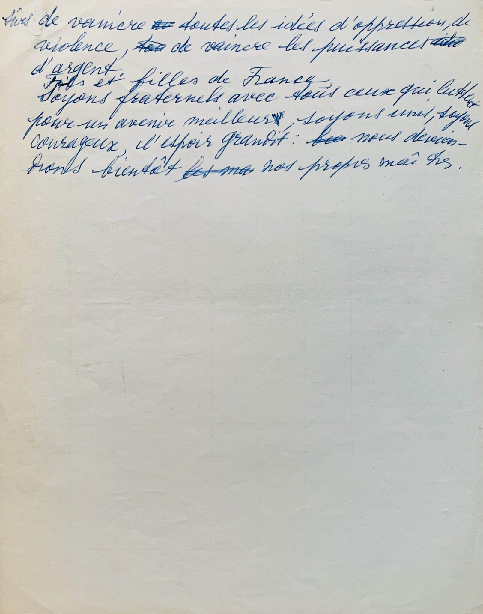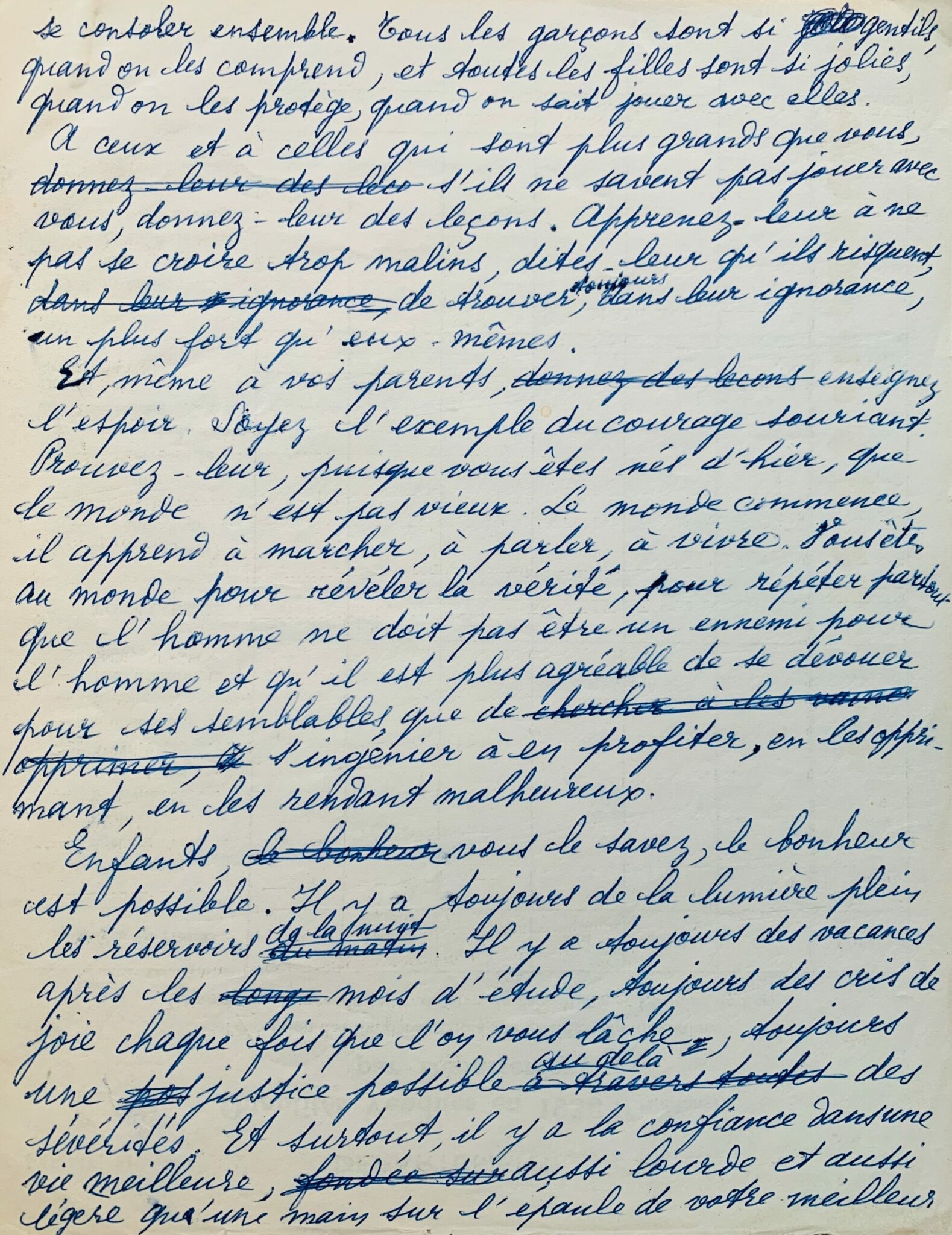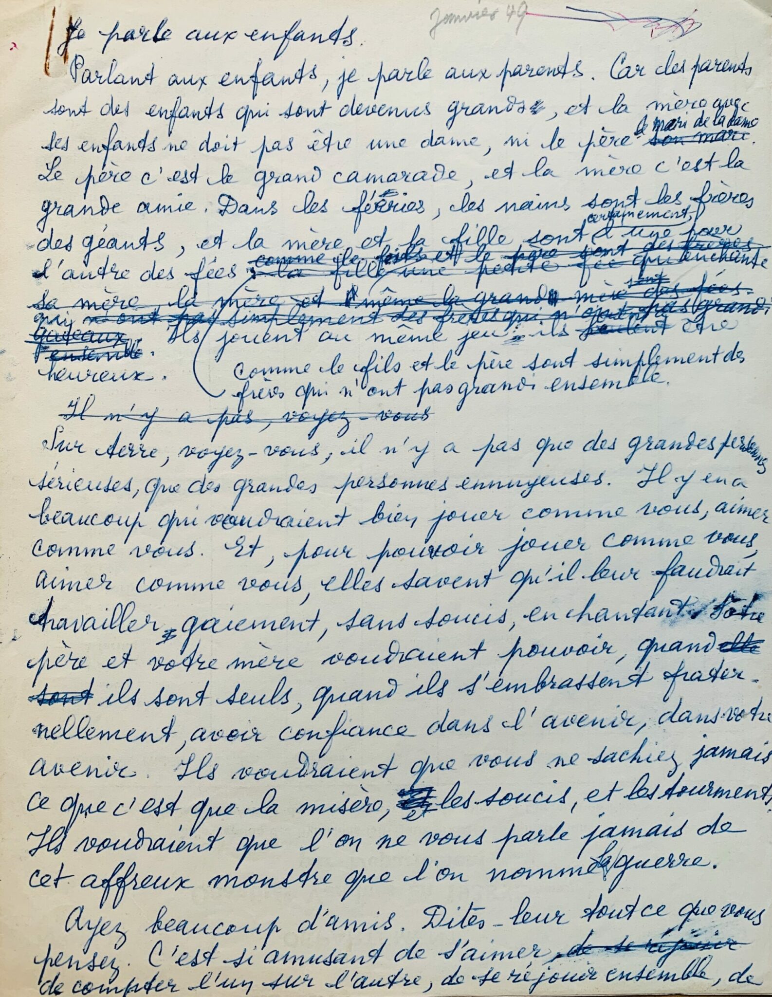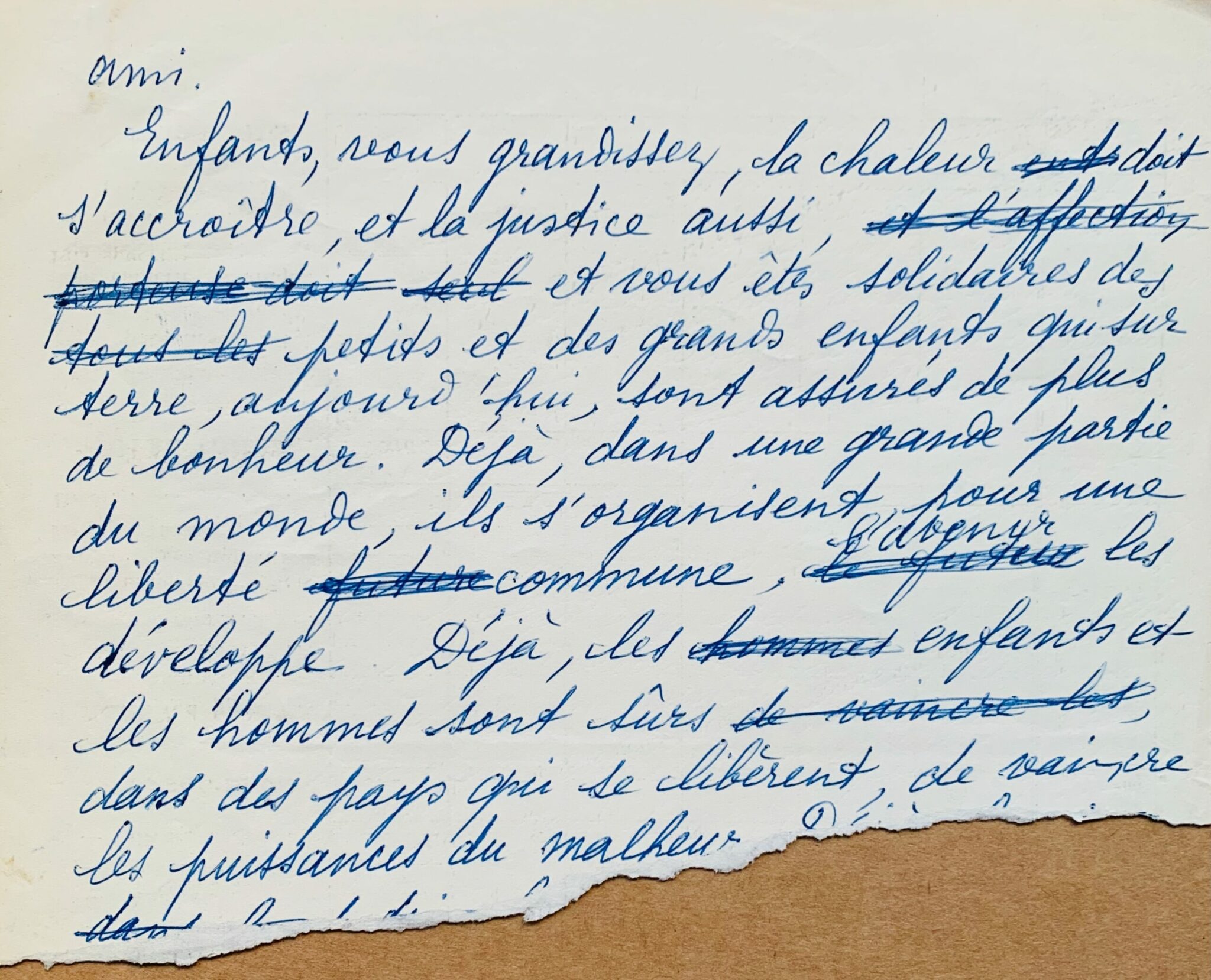 Manuscrit d’une allocution de Paul Eluard exhortant les enfants à l’amitié, à la fraternité et à la tolérence