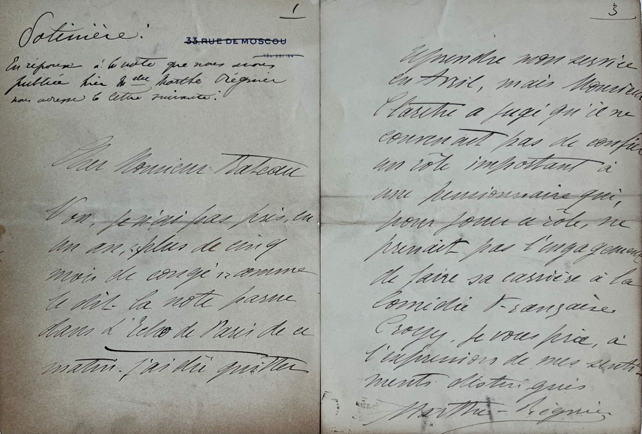 Marthe Régnier (Paris, 1880 /1967 )Marthe Régnier répond à un article critique sur ses absences de la Comédie française, paru dans l'Echo de Paris.