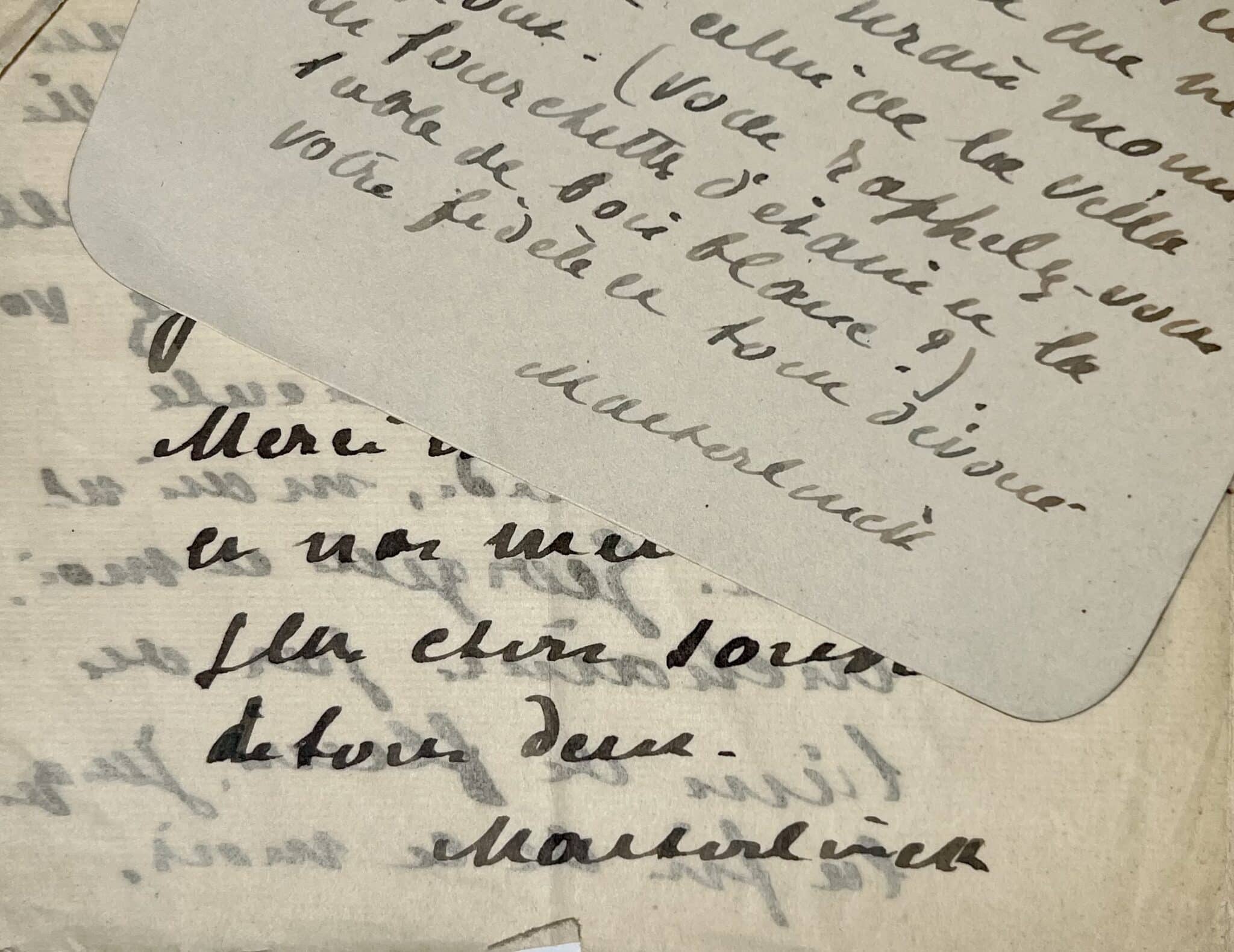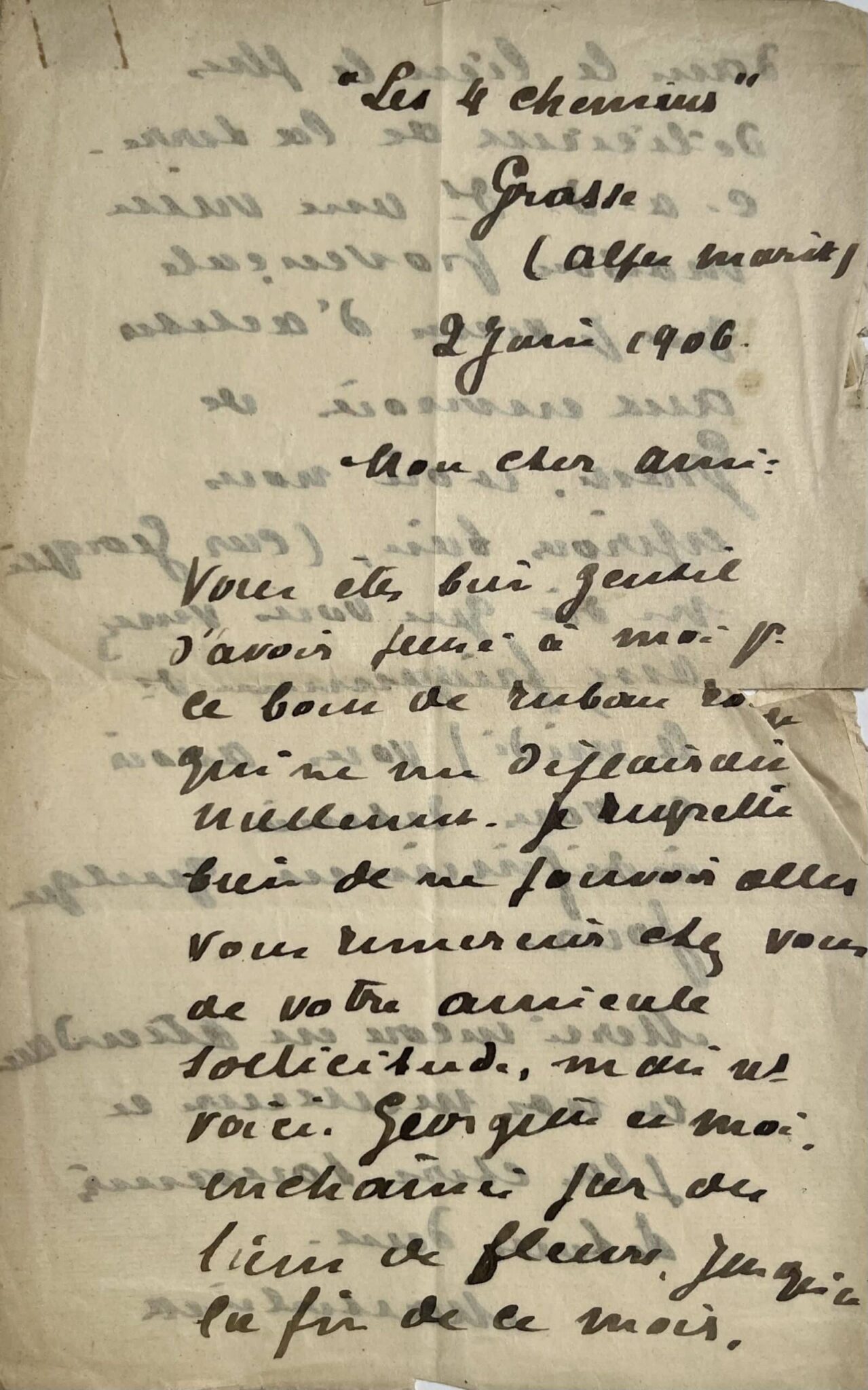 Maurice Maeterlinck (Gand, 1862/1949)"Mon cher ami, vous êtes bien gentil d’avoir pensé à moi pour le bout de ruban rouge qui ne me déplairait nullement. Je regrette bien de ne pouvoir aller vous remercier chez vous de votre amical sollicitude, mais nous voici, Georgette et moi, enchaînés par des liens de fleurs jusqu’à la fin du mois, dans le lieu le plus délicieux de la terre, c’est-à-dire dans une vieille maison provençale que je viens d’acheter aux environs de Grasse, et où nous espérons bien, (car Georgette me dit que vous venez assez fréquemment dans le midi) vous avoir et vous retenir indéfiniment quelques jours [...]".