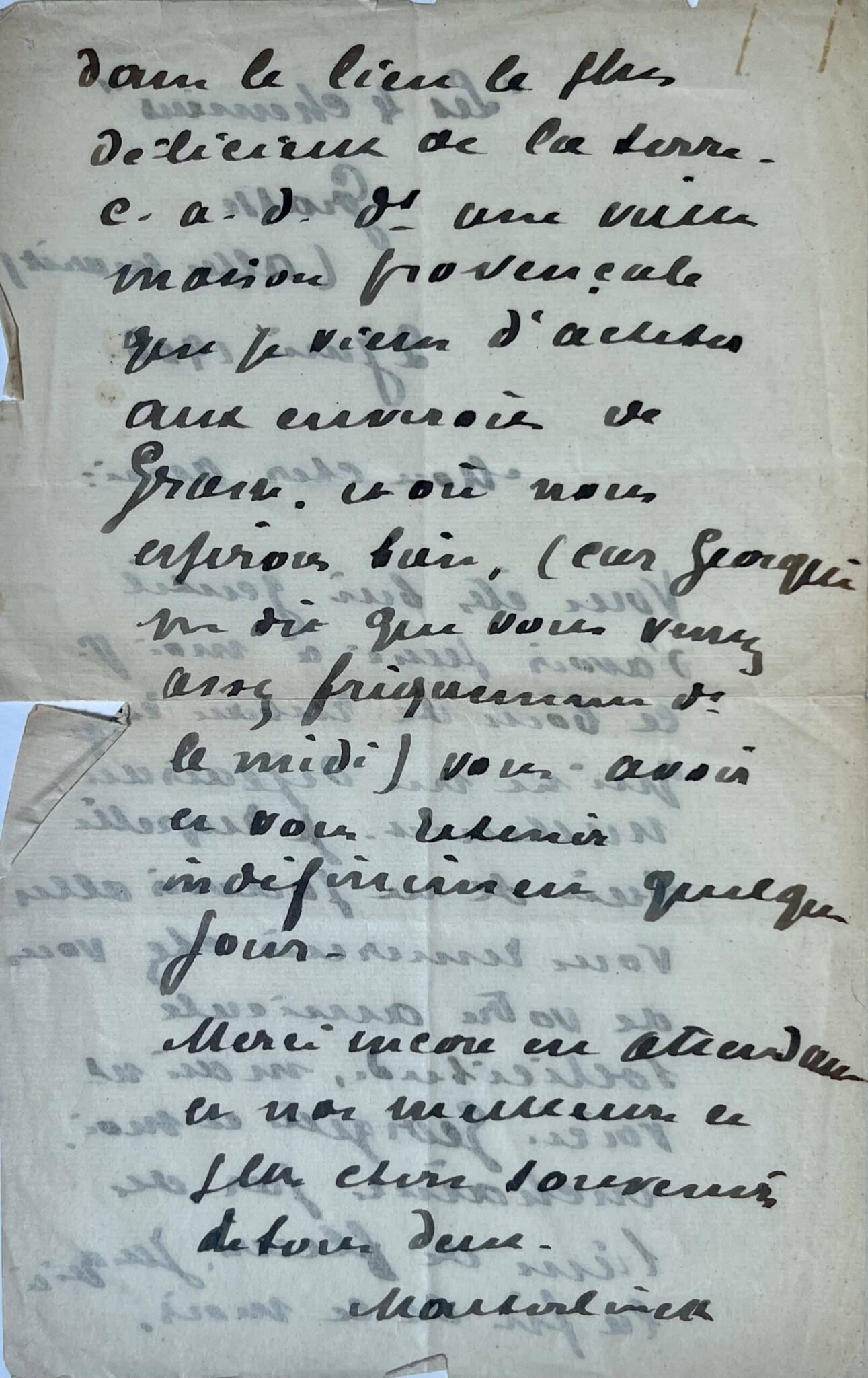 "Merci de votre bon souvenir. Il m'est allé au cœur, car n’êtes-vous pas l’un de mes premiers amis de Paris, ce qui fait déjà l'un des plus vieux amis de ma vie ? Ne passerez-vous pas à Nice cet hiver? Nous y avons trouvé un coin fleuri, tranquille et délicieux où il nous serait doux de vous offrir une hospitalité ou tout au moins un festin qui serait moins fruste que celui de la villa Dupont (vous rappelez-vous les fourchettes d'étain et la table de bois blanc ?)".