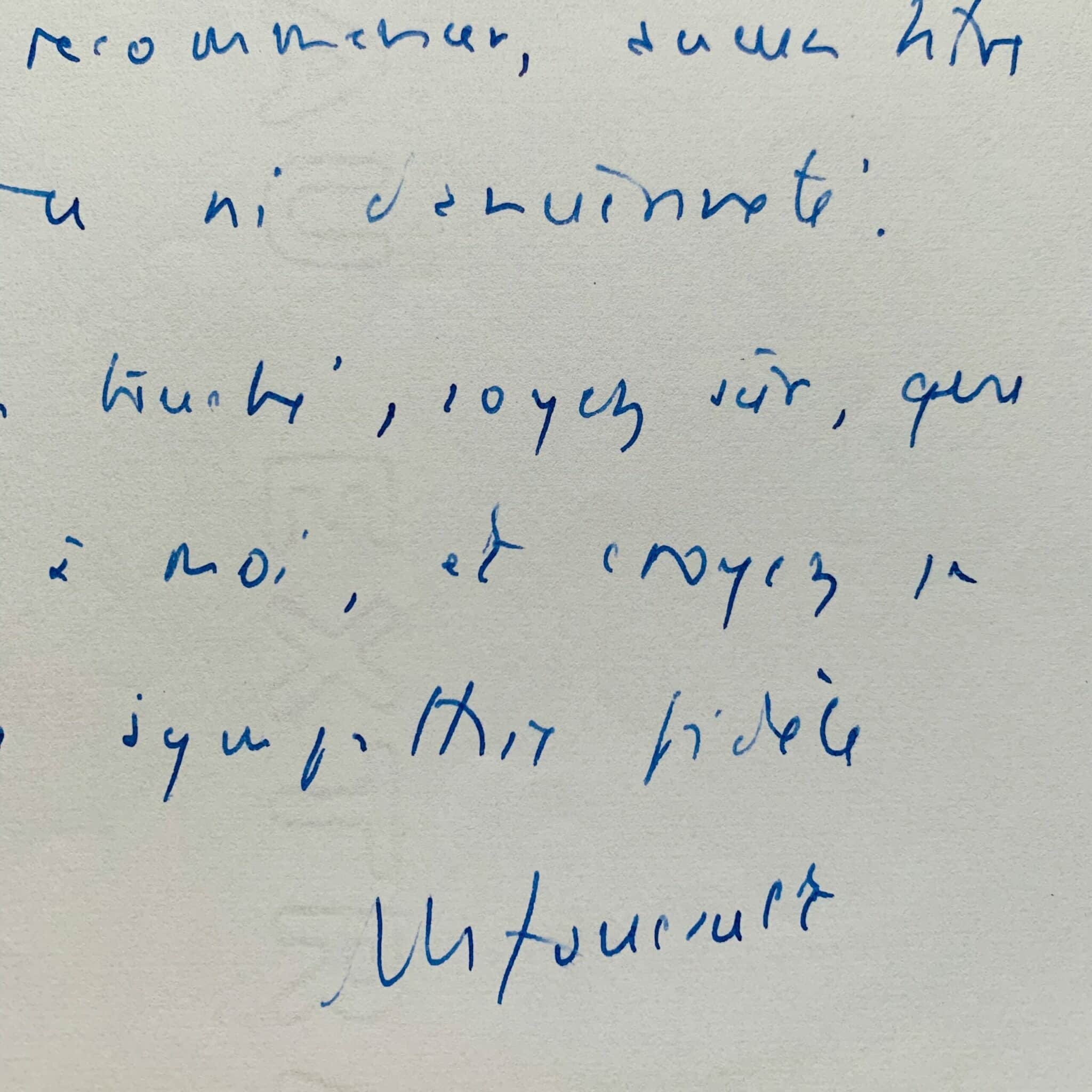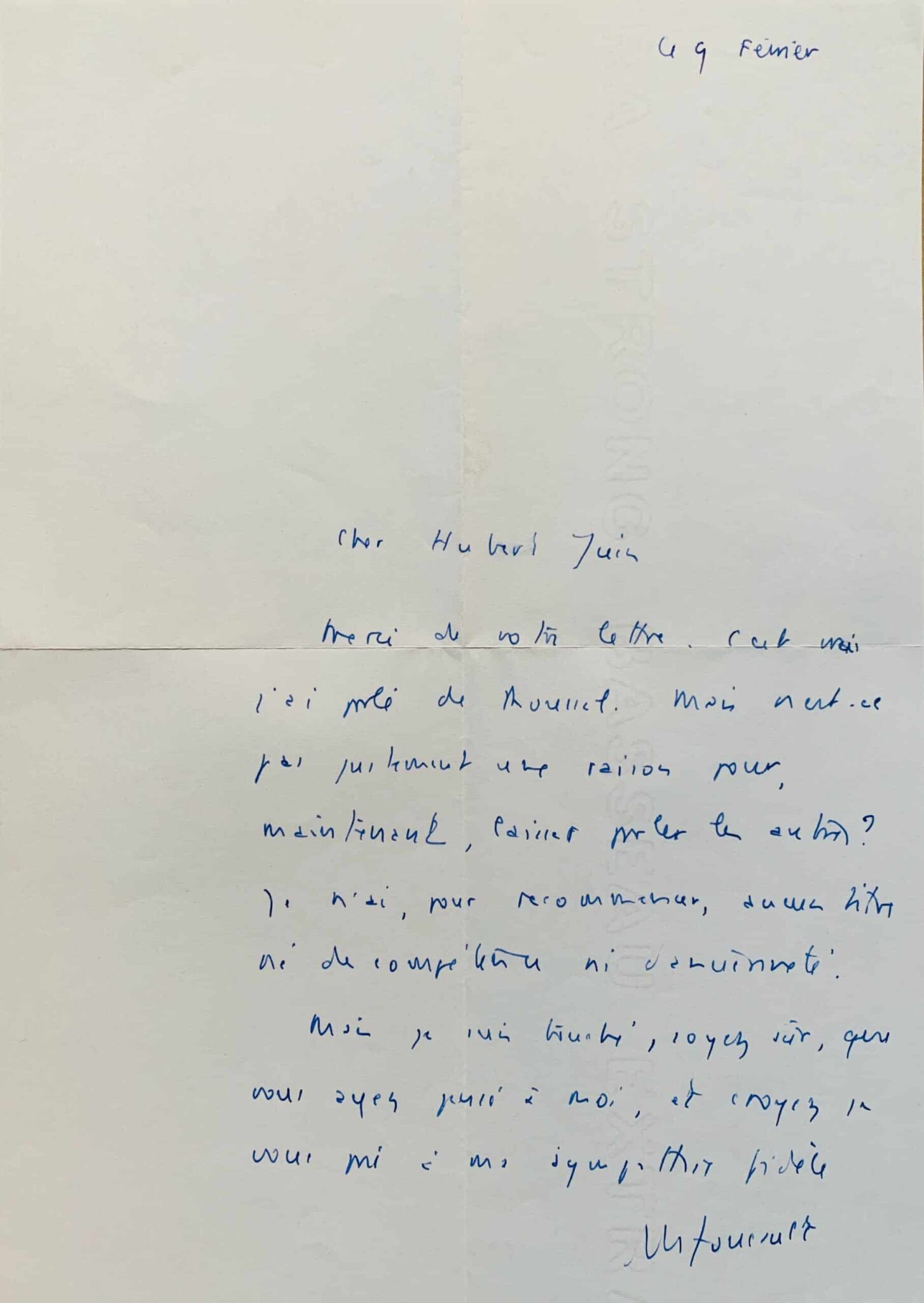 "Cher Hubert Juin, Merci de votre lettre. C'est vrai j'ai parlé de Roussel. Mais n'est-ce pas justement une raison pour, maintenant, laisser parler les autres? Je n'ai, pour recommencer, aucun titre ni de compétence ni d'ancienneté. Mais je suis touché, soyez sûr, que vous ayez pensé à moi, et croyez je vous prie à ma sympathie fidèle".