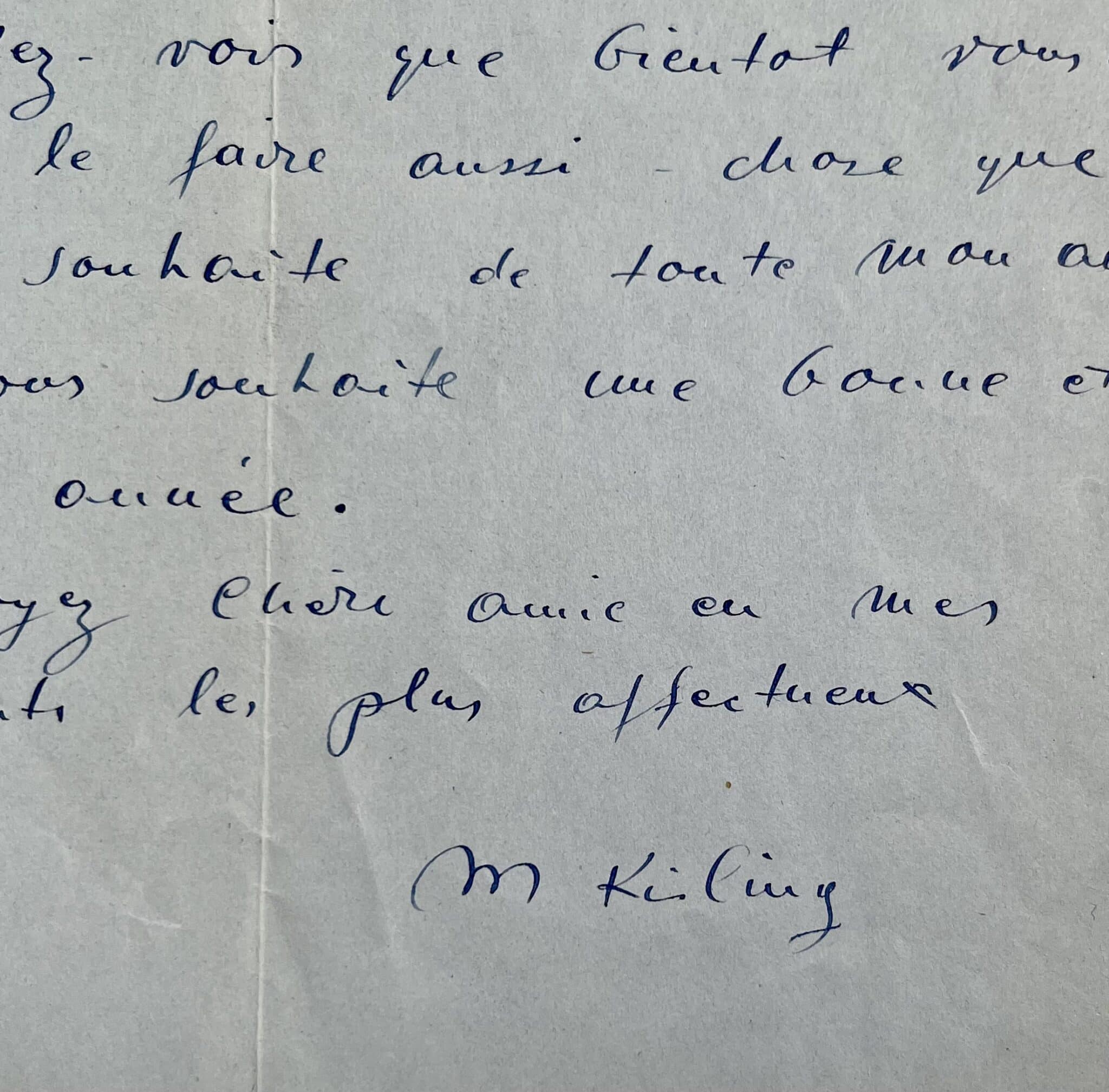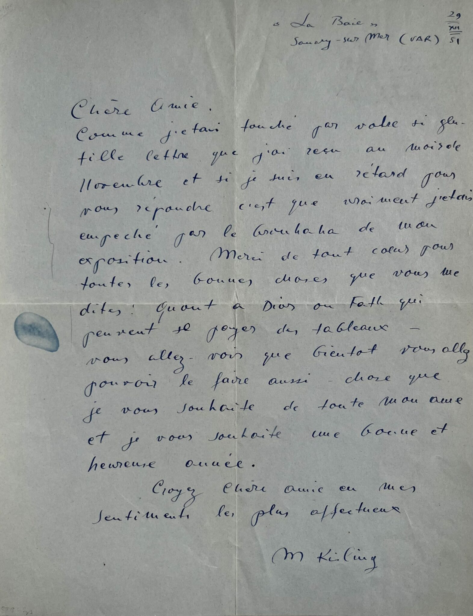 "Comme j’étais touché par votre si gentille lettre que j’ai reçu au mois de novembre et si je suis en retard pour vous répondre, c’est que vraiment j’étais empêché par le brouhaha de mon exposition. Merci de tout cœur pour toutes les bonnes choses que vous me dites ! Quant à Dior ou Fath [les couturiers Christian Dior et Jacques Fath] qui peuvent se payer des tableaux - vous allez voir que bientôt vous allez pouvoir le faire aussi - chose que je vous souhaite de toute mon âme et je vous souhaite une bonne et heureuse année. Croyez chère amie à mes sentiments les plus affectueux. M Kisling".