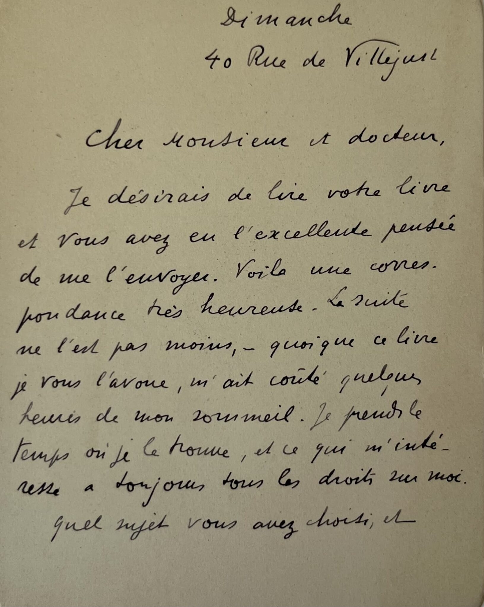 Paul Valéry (Sète, 1871/1945)"Je désirais de lire votre livre et vous avez eu l'excellente pensée de me l’envoyer. Voilà une correspondance très heureuse. La suite ne l’est pas moins, - quoique ce livre, je vous l’avoue, m’ait coûté quelques heures de mon sommeil. Je prends le temps où je le trouve, et ce qui m’intéresse a toujours tous les droits sur moi. Quel sujet vous avez choisi, et défini et élucidé ! Le problème de l’angoisse est la clé de toute notre métaphysique (ce qui explique la misère de cette recherche, et d’ailleurs, sa ténacité). Vos analyses, et singulièrement celle des défaillances de guerre, la délicatesse des jugements que vous portez, m’ont infiniment attaché. Qui ne porte en soi un anxieux plus ou moins dissimulé ? Je vous adresse tous les remerciements d'un lecteur excité et animé par sa lecture, et vous prie de croire à mes sentiments bien cordialement reconnaissant".