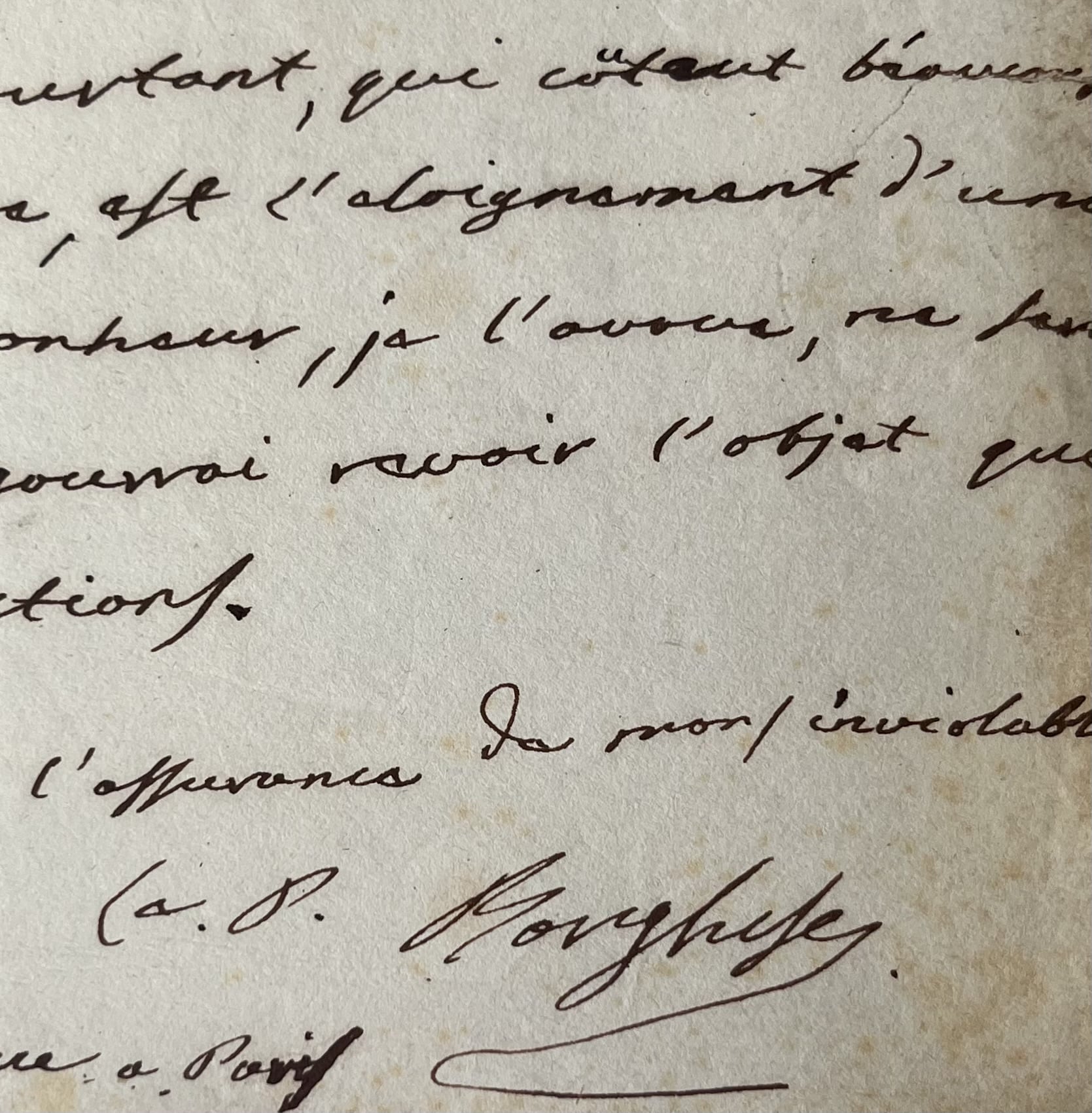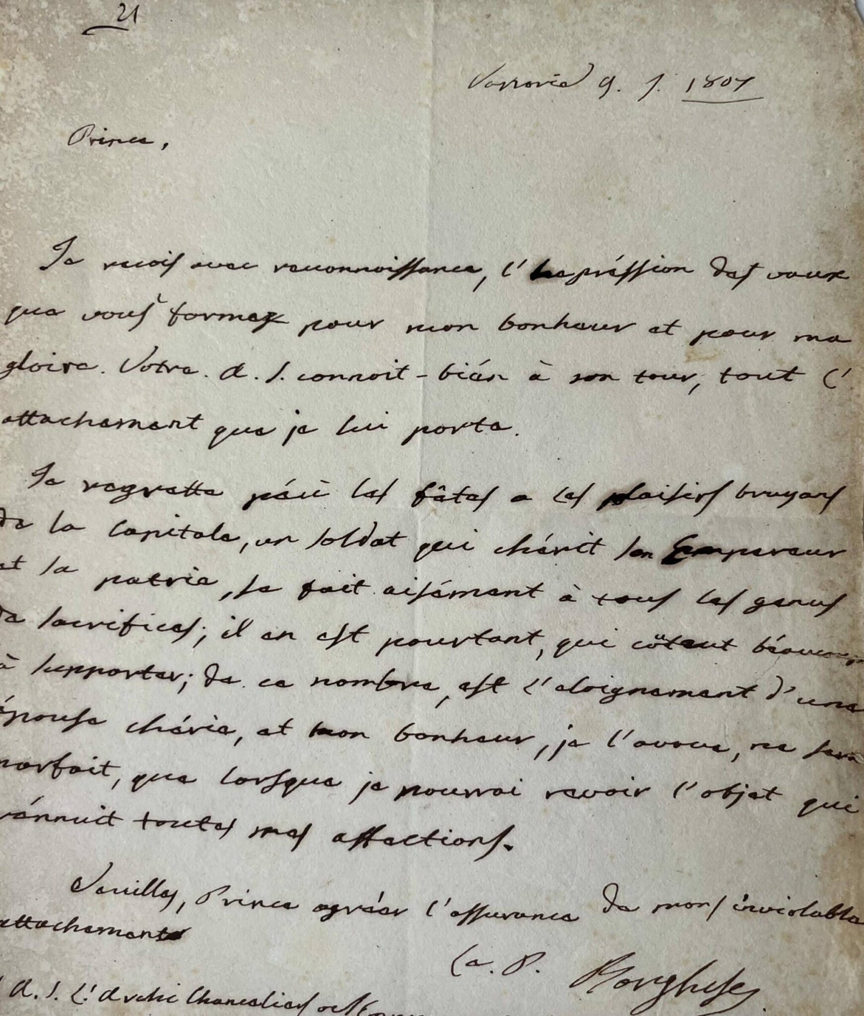 Je regrette ici les fêtes et les plaisirs bruyant de la capitale, un soldat qui chérit son Empereur et sa patrie, se fait aisément à tous les genres de sacrifices ; il en est pourtant, qui coûtent beaucoup à supporter ; de ce nombre, est l'éloignement d'une épouse chérie, et mon bonheur, je l'avoue, ne sera parfait que lorsque je pourrai revoir l'objet qui réunit toutes mes affections. Veuillez, Prince agréer l'assurance de mon inviolable attachement [...]".