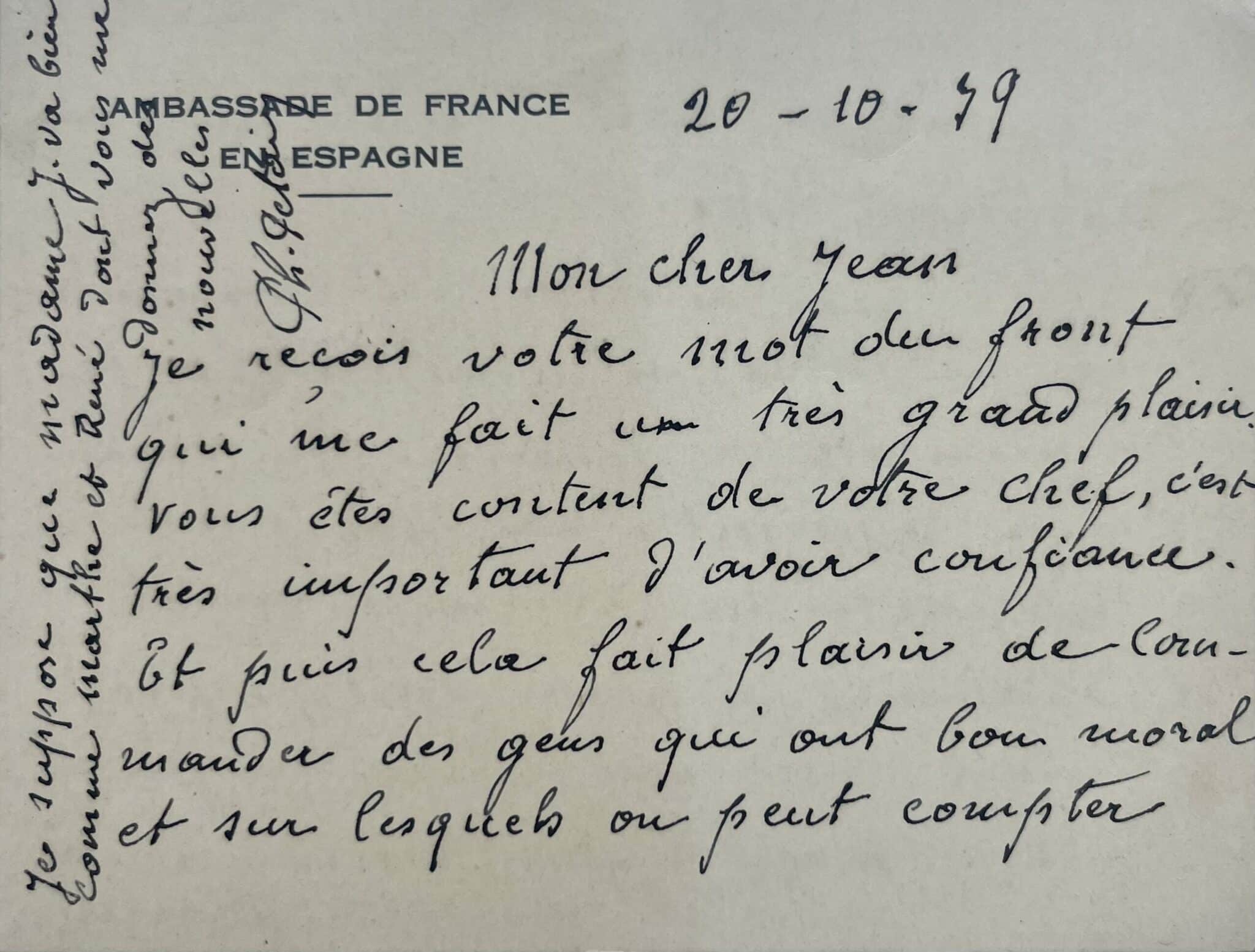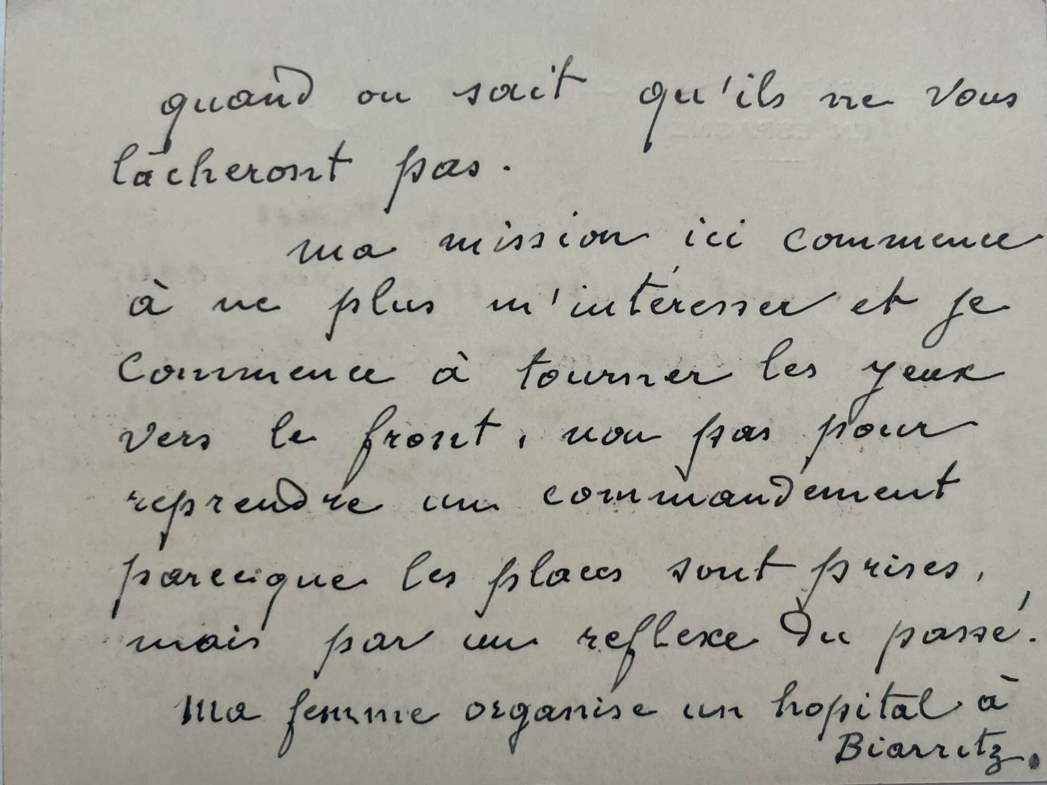 "Mon cher Jean. Je reçois votre mot du front qui me fait un très grand plaisir. Vous êtes content de votre chef, c’est très important d’avoir confiance. Et puis cela fait plaisir de commander des gens qui ont bon moral et sur lesquels on peut compter quand on sait qu’ils ne vous lâcheront pas. Ma mission ici commence à ne plus m’intéresser et je commence à tourner les yeux vers le front, non pas pour reprendre un commandement parce que les places sont prises, mais pas un réflexe du passé. Ma femme organise un hôpital à Biarritz. Je suppose que Madame J. va bien comme Marthe et René dont vous me donnez des nouvelles. Ph. Pétain".