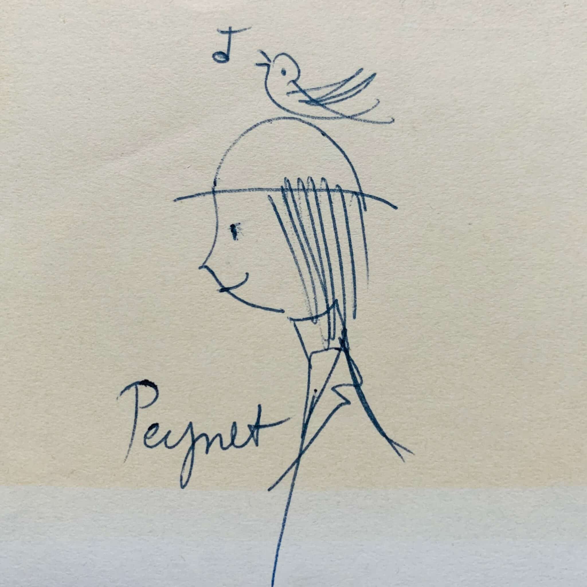 Charmant petit dessin signé Peynet, du fameux "poète" des amoureux, surmonté d'un oiseau chantant. Sur un petit feuillet aux coins arrondis.