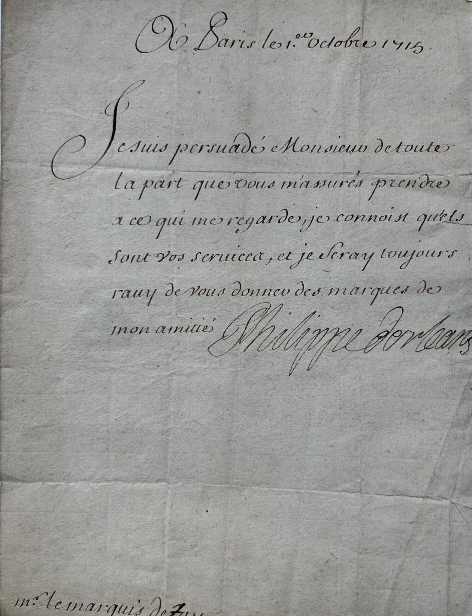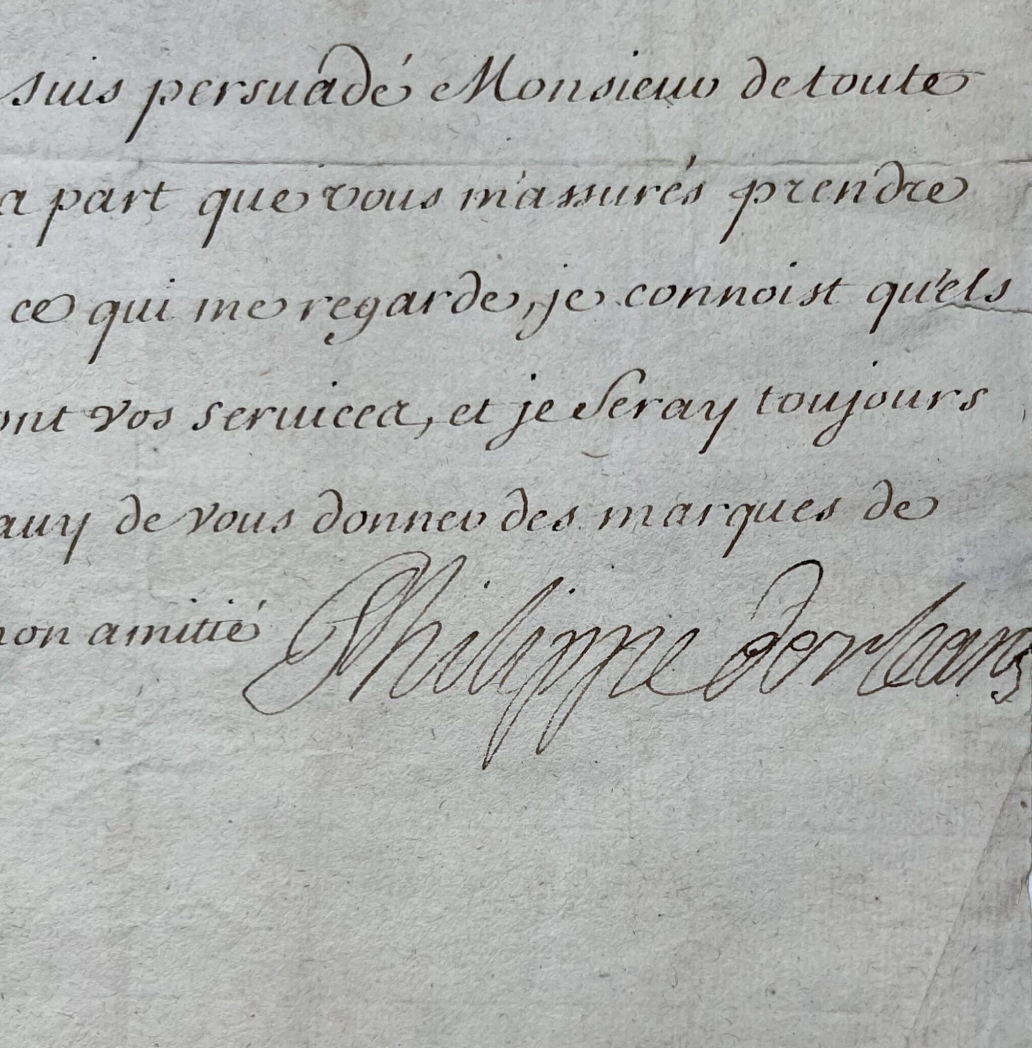 "Je suis persuadé Monsieur de toute la part que vous m'assurés prendre a ce qui me regarde, je connoist quels sont vos services, et je seray toujours ravy de vous donner des marques de mon amitié. Philippe d'Orléans".