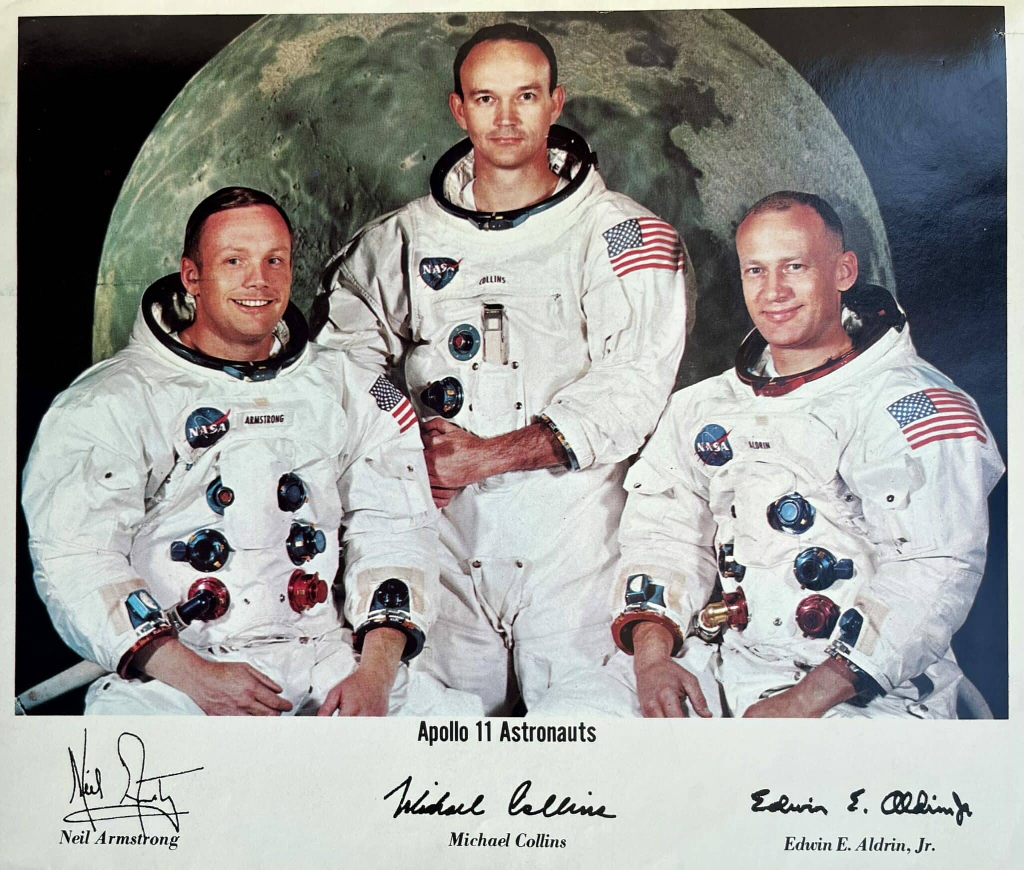 Photo (reproduction) des astronautes d’Apollo 11, signée par Neil Armstrong