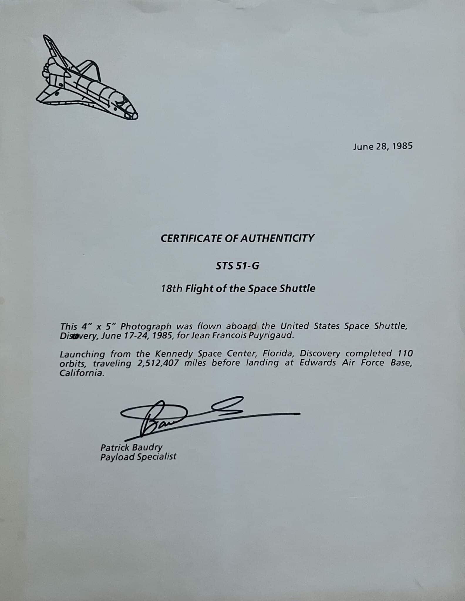 Il est joint un certificat d'authenticité pour ce cliché signé par Patrick Baudry, en date du 28 juin 1985 (en-tête illustré de la navette).