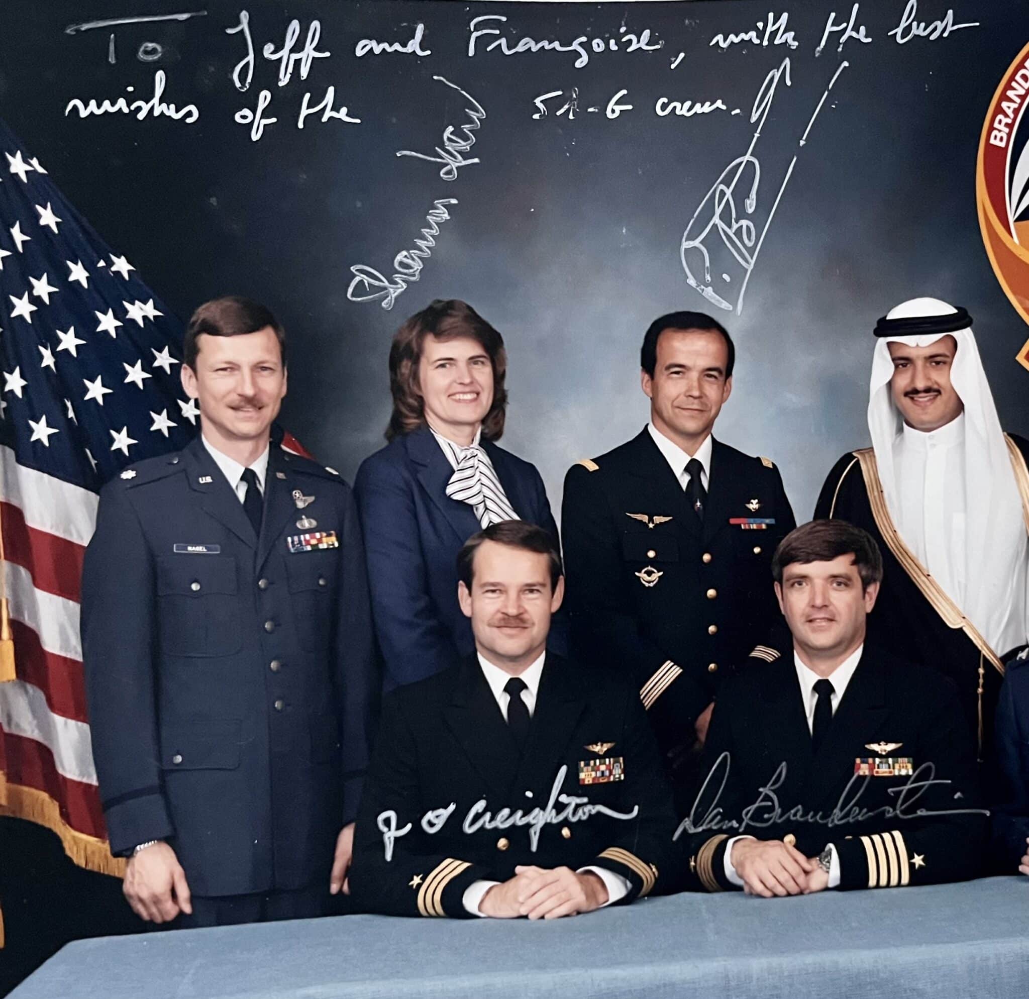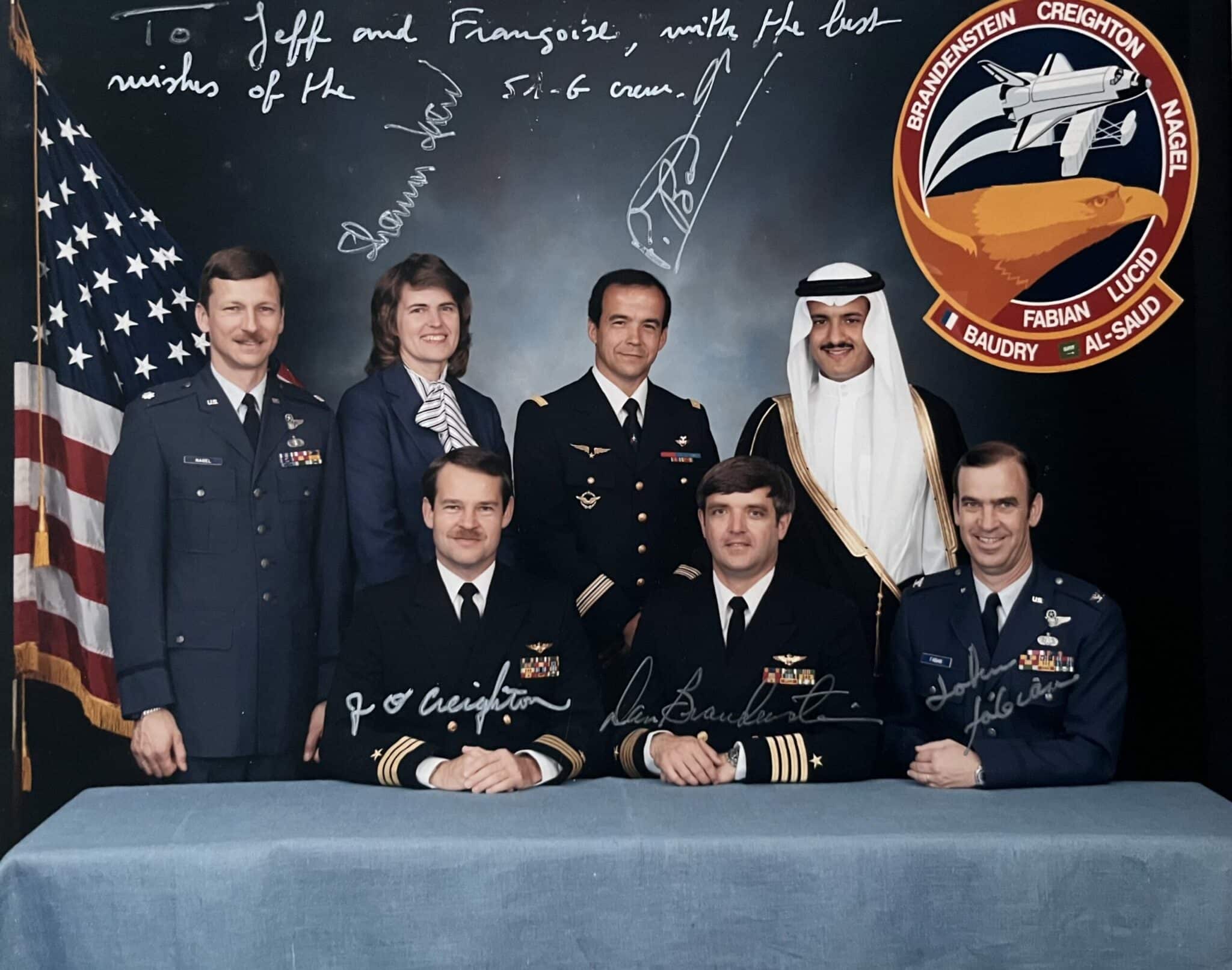 Portrait de groupe des membres de la mission STS-51-G (5e mission de la navette spatiale Discovery) qui compta parmi ses membres et pour la première fois un français et un saoudien. Tirage original en couleurs.