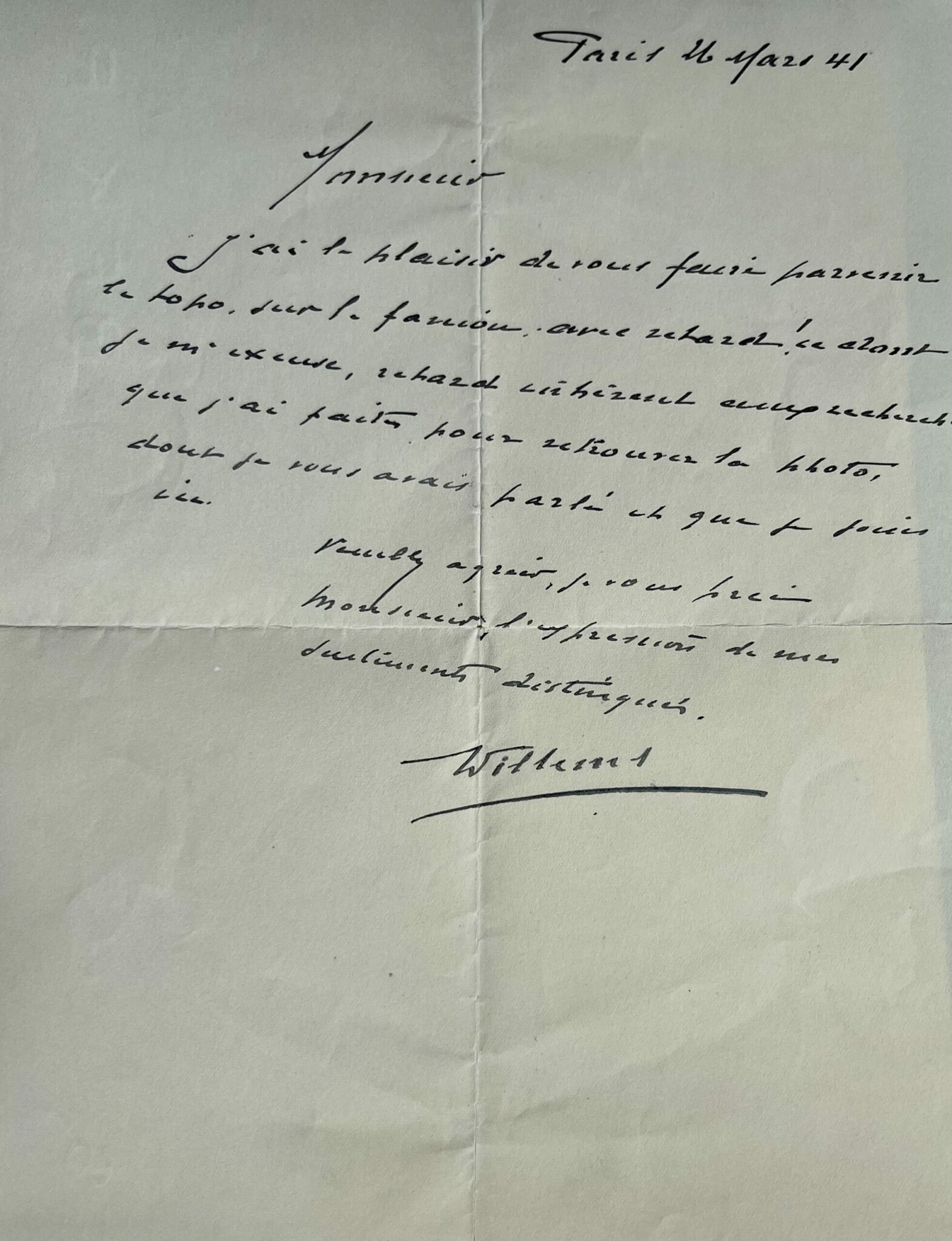"Monsieur. J'ai le plaisir de vous faire parvenir le topo, sur le fanion, avec retard ! ce dont je m'excuse, retard inhérent aux recherches que j'ai faites pour retrouver la photo, dont je vous avais parlé et que je joins ici".