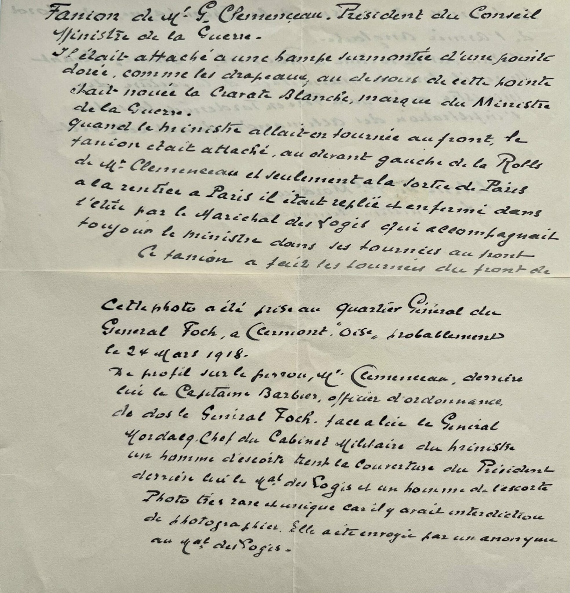 Ladite photographie représente Georges Clemenceau, sous le porche d'une maison bourgeoise. Elle est accompagnée de deux notes explicatives : "Cette photo a été prise au Quartier Général du Général Foch, à Clermont "Oise" probablement le 24 mars 1918. De profil sur le perron, Mr Clemenceau, derrière lui le Capitaine Barbier, officier d'ordonnance, de dos le Général Foch. Face à lui le Général Mordacq chef du cabinet militaire du Ministre [Jean Jules Henri Mordacq (1868-1943)], un homme d'escorte tient la couverture du Président, derrière lui le Mal des Logis et un homme de l'escorte. Photo très rare et unique car il y avait interdiction de photographier. Elle a été envoyée par un anonyme au Mal des Logis". La seconde note précise : "Fanion de M. G. Clemenceau - Président du Conseil Ministre de la Guerre. Il était attaché à une hampe surmontée d'une pointe dorée, comme les drapeaux ; au dessous de cette pointe était nouée la cravate blanche, marque du Ministre de la Guerre. Quand le Ministre allait en tournée au front, le fanion était attaché, au devant gauche de la Rolls de Mr Clemenceau et seulement à la sortie de Pari ; à la rentrée à Paris il était replié et enfermé dans l'étui par le Maréchal des Logis qui accompagnait toujours le Ministre dans ses tournées au front. Ce fanion a fait les tournées du front de la Somme, de l'Aisne, de la Champagne, du Nord, de l'Armée Anglaise. Il était sur la voiture à Rouverel, "Somme" devant Moreuil lors du marmitage de la voiture du Ministre, ainsi qu'à Fère-en-Tardenois lors de l'infiltration des Allemands, devant cette ville. Voir livre du Gal Mordacq "Le Ministre Clemenceau".
