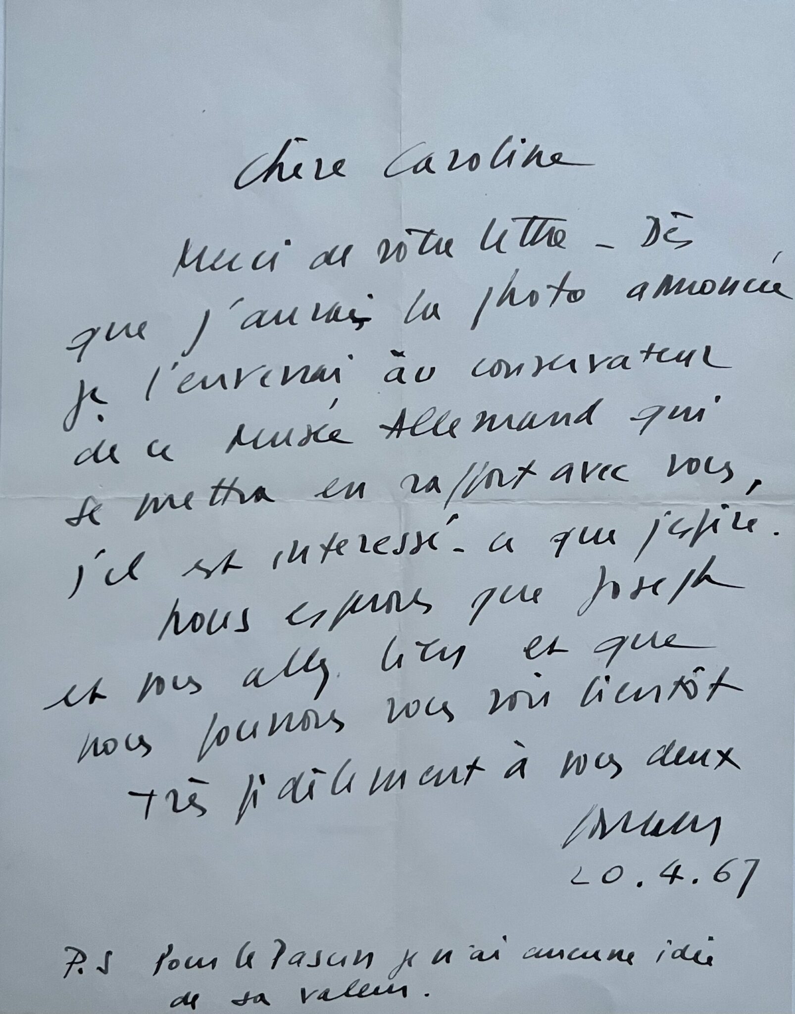 "Chère Caroline. Merci de votre lettre. Dès que j'aurai la photo annoncée je l'enverrai au conservateur de ce musée Allemand qui se mettra en rapport avec vous, s'il est intéressé - ce que j'espère. Nous espérons que Joseph et vous allez bien et que nous pourrons vous voir bientôt. Très fidèlement à vous deux. Soulages".