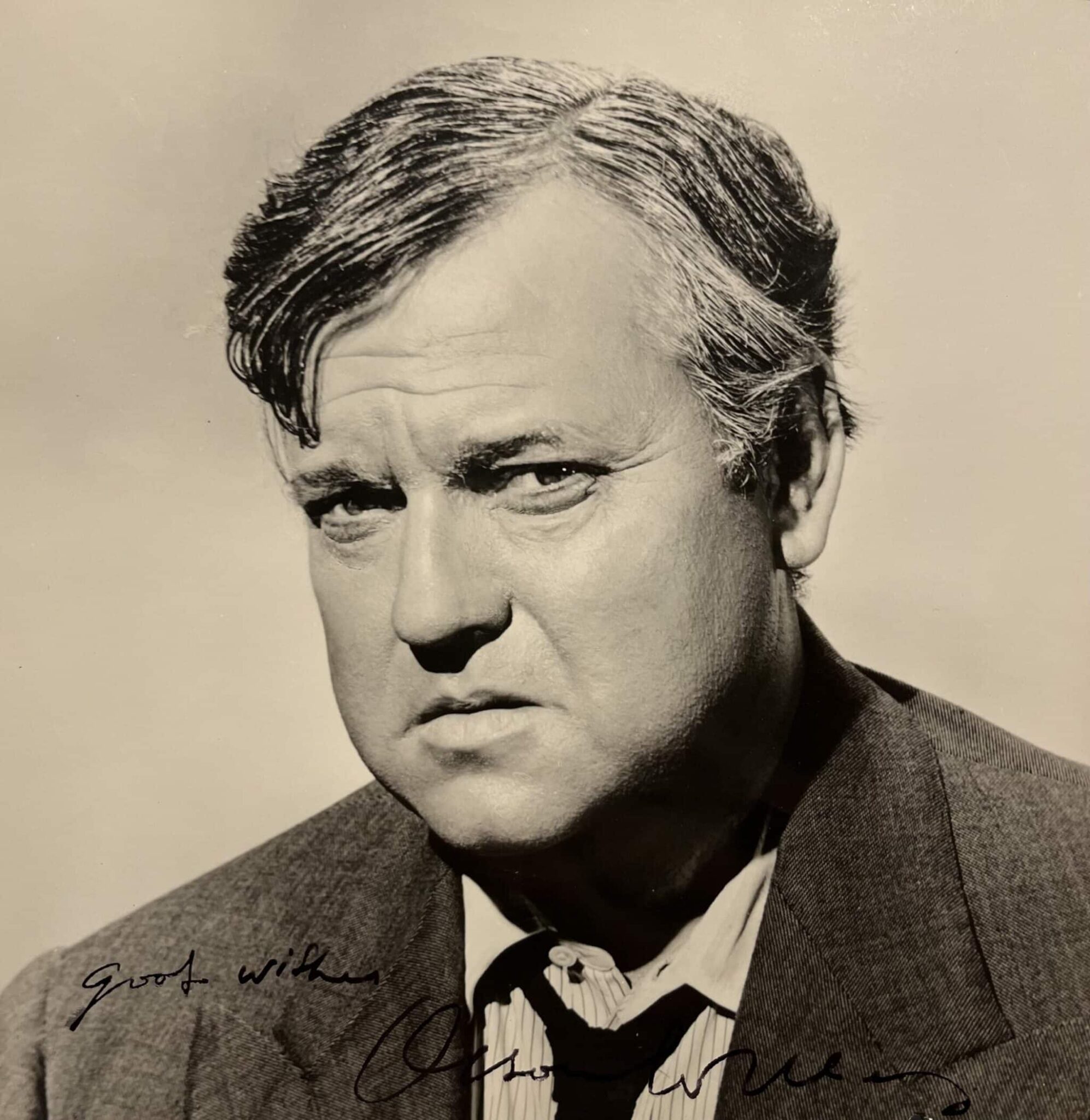 Dédicace à l'encre noire : "Good wishes. Orson Welles".