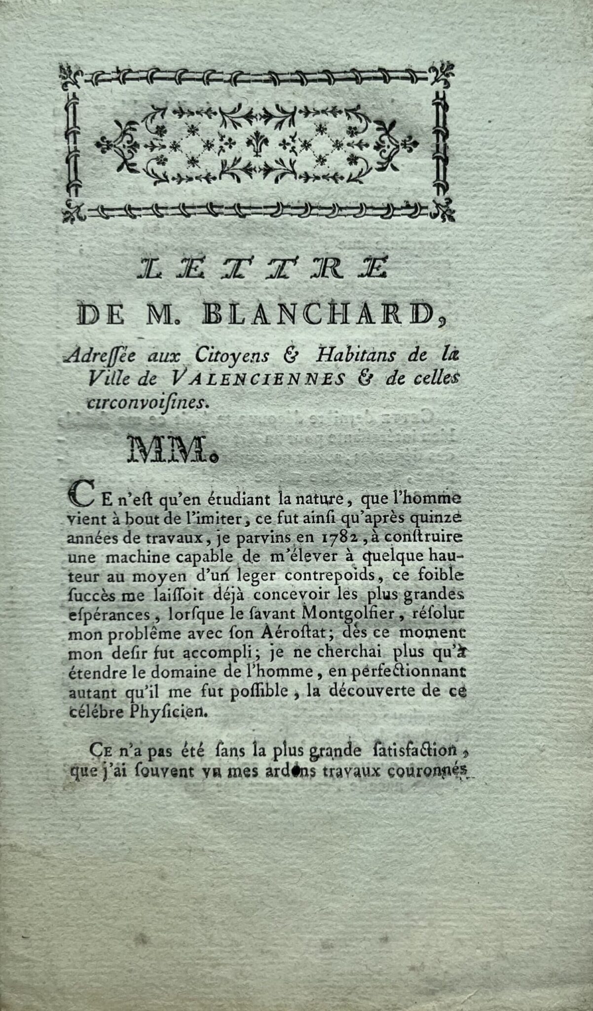 Imprimé intitulé : "Lettre de M. Blanchard, adressée aux Citoyens & Habitans de la ville de Valenciennes & de celles circonvoisines". Bandeau gravé.