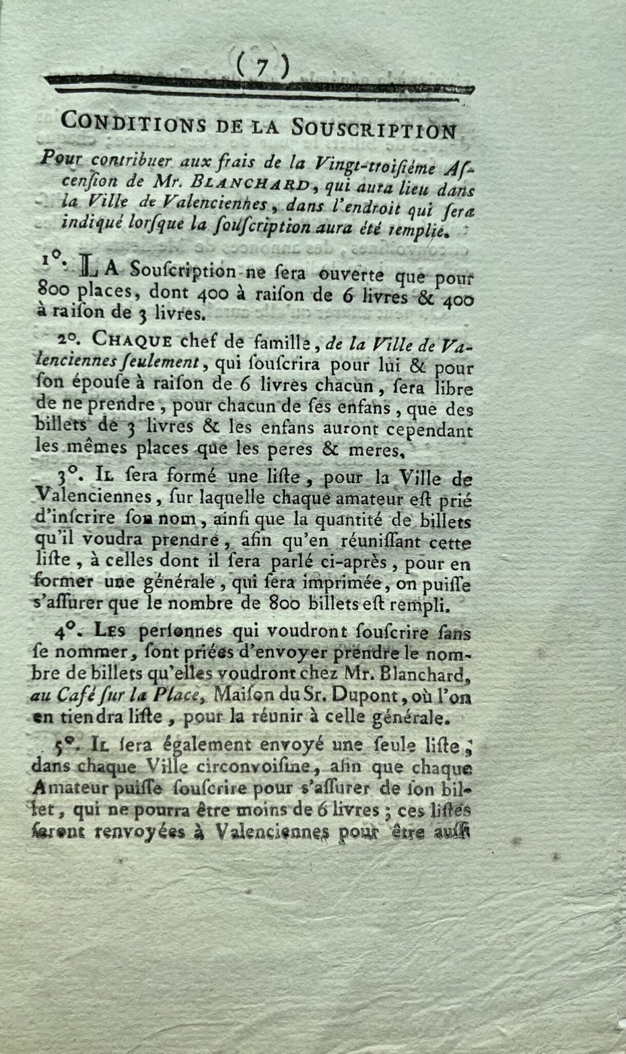 Néanmoins, toutes ces expériences sont coûteuses, ainsi Blanchard propose une souscription aux citoyens de Valenciennes. Il espère aussi par ce moyen, trouver parmi eux des amateurs dont il est "jaloux de captiver le suffrage". Suivent les conditions de la souscription : "Pour contribuer aux frais de la vingt-troisième ascension de Mr. Blanchard qui aura lieu dans la Ville de Valenciennes, dans l'endroit qui sera indiqué lorsque la souscription aura été remplie".