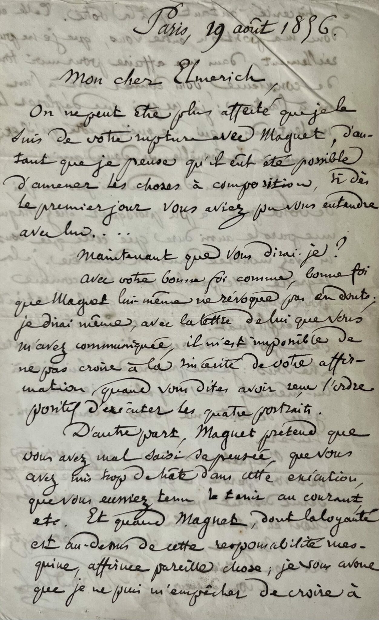 "Mon cher Elmerich. On ne peut être plus affecté que je le suis de votre rupture avec Maguet, d’autant que je pense qu’il était possible d’amener les choses à composition, si dès le premier jour vous aviez pu vous entendre avec lui…