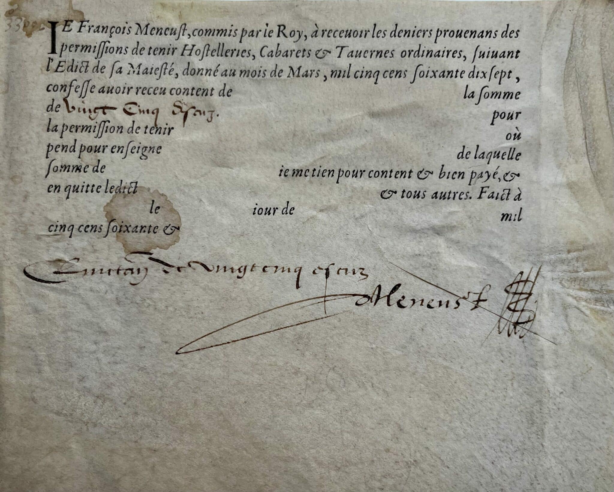 "Je François Meneust, commis par le Roy, à recevoir les deniers provenant des permissions de tenir Hostelleries, Cabarets & Tavernes ordinaires, suivant l'Edict de Sa Majesté, donné au mois de Mars, mil cinq cens soixante dix sept, confesse avoir receu content de la somme de vingt cinq escus [...]". Des parties sont restées vierges.