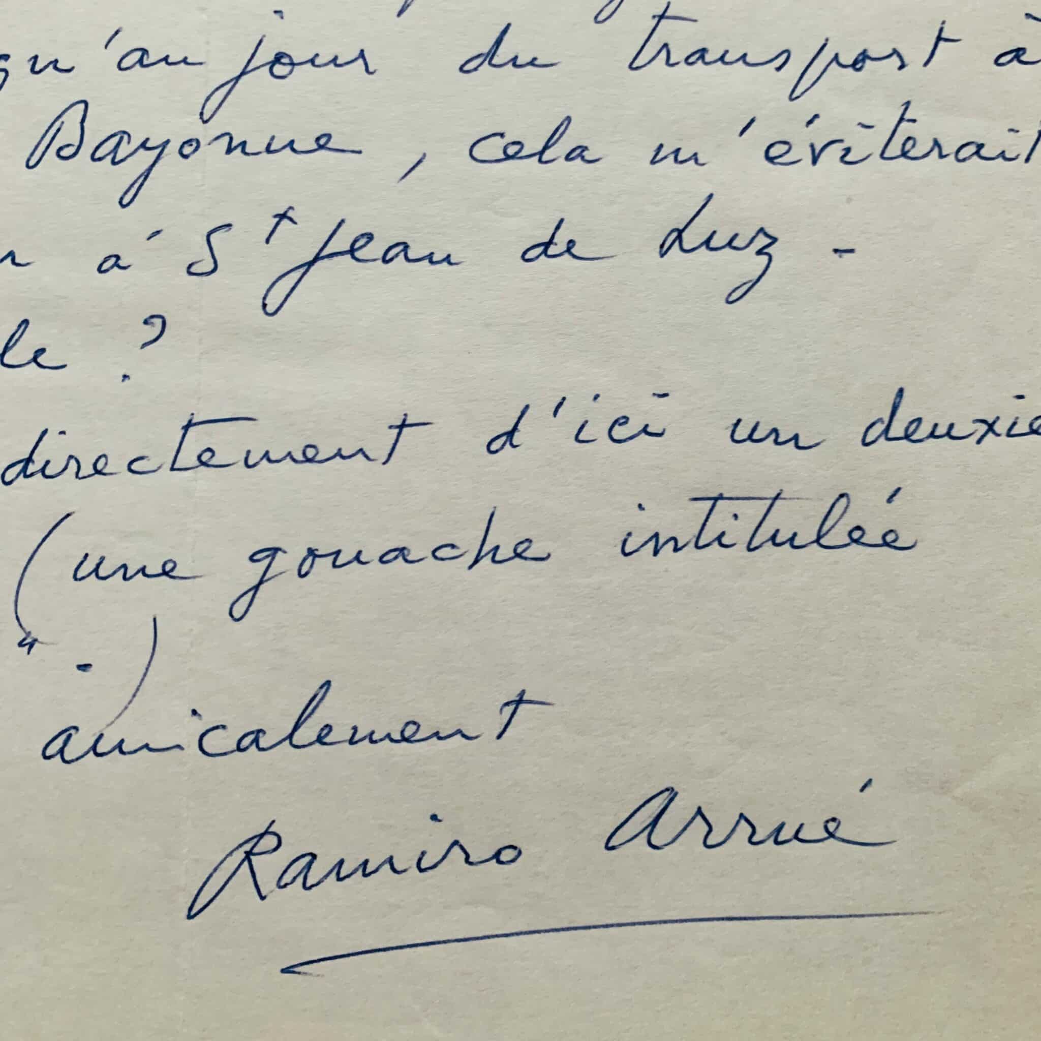 J'enverrai directement d'ici un deuxième tableau (une gouache intitulée "Sur la place"). Bien amicalement. Ramiro Arrué".