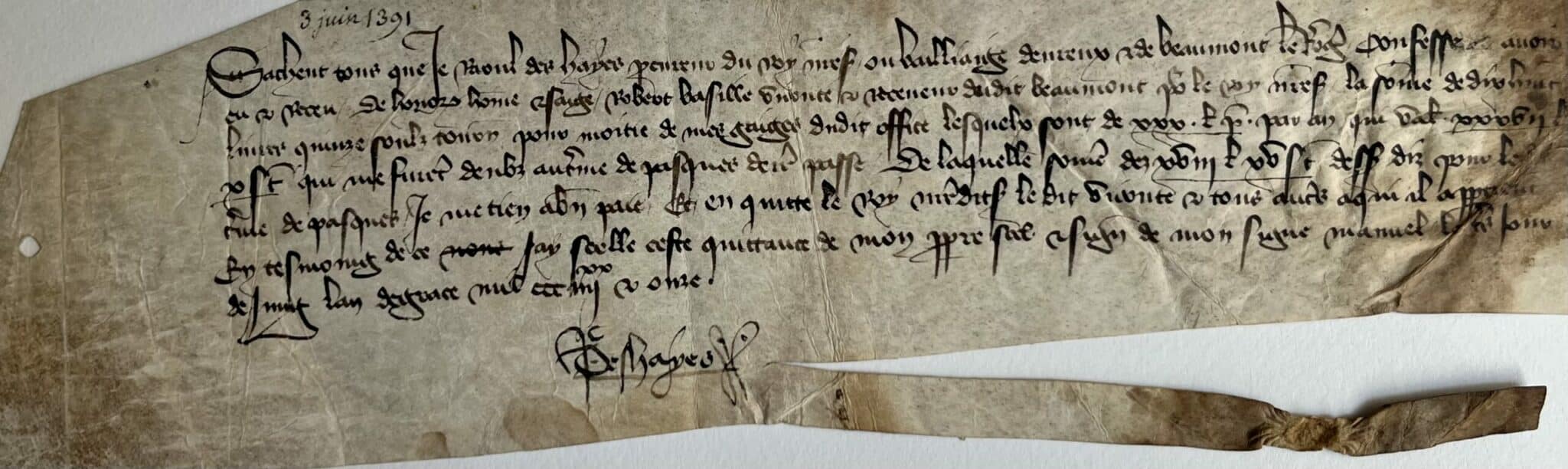 Pièce manuscrite sur parchemin, datée du 4 juin 1391, signée de son seing manuel par Raoul Des Hayes, procureur du roi au bailliage d'Évreux et de Beaumont : reçu pour le paiement de la somme de 18 livres et quinze sols tournois "pour moitié de mes gaiges dudit office lesquels sont de xxx £ t. par an" des mains de "Robert Basille viconte et receveur dudit Beaumont".