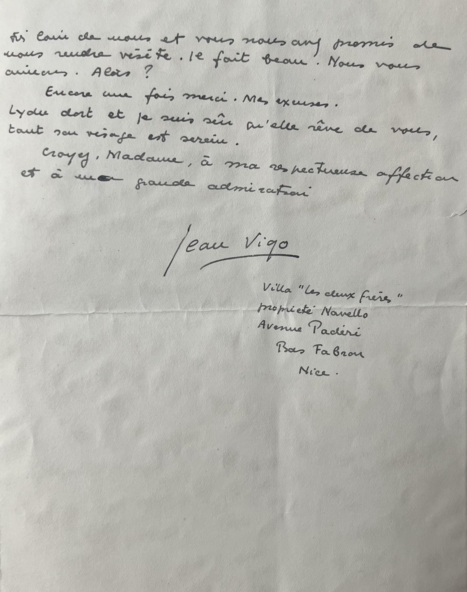 Madame Germaine Dulac m’a reçu chez elle, à Paris, très cordialement. Ses propos et son attitude respiraient la sincérité et je fus bien heureux de la rencontrer. Elle sera mon plus sûre soutien à la Franco-Film - où elle connaît tout le monde - et où je viens d’entrer grâce à Claude Autant-Lara [le réalisateur Claude Autant-Lara (. Mais là les « équipes » se font et se défont constamment et Madame Germaine Dulac me sera du plus grand secours. Je dois lui écrire - ainsi qu’elle m’en a prié pour lui exposer clairement ce que je sais faire et ce que je veux faire. Madame Germaine Dulac sera bénie par moi doublement, puisqu’elle me permettra de vous devoir encore beaucoup plus de reconnaissance. Ah ! Madame. Quand vous reverrons-nous ? Vous n’êtes pas si loin de nous et vous nous avez promis de nous rendre visite. Il fait beau. Nous vous aimons. Alors ? Encore une fois merci. Mes excuses. Lydu dort et je suis sûre qu’elle rêve de vous, tout son visage est serein".