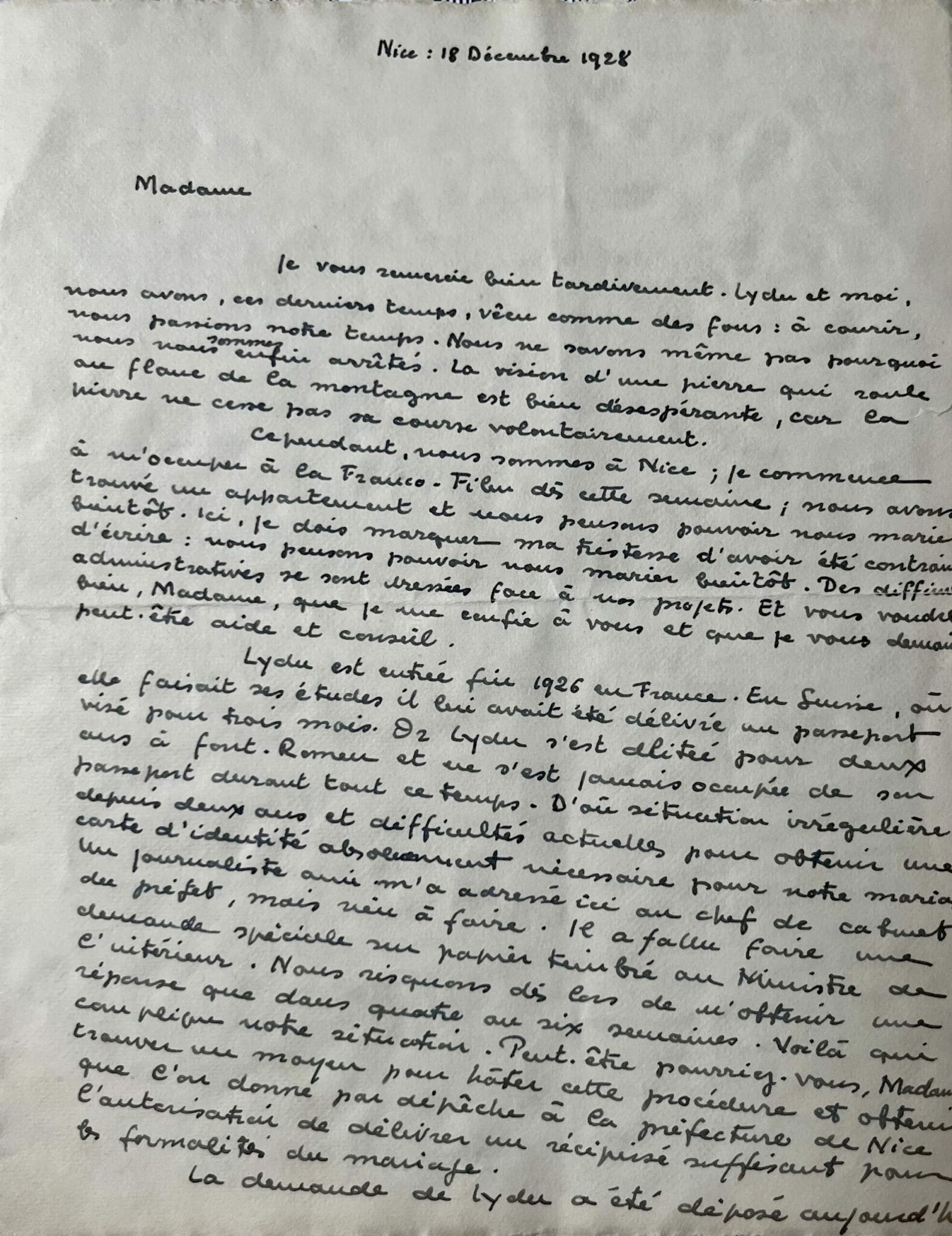 Lydu est entrée fin 1926 en France. En Suisse, où elle faisait ses études il lui avait été délivré un passeport visé pour trois mois. Or Lydu s’est alitée pour deux ans à Font-Romeu et ne s’est jamais occupé de son passeport durant tout ce temps. D’où situation irrégulière depuis deux ans et difficultés actuelles pour obtenir une carte d’identité absolument nécessaire pour notre mariage. Un journaliste ami m’a adressé ici au chef du cabinet du préfet, mais rien à faire. Il a fallu faire une demande spéciale sur papier timbré au Ministre de l’Intérieur. Nous risquons dès lors de n'obtenir une réponse que dans quatre ou six semaines. Voilà qui complique notre situation. Peut-être pourriez-vous, Madame, trouver un moyen pour hâter cette procédure et obtenir que l’on donne par dépêche à la préfecture de Nice, l’autorisation de délivrer un récépissé suffisant pour les formalités du mariage. La demande de Lydu a été déposée aujourd’hui auprès du commissaire spécial et porte le numéro d’ordre 9081. Un certificat de séjour rédigé par le Docteur Cappelle de Font-Romeu et légalisé par la mairie d'Odeillo [Font-Romeu-Odeillo-Via] est joint à l’envoi.