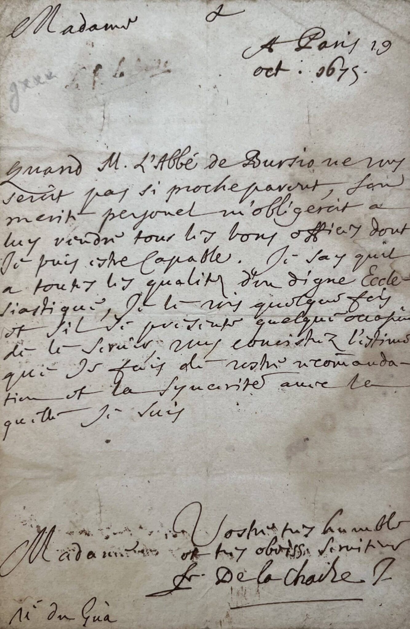 "Quand M. L'Abbé de Bursio ne vous seroit pas si proche parent, son mérite personel m'obligeroit à luy rendre tous les bons offices dont je puis estre capable. Je say qu'il a toutes les qualitez d'un digne ecclésiastique. Je le vis quelquefois et s'il se présente quelque occasion de le servir", il usera de sa recommandation.