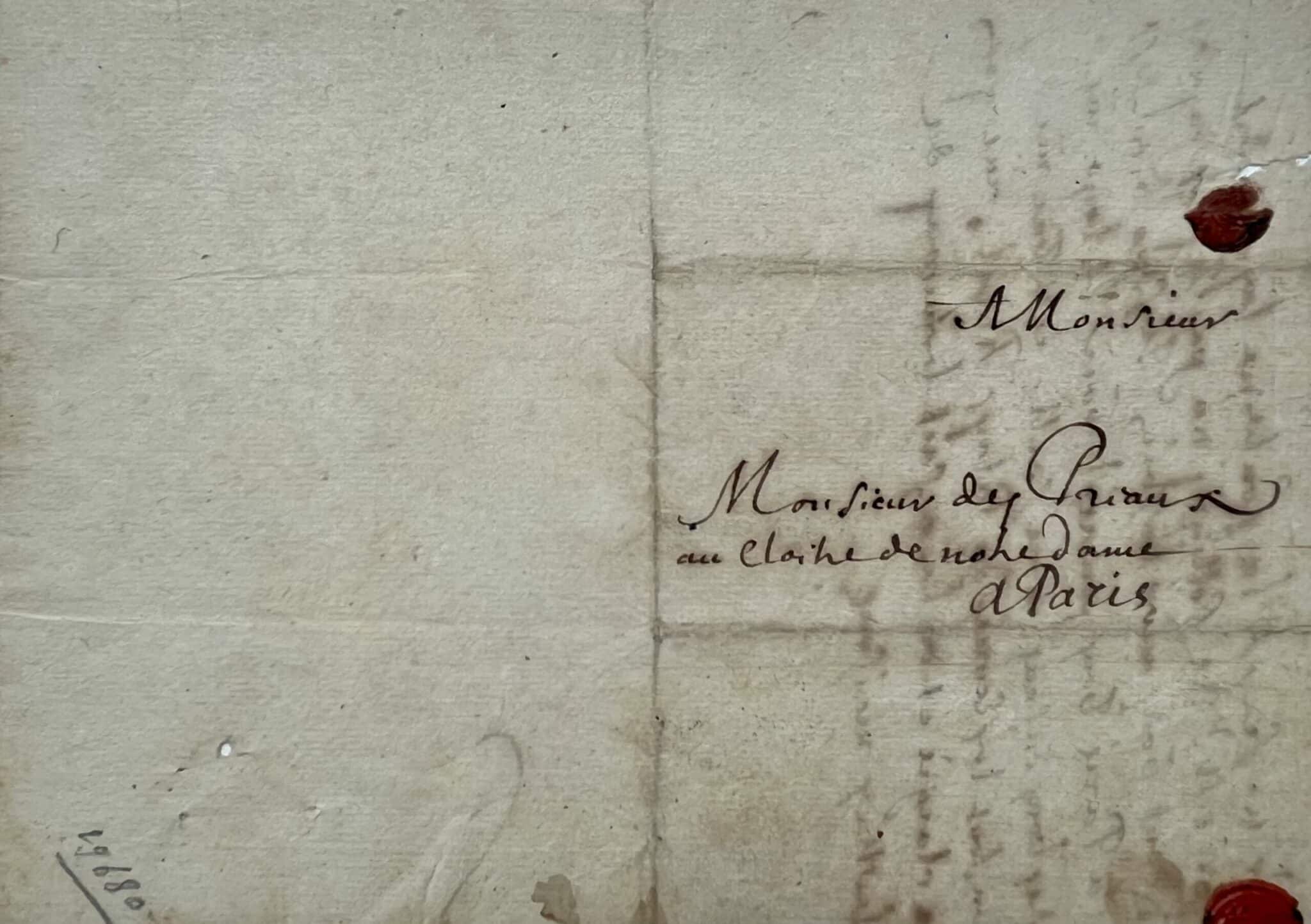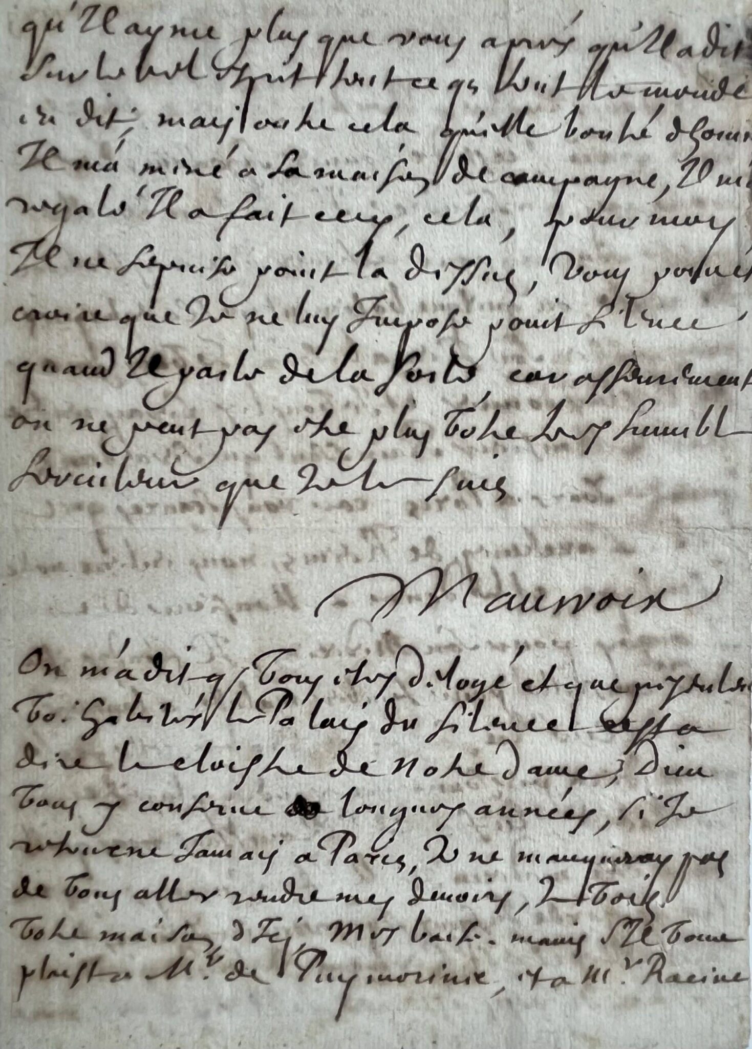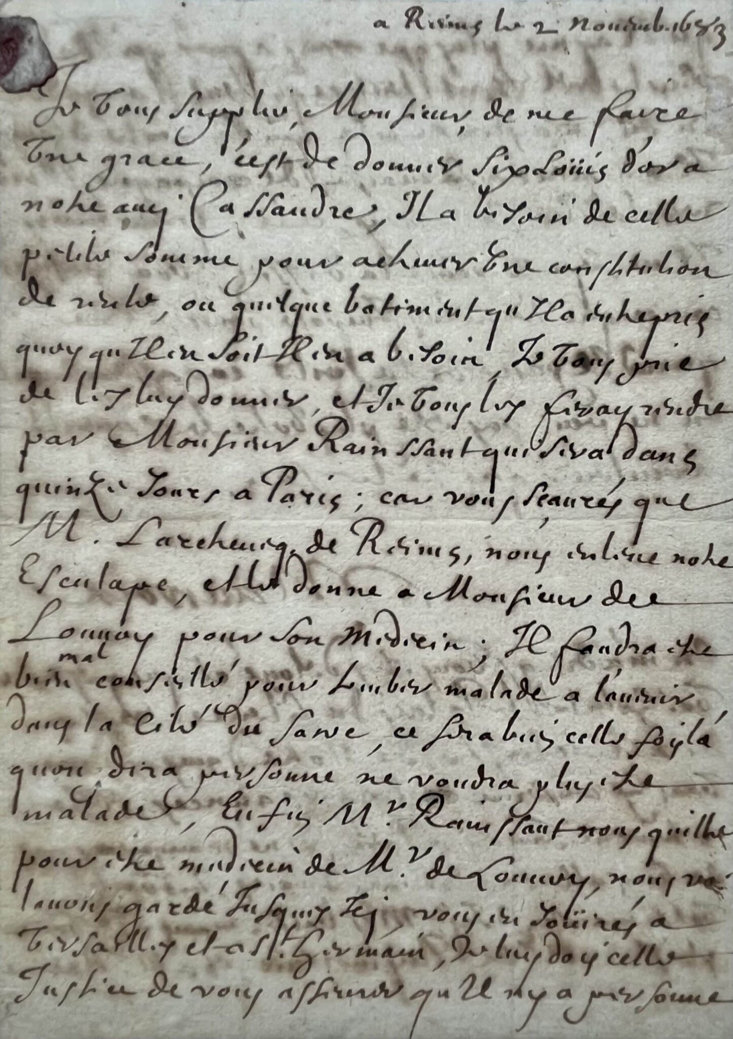 "Je vous supplie, Monsieur, de me faire une grâce, c'est de donner six louis d'or à notre amy Cassandre. Il a besoin de cette petite somme pour achever une constitution de rente, ou quelque bâtiment qu'il a entrepris. Quoi qu'il en soit il en a besoin. Je vous prie de les luy donner et je vous les feray rendre par Monsieur Rainssant qui sera dans quinze jours à Paris ; car vous sçaurés que M. l’archeveq. de Reims, nous enleve notre Esculape [Maucroix était chanoine de Reims], et le donne a Monsieur de Louvois pour son medecin ; il faudra être bien mal conseillé pour tomber malade à l’avenir dans la cité du Sacre, ce sera bien cette fois là qu’on dira personne ne voudra plus etre malade. Enfin Mr Rainssant [Pierre Rainssant (Reims 1640-1689)] nous quitte pour être médecin de Mr de Louvois, nous vous l'avons gardé jusqu'ici, vous en jouirez à Versailles et à Saint-Germain. Je luy dois cette justice de vous asseurer qu’il ny a personne qu’il ayme plus que vous après qu’il a dit sur le bel esprit tout ce que tout le monde en dit ; mais outre cela quelle bonté d'homme. Il m'a mené à sa maison de campagne, il m'a régalé, il a fait (?), cela, pour moy. Il ne s'épuise point à dessus, vous pouvés croire que je ne luy impose point silence quand il parle de la sorte, car asseurement on ne peut pas être plus votre très humble serviteur que je le suis,