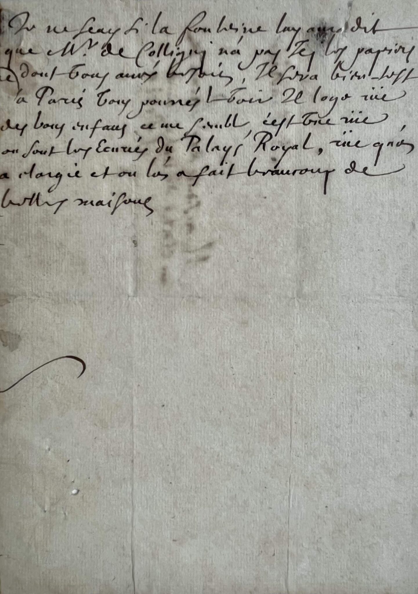 Il a appris que Boileau avait déménagé : « On m'a dit que vous êtes délogé et que présentement vous habités le Palais du Silence cest a dire le cloistre de Notre Dame ; Dieu vous y conserve de longues années, si je retourne jamais à Paris, je ne manqueray pas de vous aller rendre mes devoirs. Je vois votre maison d’icy. Mes baise-mains s'il vous plaist à Mr de Puymorins [Pierre Boileau de Puymorin, frère de Nicolas Boileau, qui fut le parrain du second fils de Molière], et à Mr Racine. Je ne scay si La Fontaine luy aura dit que Mr de Colligny n’a pas icy les papiers dont vous avés besoin. Il sera bien-tost a Paris vous pourrés le voir. Il loge rüe des Bons Enfans ce me semble, c’est une rüe ou sont les Ecuries du Palays royal, rüe qu’on a elargie et ou l’on a fait beaucoup de belles maisons".
