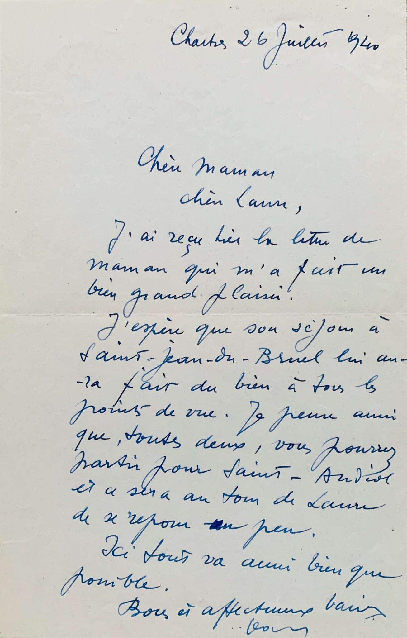 « Chère maman, chère Laure, J'ai reçu hier la lettre de maman qui m'a fait un bien grand plaisir. J'espère que son séjour à Saint-Jean-du-Bruel [en Aveyron] lui aura fait du bien à tous les points de vue. Je pense aussi que, toutes deux, vous pourriez partir pour Saint-Andiol [lieu de la maison familiale des Moulin] et ce sera au tour de Laure de se reposer un peu. Ici tout va aussi bien que possible. Bons et affectueux baisers. Jean »