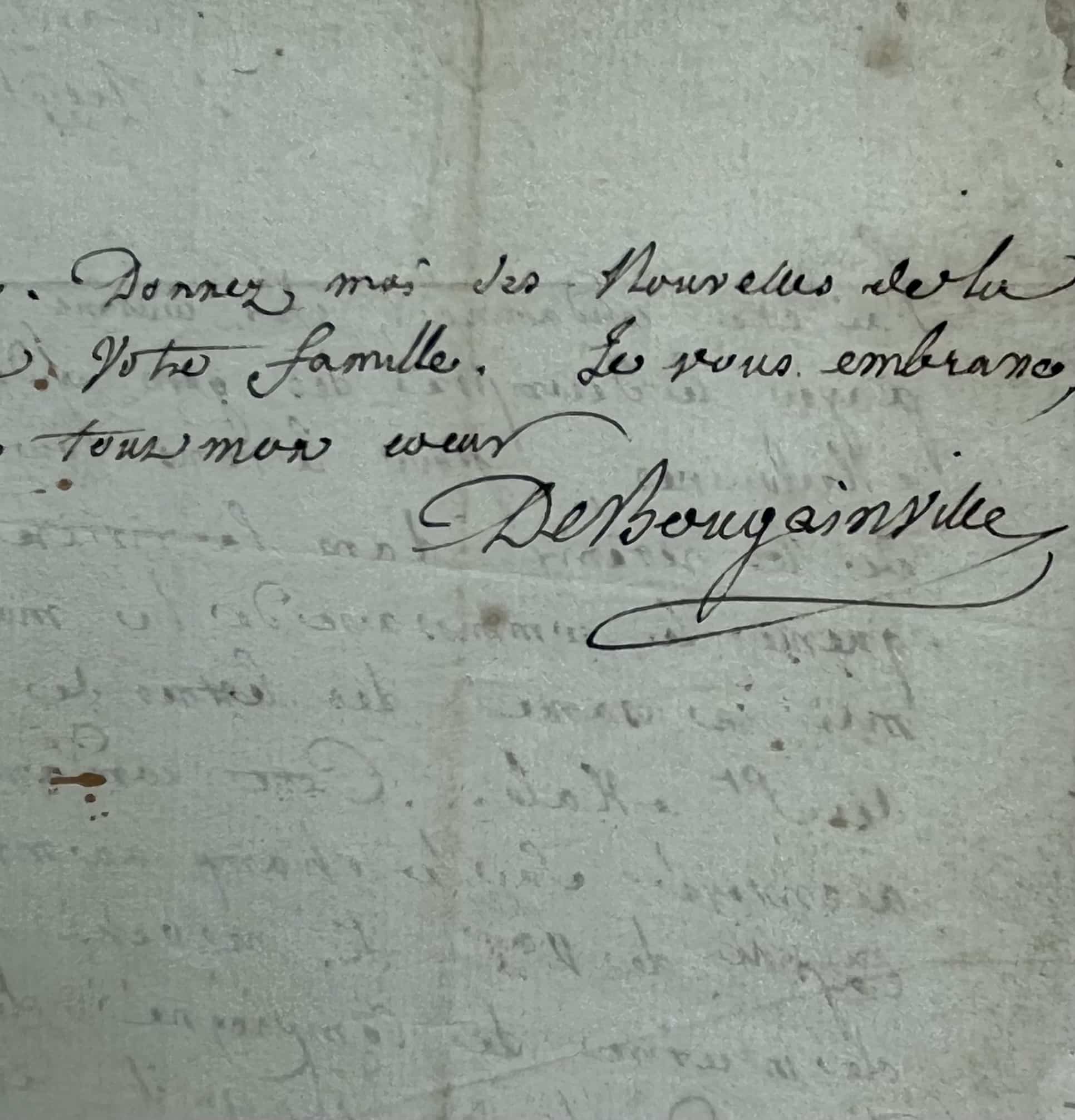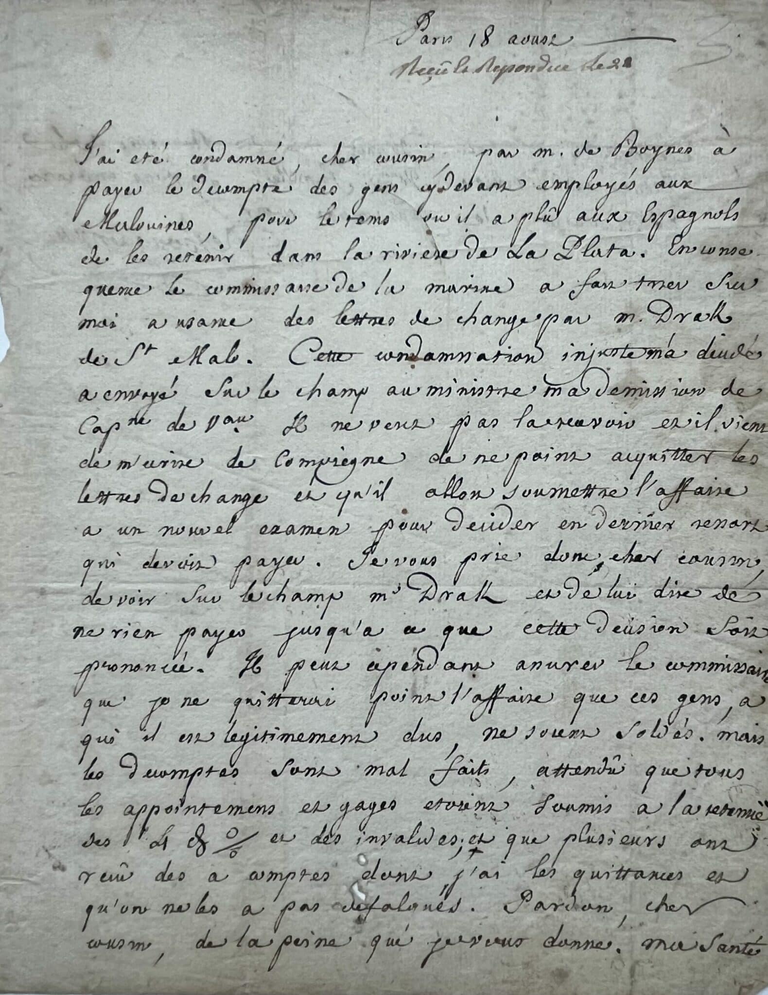 "J'ai été condamné, cher cousin, par M. de Boynes [Pierre Étienne Bourgeois de Boynes (- secrétaire d'État à la Marine de Louis XV de 1771 à 1774] à payer le décompte des gens cydevant employés aux Malouines, pour le tems ou il a plû aux Espagnols de les retenir dans la rivière de La Plata [entre l'Uruguay et l'Argentine]. En consequence le commissaire de la marine a fait tirer sur moi a [?] des lettres de change par M. Drak de St Malo. Cette condamnation injuste m'a décidé a envoyer sur le champ au ministre ma demission de Capne de Vau. Il ne veut pas la recevoir et il vient de m'ecrire de Compiegne de ne point acquitter les lettres de change et qu'il allait soumettre l'affaire à un nouvel examen pour décider en dernier ressort qui devoit payer. Je vous prie donc, cher cousin, de voir sur le champ M. Drak et de lui dire de ne rien payer jusqu'à ce que cette decision soit prononcée. Je peux cependant assurer le commissaire que je ne quitterai point l'affaire que ces gens, à qui il est légitimement dus, ne soient soldés. Mais les decomptes sont mal faits, attendû que tous les appointemens et gages etoient soumis a la retenüe des 4 % et des invalides ;  et que plusieurs ont recû des acomptes dont j'ai les quittances et qu'une ne les a pas defalqués. Pardon, cher cousin, de la peine que je vous donne. Ma santé se retablit peu à peu. Donnez moi des nouvelles de la votre et de toute votre famille. Je vous embrasse, cher cousin, de tout mon coeur. De Bougainville".