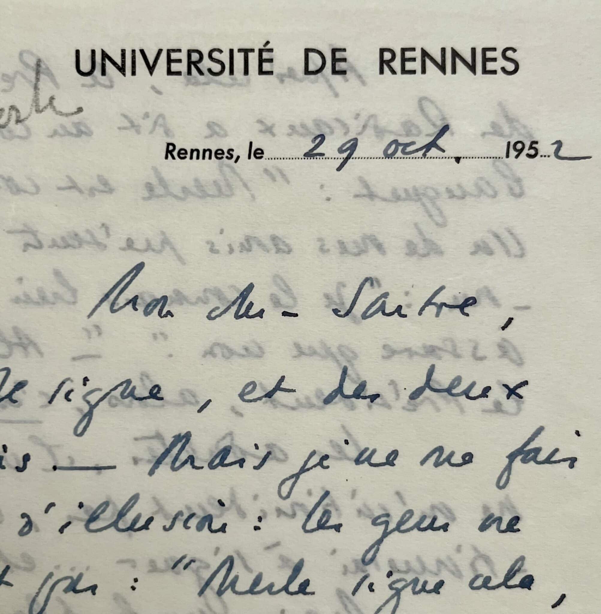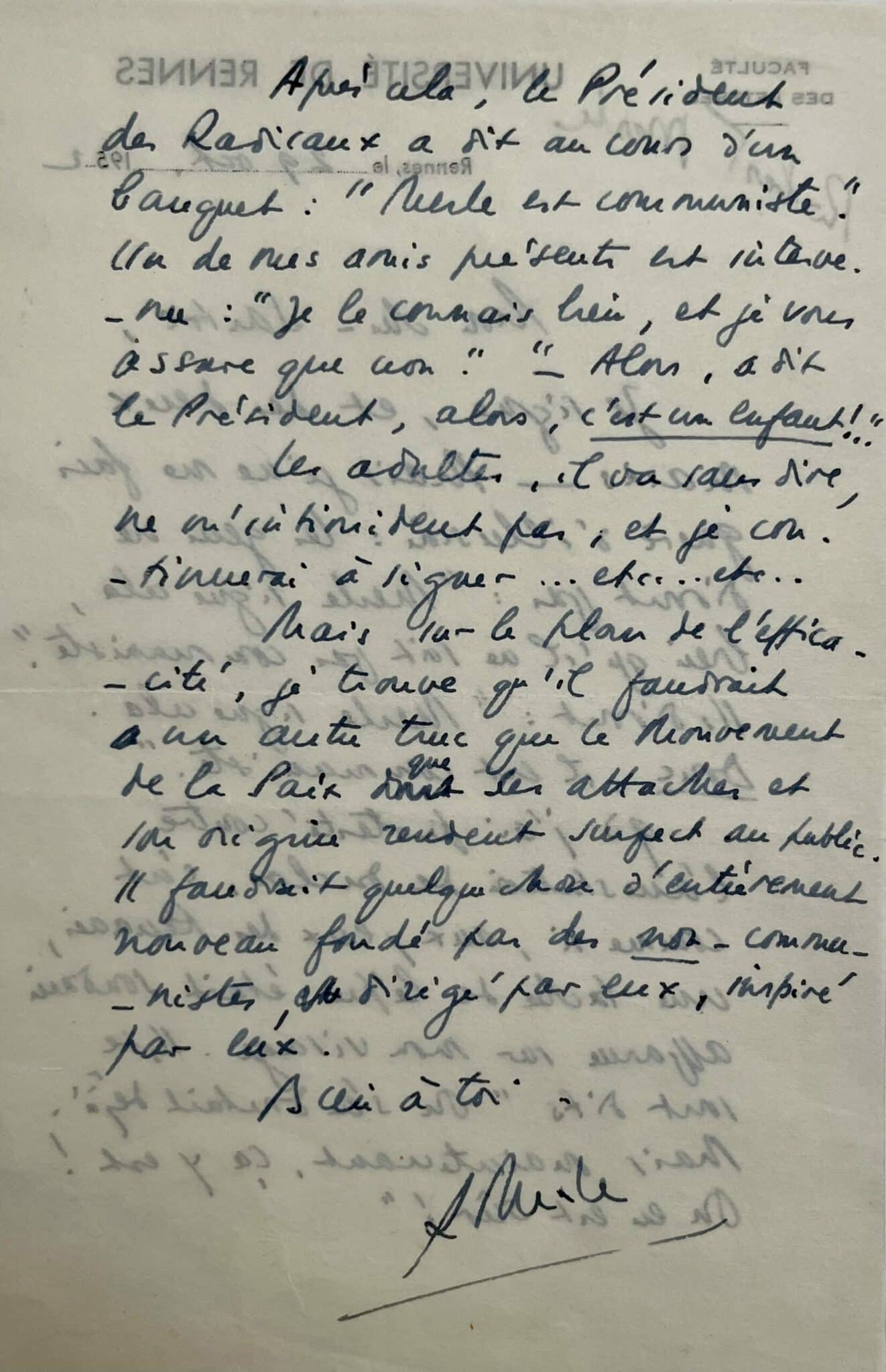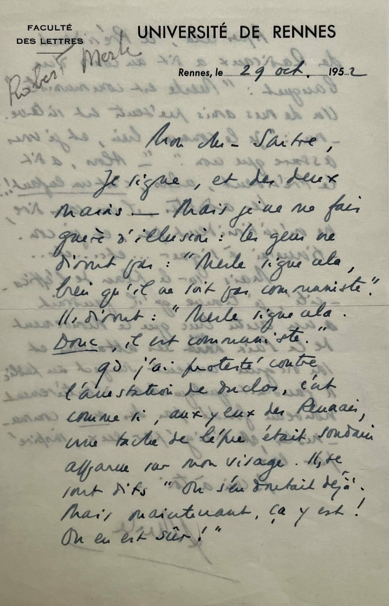 Robert Merle (Tébessa, 1908/2004)"Mon cher Sartre. Je signe, et des deux mains. Mais je ne me fais guère d’illusion : les gens ne diront pas : « Merle signe cela, bien qu’il ne soit pas communiste ». Ils diront : « Merle signe cela donc, il est communiste. » Qd j’ai protesté contre l’arrestation de Duclos [le dirigeant communiste Jacques Duclos en 1952], c’est comme si, aux yeux des Rennais, une tache de lèpre était soudain apparue sur mon visage. Ils se sont dits « on s’en doutait déjà. Mais maintenant, ça y est ! On n’en est sûr ! » Après cela, le Président des radicaux a dit au cours d’un banquet : « Merle est communiste ». Un de mes amis présents est intervenu : « Je le connais bien, et je vous assure que non ». « Alors, a dit le président, alors, c’est un enfant !" Les adultes, il va sans dire, ne m’intimident pas, et je continuerai à signer… Etc.… Etc.… Mais sur le plan de l’efficacité, je trouve qu’il faudrait un autre truc que le Mouvement de la Paix que ses attaches et son origine rendent suspect au public. Il faudrait quelque chose d'entièrement nouveau fondé par des non-communistes, dirigé par eux, inspiré par eux. Bien à toi, R. Merle".