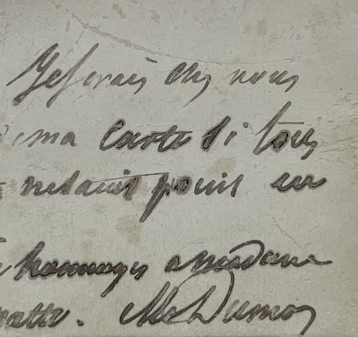 "Mon cher. Je serais chez vous au lieu de ma carte si tous mes effets n'étaient point en Douane. Tous mes hommages à Madame Croix de Malte. Al. Dumas".