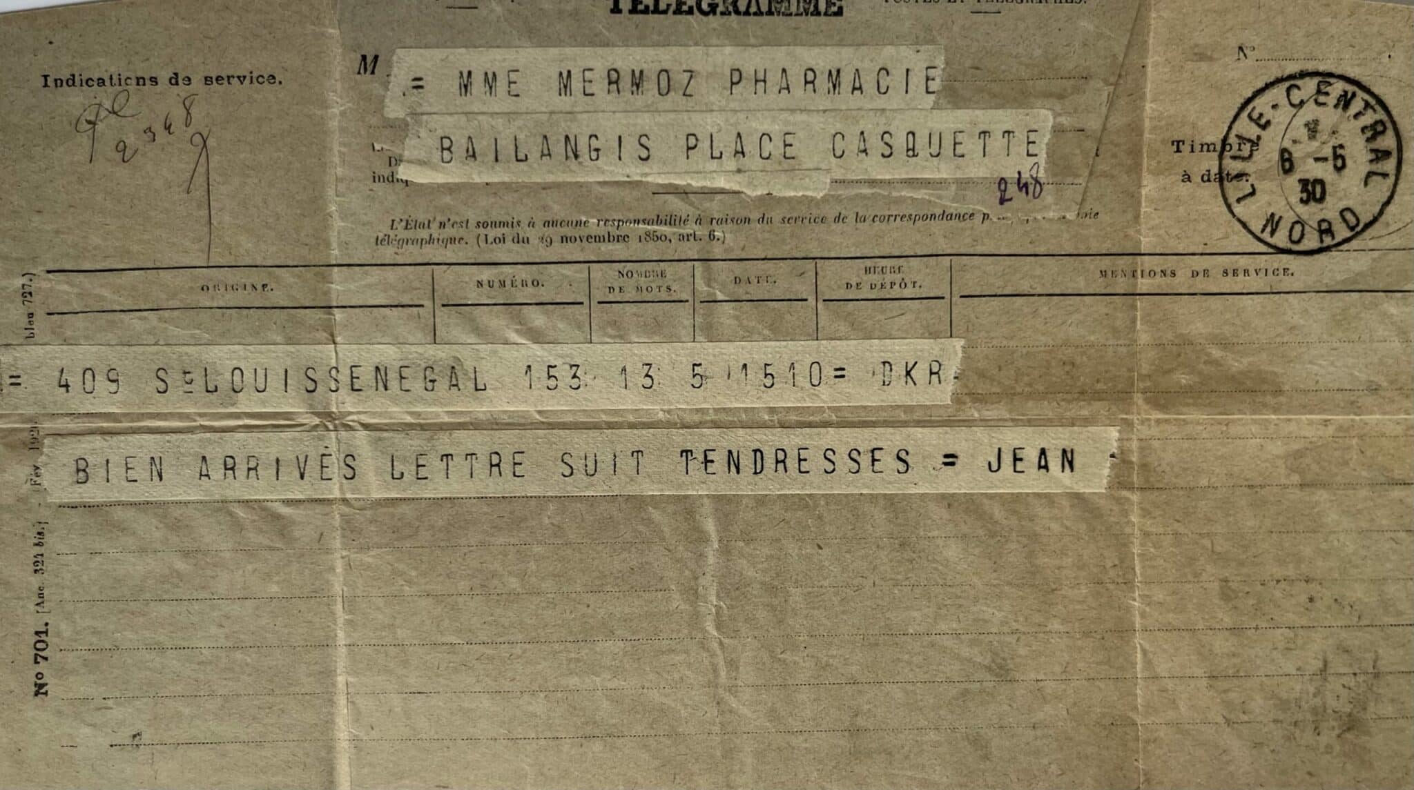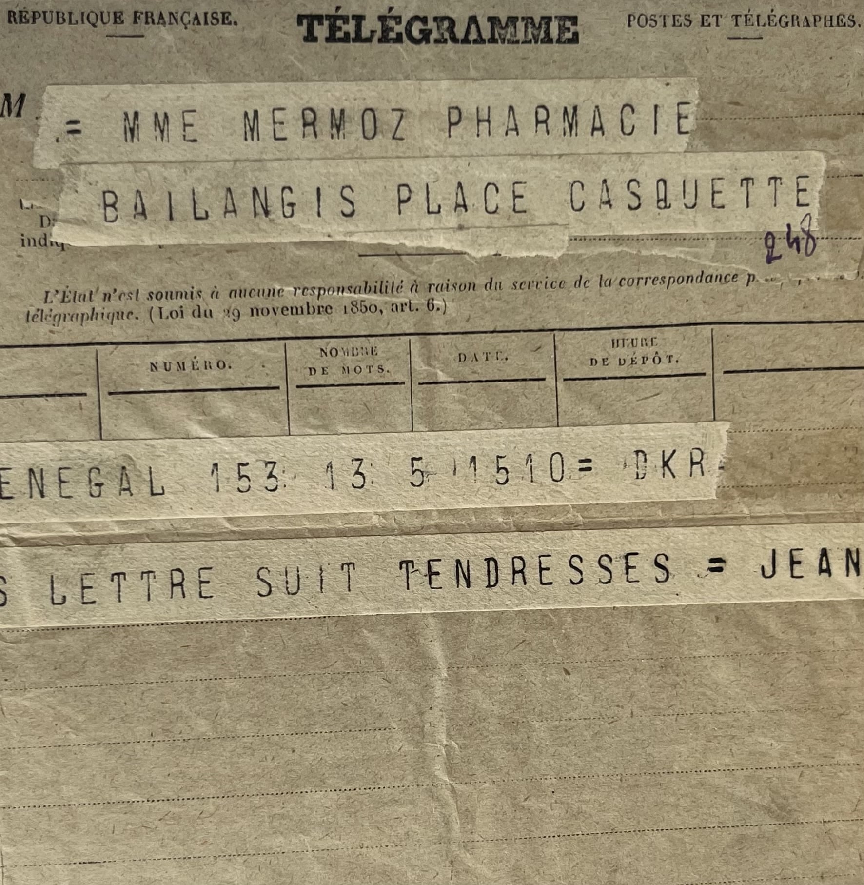 Télégramme de Jean Mermoz à sa mère, du Sénégal, à la veille d’ouvrir la première voie postale vers le Brésil