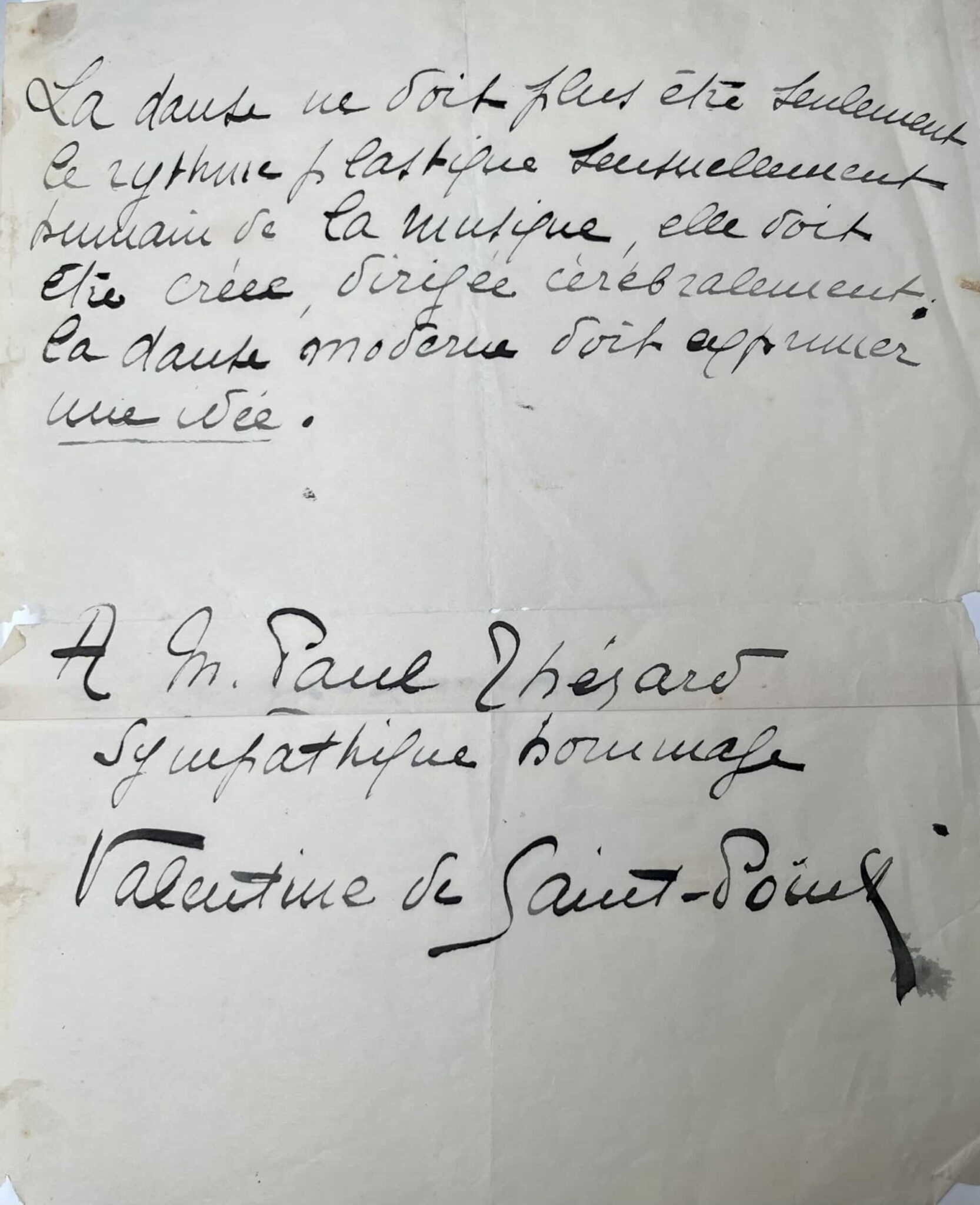 Valentine de Saint-Point (Lyon , 1875 /1953)"La danse ne doit plus être seulement le rythme plastique sensuellement humain de la musique, elle doit être crée, dirigée cérébralement. La danse moderne doit exprimer une idée".