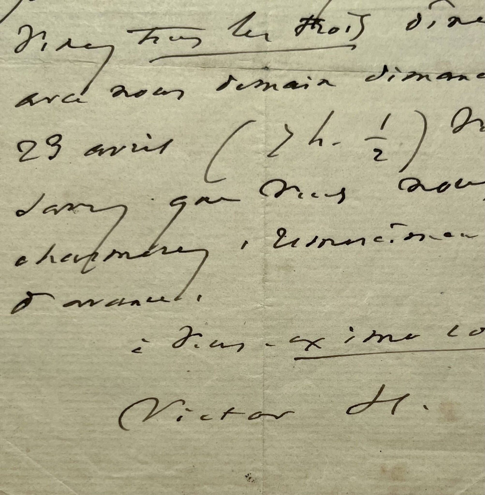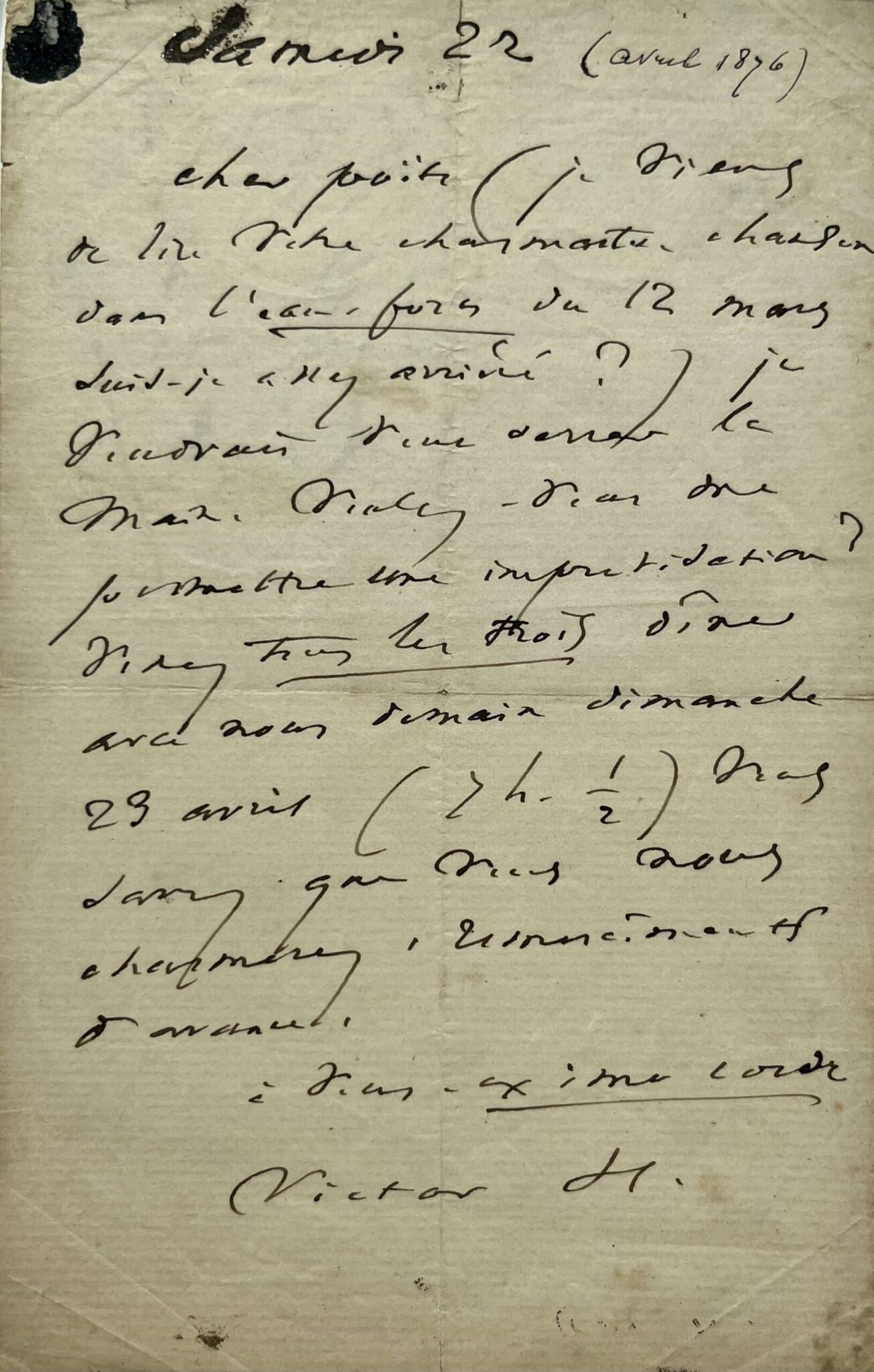 "Cher poëte (je viens de lire votre charmante chanson dans L'eau-forte [Paris à l'eau-forte] du 12 mars. Suis-je assez arriéré ?). Je voudrais vous serrer la main. Voulez-vous me permettre une improvisation ? Venez tous les trois dîner avec nous demain dimanche 23 avril (7h. 1/2). Vous savez que vous nous charmerez, remerciements d'avance, à vous. Ex imo corde [du fond de mon coeur]. Victor H.".