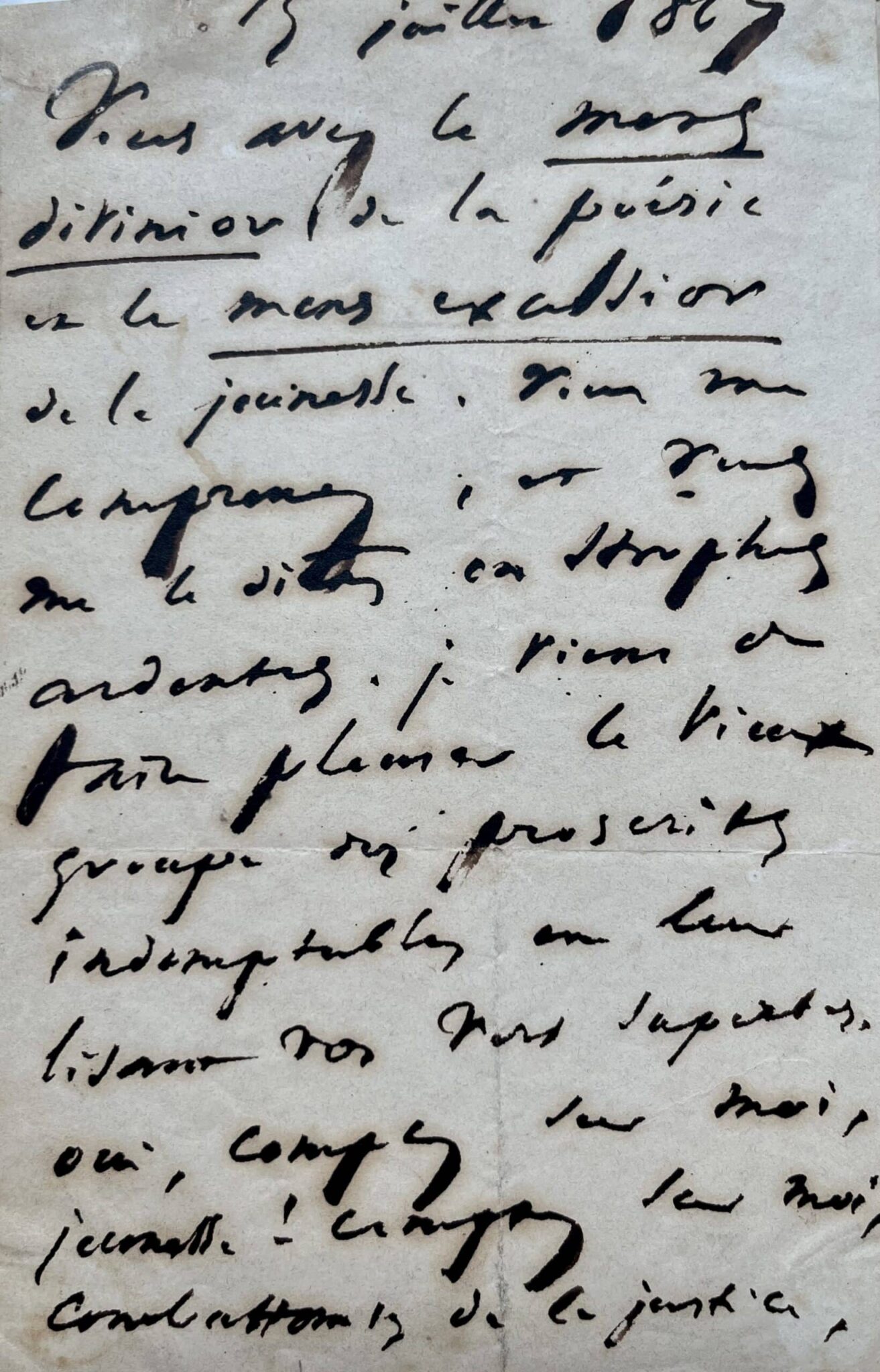 "Vous avez le mens divinior de la poésie et le mens excelsior de la jeunesse. Vous me comprenez ; et vous le dites en strophes ardentes. Je viens de faire pleurer le vieux groupe des proscrits indomptables en leur lisant vos vers superbes. Oui, comptez sur moi, jeunesse ! Comptez sur moi, combattants de la justice, de la liberté et de l'idéal. Vous, jeune homme, vous, poète, vous êtes une âme haute et tendre. Vous avez la fière douceur des prêtres du vrai et des soldats du beau. Je suis heureux d'être et de rester en exil pour des hommes tels que vous. Je vous aime. Victor Hugo".